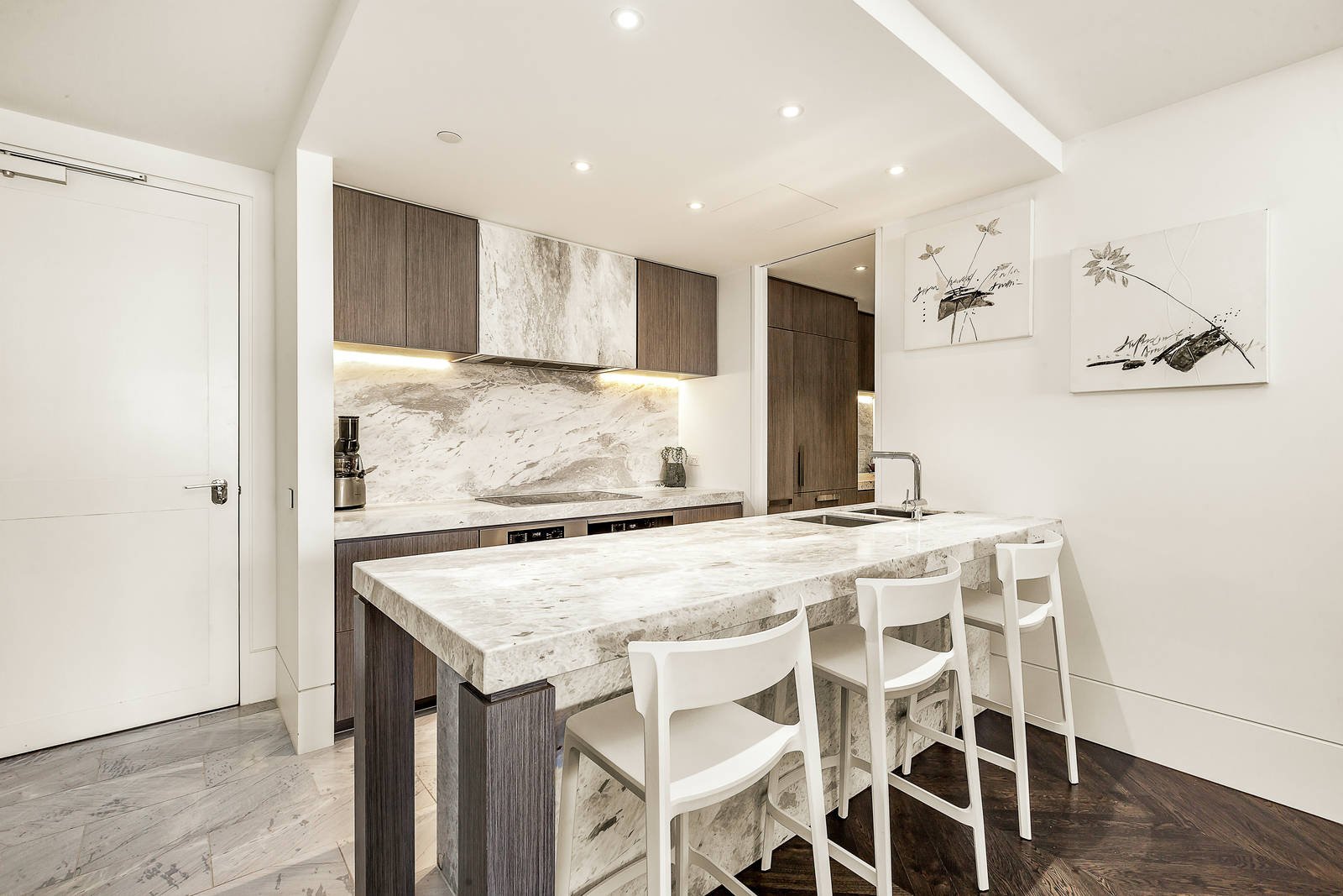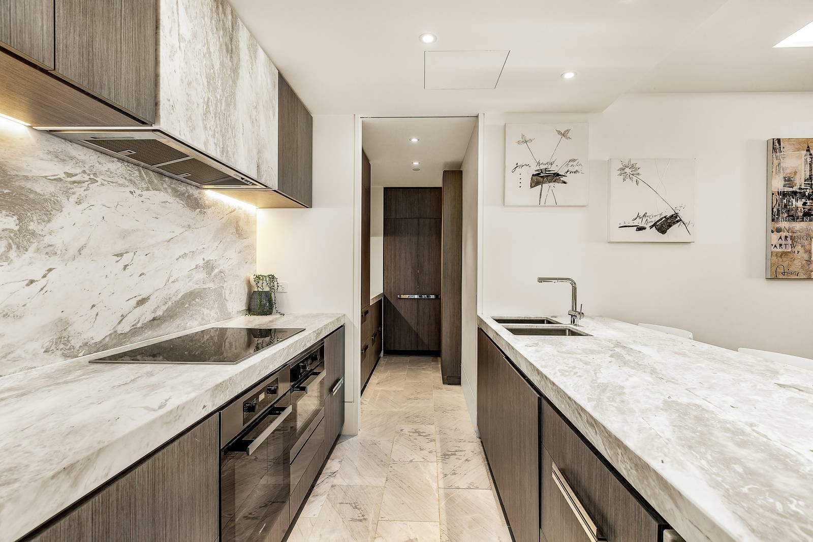 Displaying contemporary refinement at its best, the superbly proportioned open plan living and dining room features dark oak parquetry floors and recessed ceilings and lighting. The sublime marble kitchen is appointed with Miele appliances, integrated Liebherr fridge/freezer and a butler's pantry. A versatile retreat/home office or guest bedroom with a fold out queen size bed is cleverly separated from the living area with bi-fold doors. The living spaces open to a large covered terrace, an ideal space for outdoor dining. The gorgeous main bedroom with deluxe walk in robe and lavish marble en suite is matched by a second bedroom with loads of built in robes, two stylish bathrooms and a fitted study nook.