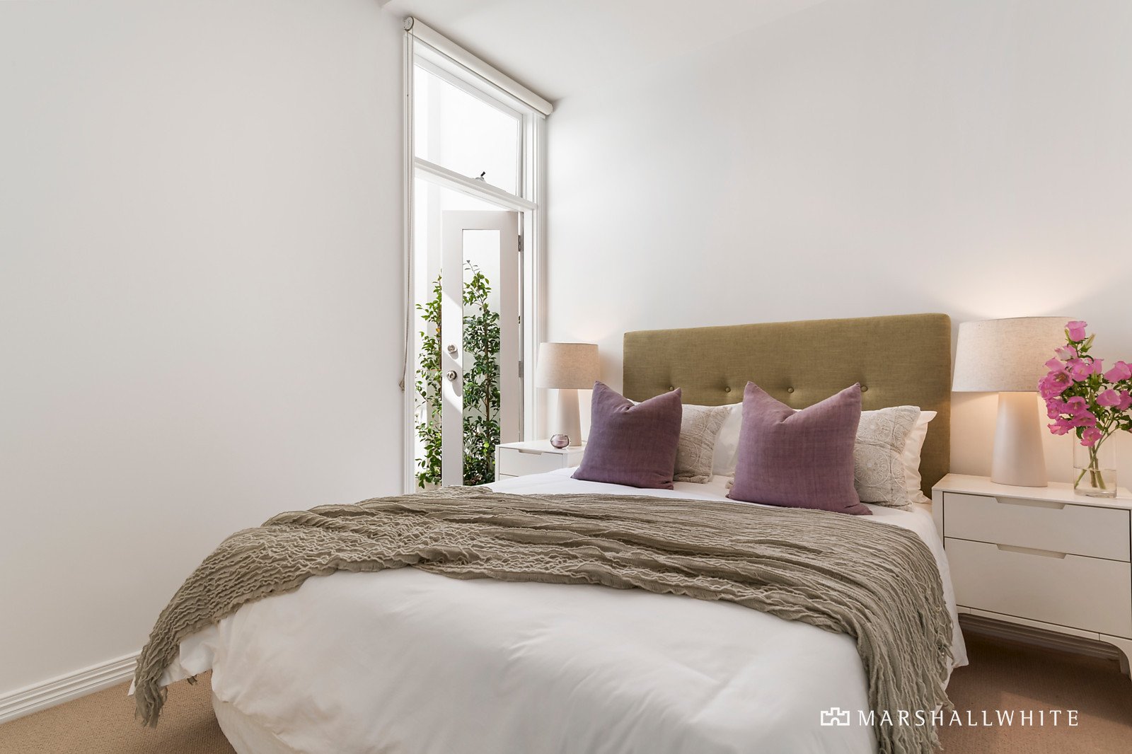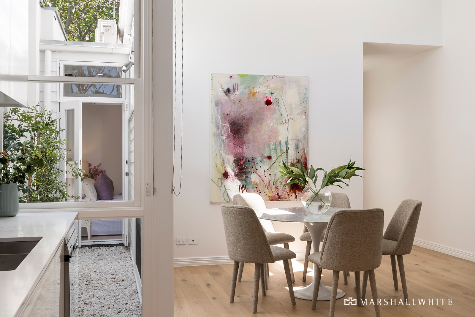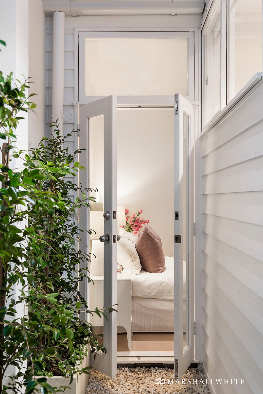 Designed with those seeking a cosmopolitan inner city base or elegant downsizer in mind, it features the highest quality finishes & features. Oak floors add contemporary refinement to the wide light filled entrance hall and expansive open plan living and dining room beneath 4.6m vaulted ceilings with clerestory windows and a sleek ultra-stylish Caesarstone kitchen overlooking two outdoor living areas. The living room opens out to a private paved west-facing garden, ideal for entertaining, with a gate to the rear lane offering easy access to the beach. 4.6m vaulted ceilings accentuate the sense of space in both bedrooms, both of which have built in robes. The main bedroom features french doors onto a pretty courtyard, whilst the second spacious bedroom looks out through plantation shutters to the tree lined street. Potential also exists to extend upstairs (STCA).