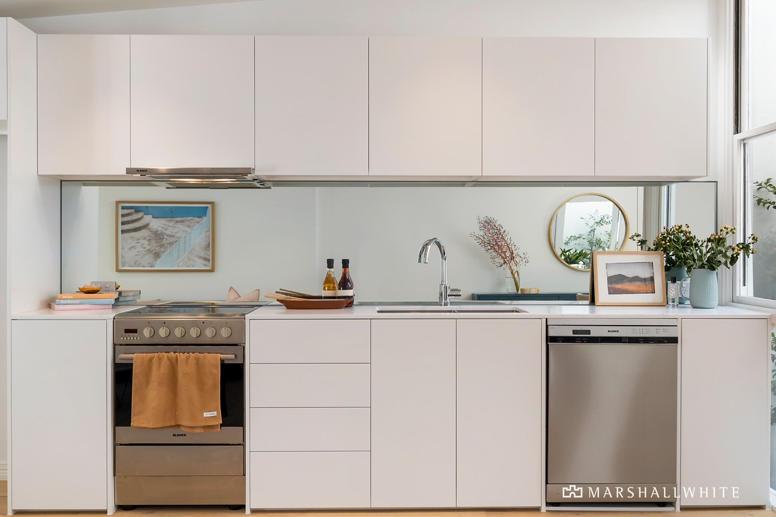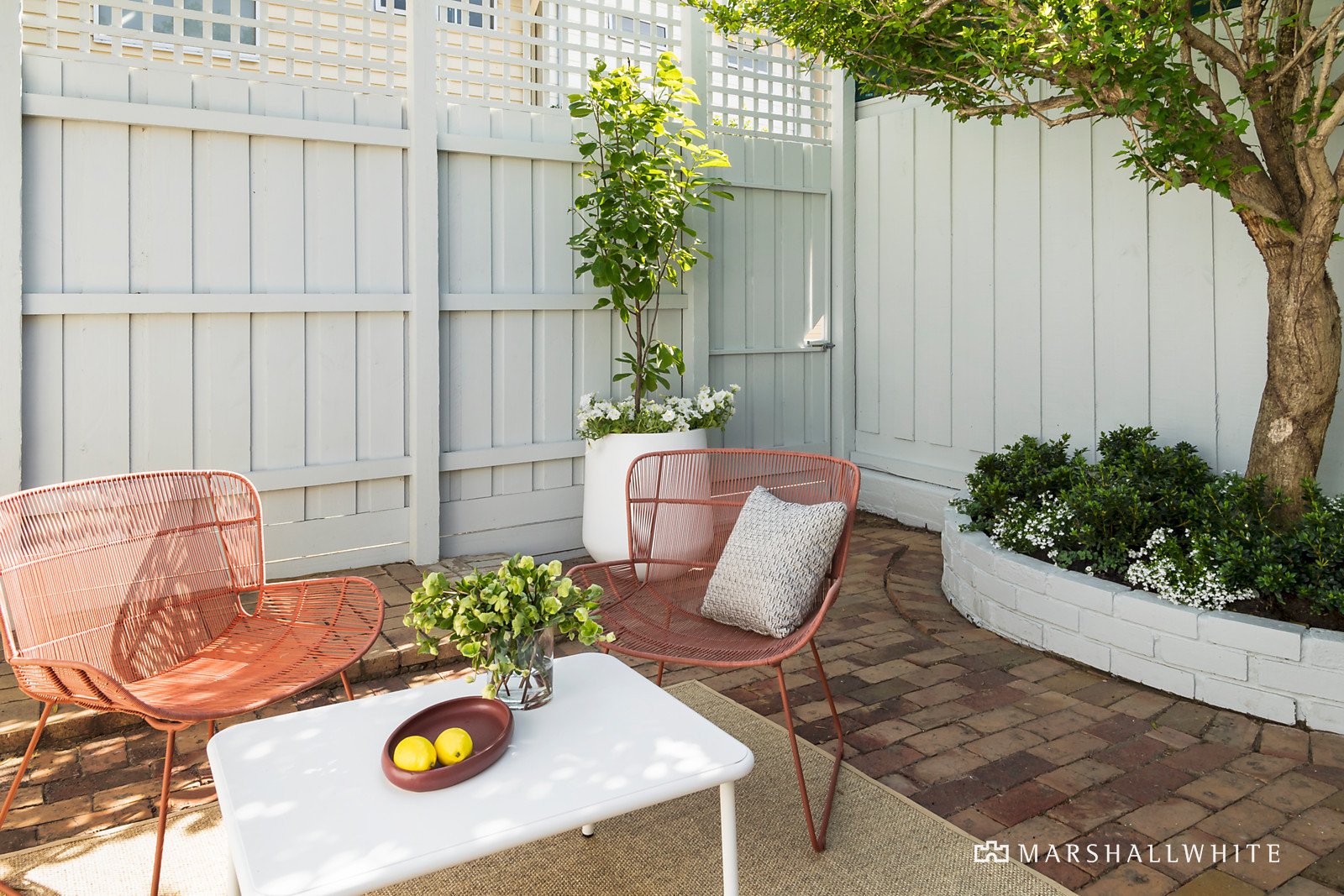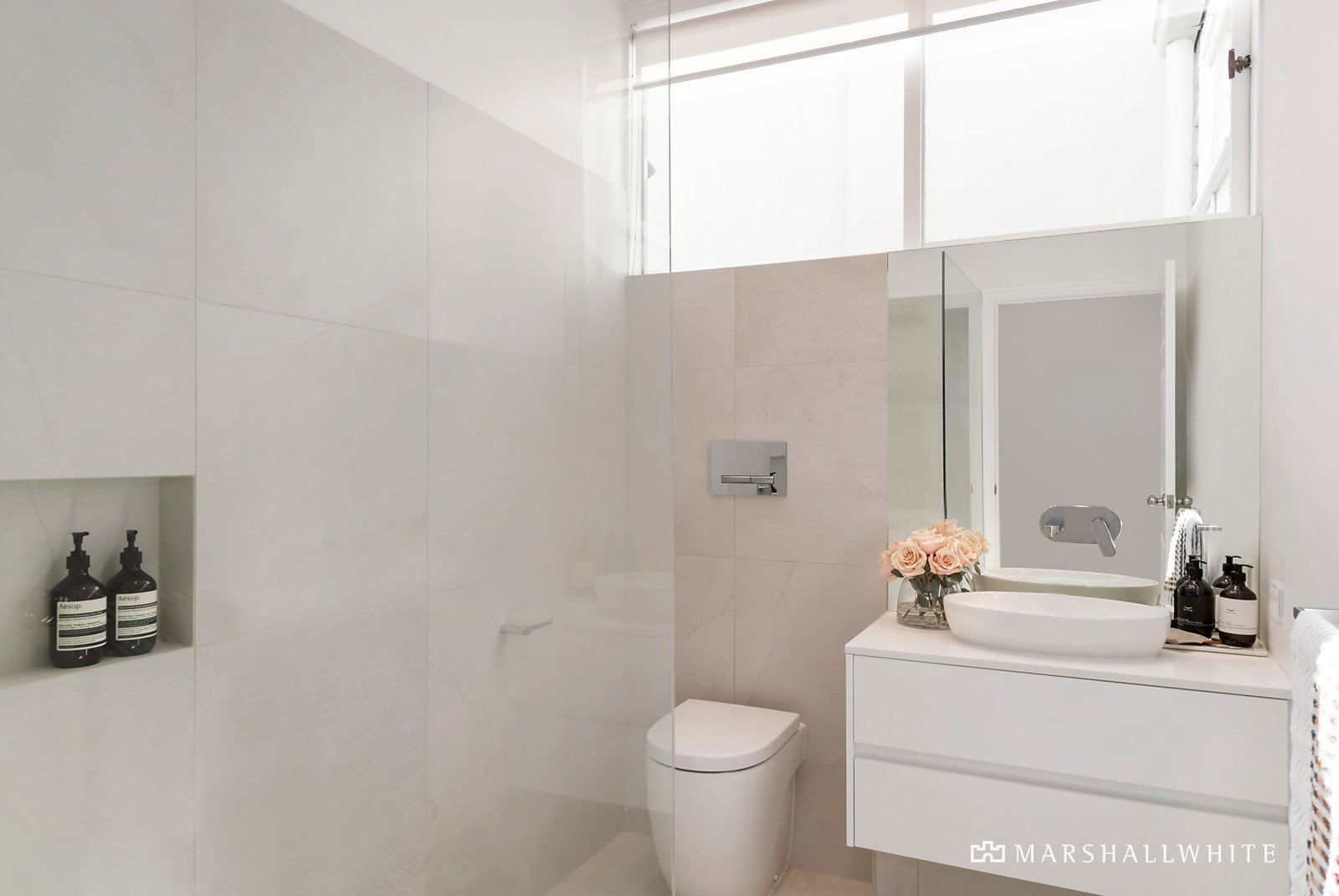 Designed with those seeking a cosmopolitan inner city base or elegant downsizer in mind, it features the highest quality finishes & features. Oak floors add contemporary refinement to the wide light filled entrance hall and expansive open plan living and dining room beneath 4.6m vaulted ceilings with clerestory windows and a sleek ultra-stylish Caesarstone kitchen overlooking two outdoor living areas. The living room opens out to a private paved west-facing garden, ideal for entertaining, with a gate to the rear lane offering easy access to the beach. 4.6m vaulted ceilings accentuate the sense of space in both bedrooms, both of which have built in robes. The main bedroom features french doors onto a pretty courtyard, whilst the second spacious bedroom looks out through plantation shutters to the tree lined street. Potential also exists to extend upstairs (STCA).