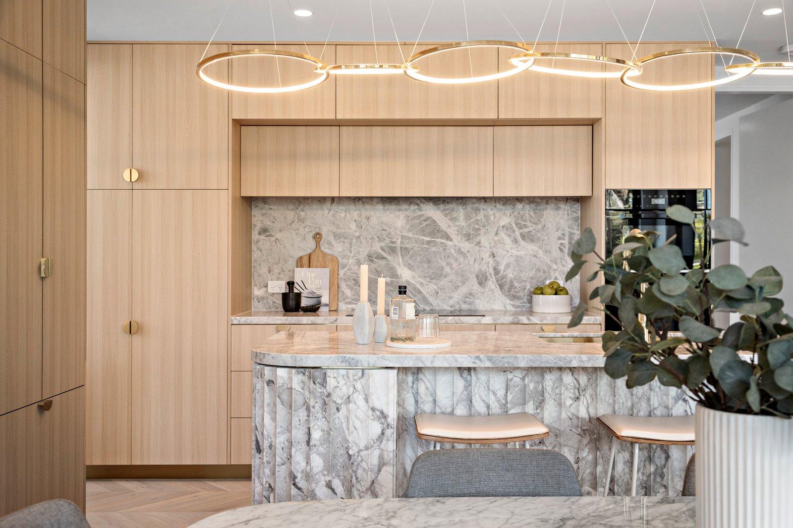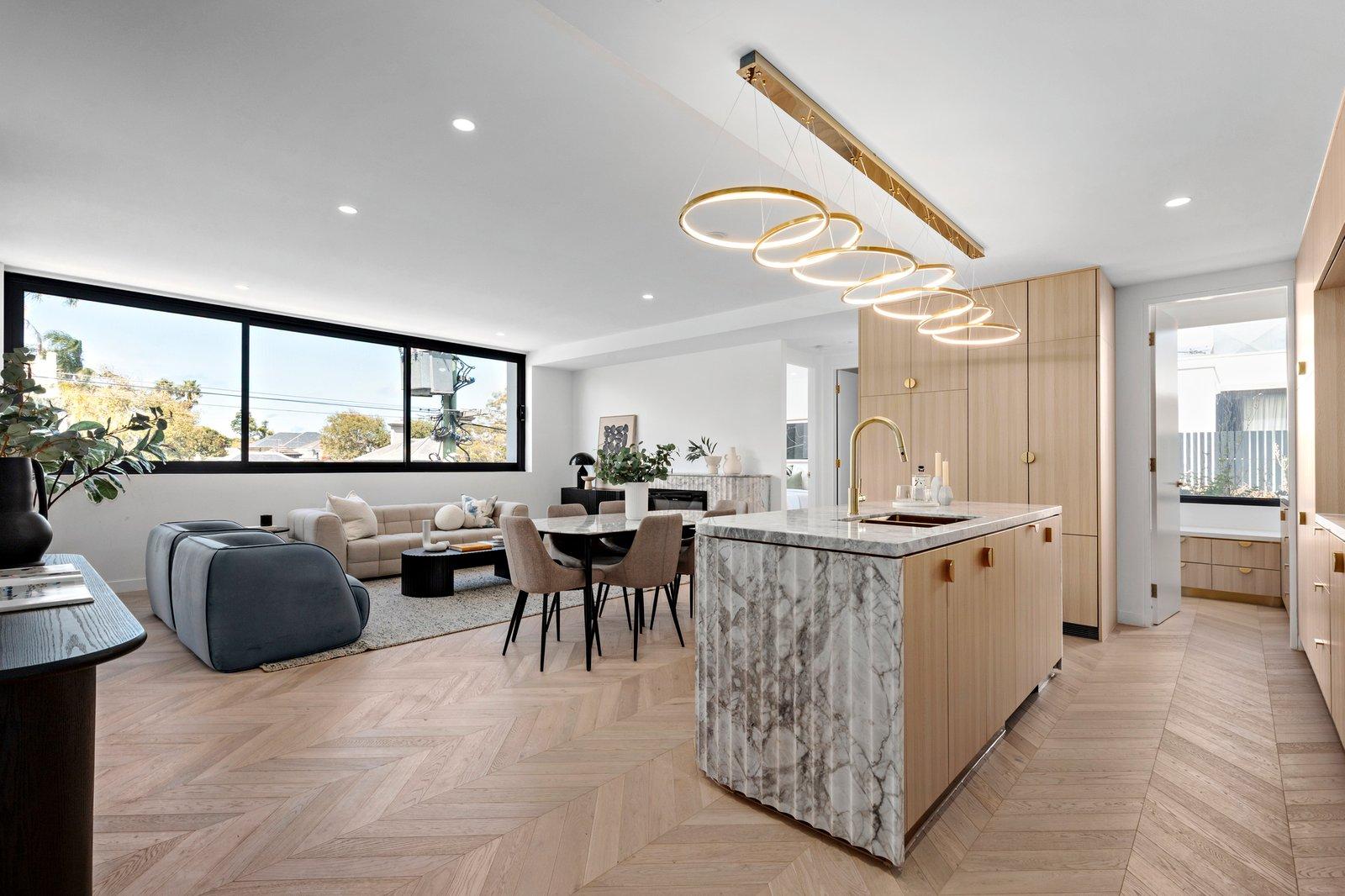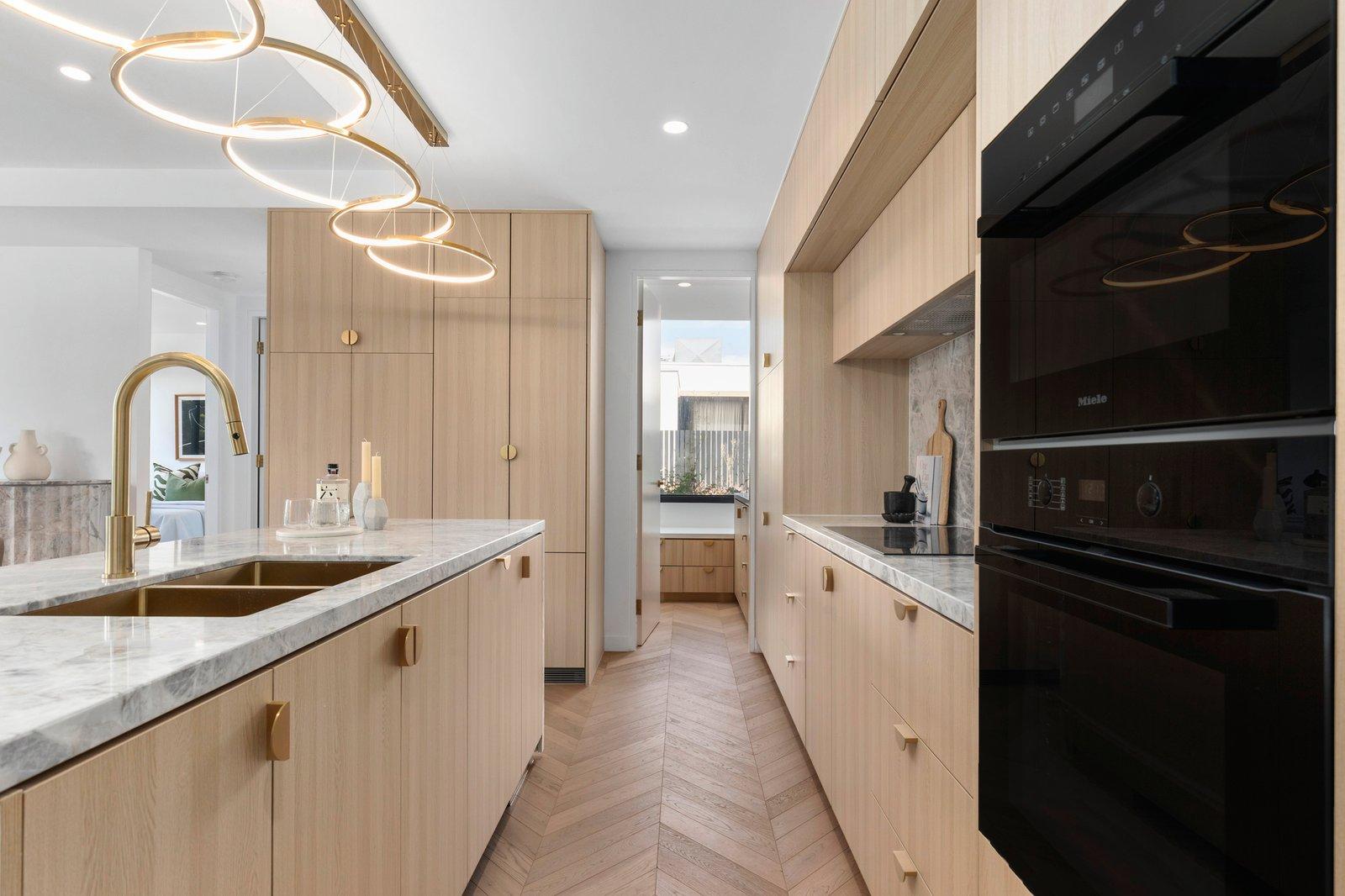 European Oak parquetry flooring sweeps through the single-level layout, showcasing a spacious open-plan living and entertaining area harmonised with honed Arrebescato marble, limed-oak veneered joinery, floor-to-ceiling glass, and curated lighting. Floor-to-ceiling glass sliding doors open from a bedroom and the living area, with electric pebble flame heater in fluted marble surrounds, to the easterly facing undercover alfresco terrace - perfect for enjoying morning coffee with a delightful, elevated outlook towards the grounds of Billilla further enhanced by pair of elegant neighbouring landmark Victorian homes fringed with towering palms. Defined by a curvaceous fluted island bench illuminated by a gold-framed LED pendant of intertwined rings, the showstopping kitchen is equipped with a Miele induction cooktop, a pyrolytic convection oven, a Speed oven, and integrated dishwasher, plus there is a Fisher & Paykel integrated fridge/freezer, and a walk-in preparation pantry. Lavishly appointed with marble tiles, champagne gold tapware, and designer lighting, the apartment’s two bathrooms, and powder room, offer sublime sanctuary spaces. Additional features include master suite with a fitted walk-in robe and ensuite, plush carpeting, central zoned heating/cooling, a full-size laundry, and app-operated smart home technology.