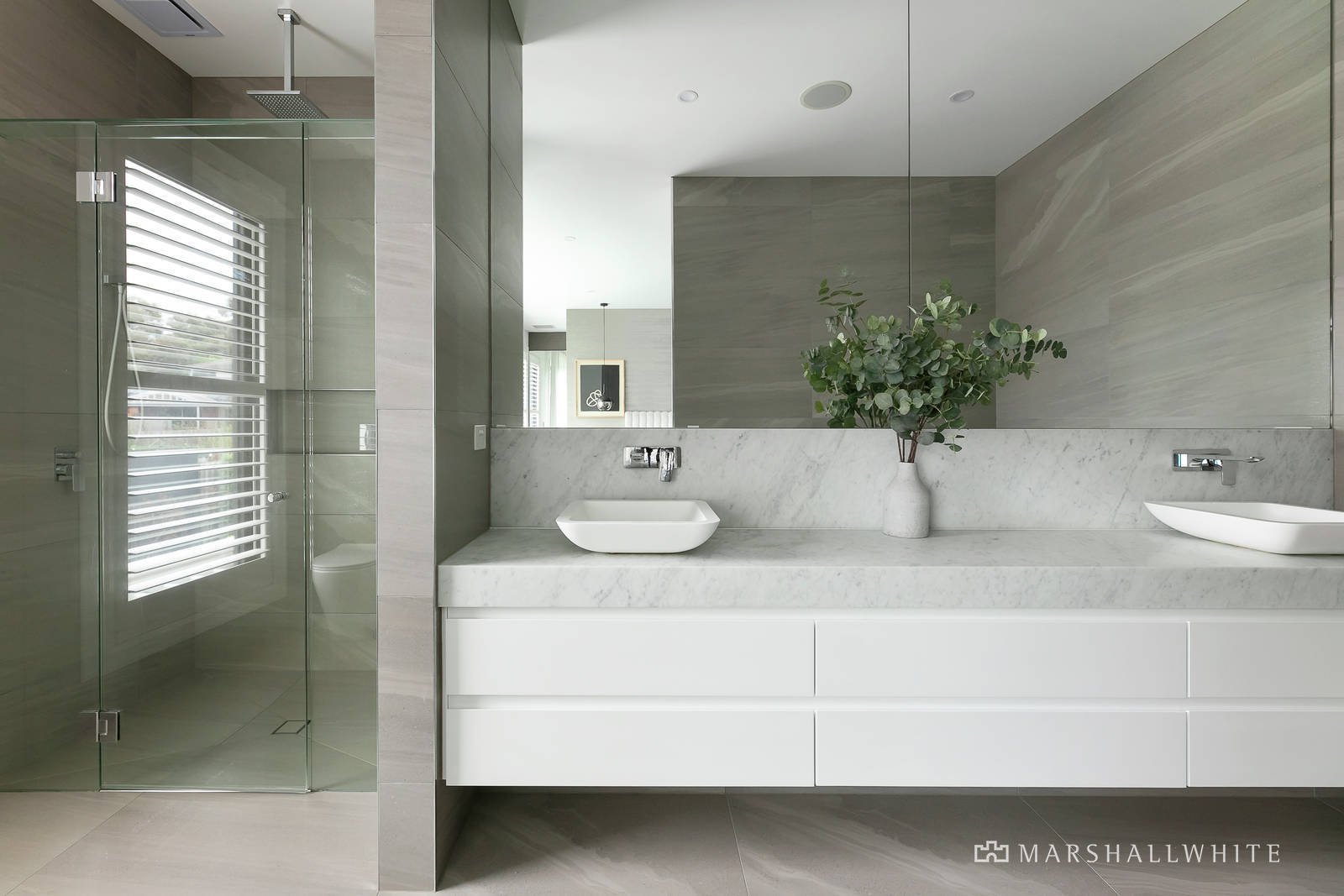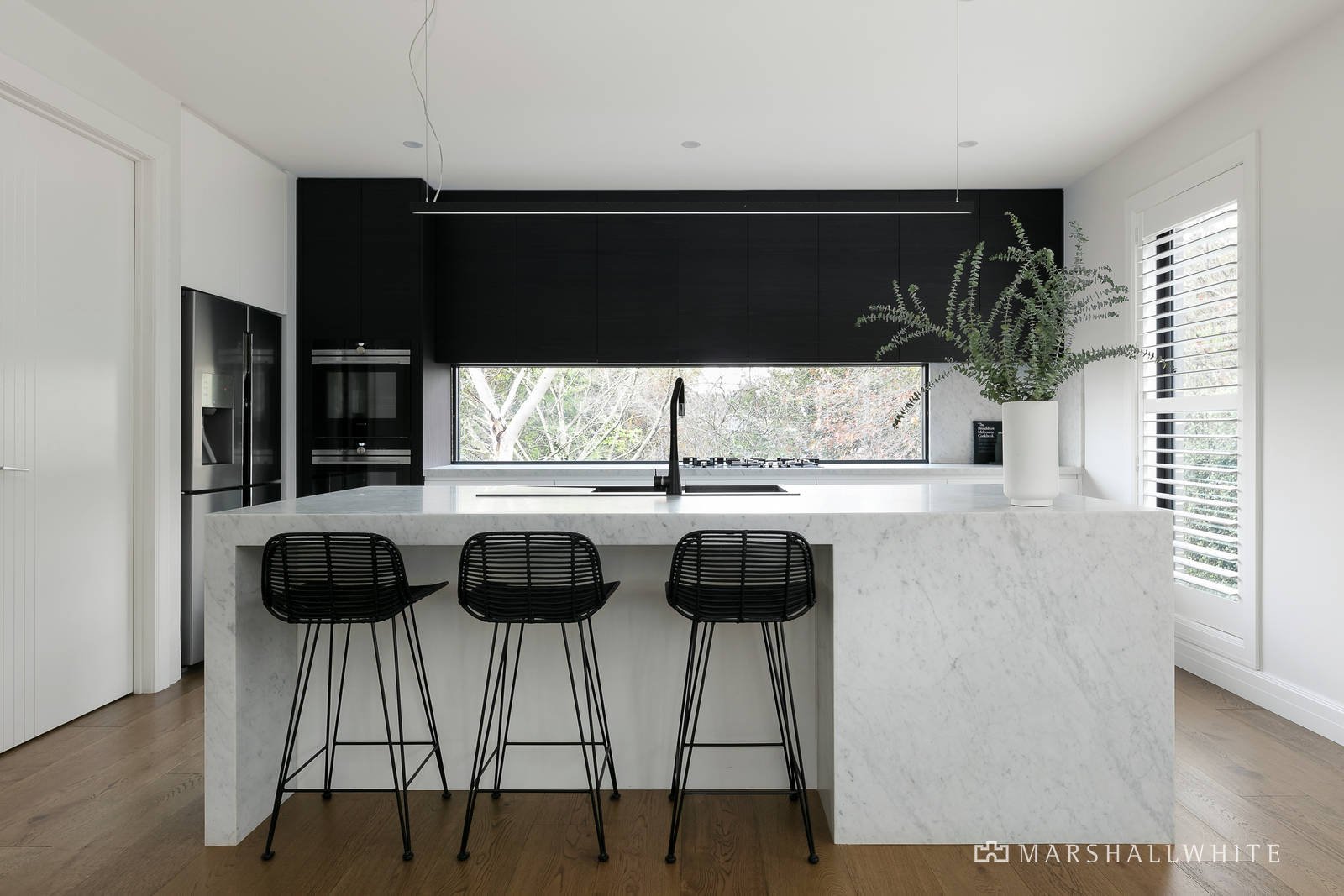 Palatial open-plan proportions are underpinned by a gourmet Italian marble kitchen that features an imposing waterfall-edged island bench that offers guests a terrific place to gather over a glass of wine while you prepare their meals on a suite of superior stainless-steel Siemens appliances. Effortlessly, the space flows outdoors to an undercover entertaining zone that enjoys glorious views, while basking in the natural light of its northern orientation.