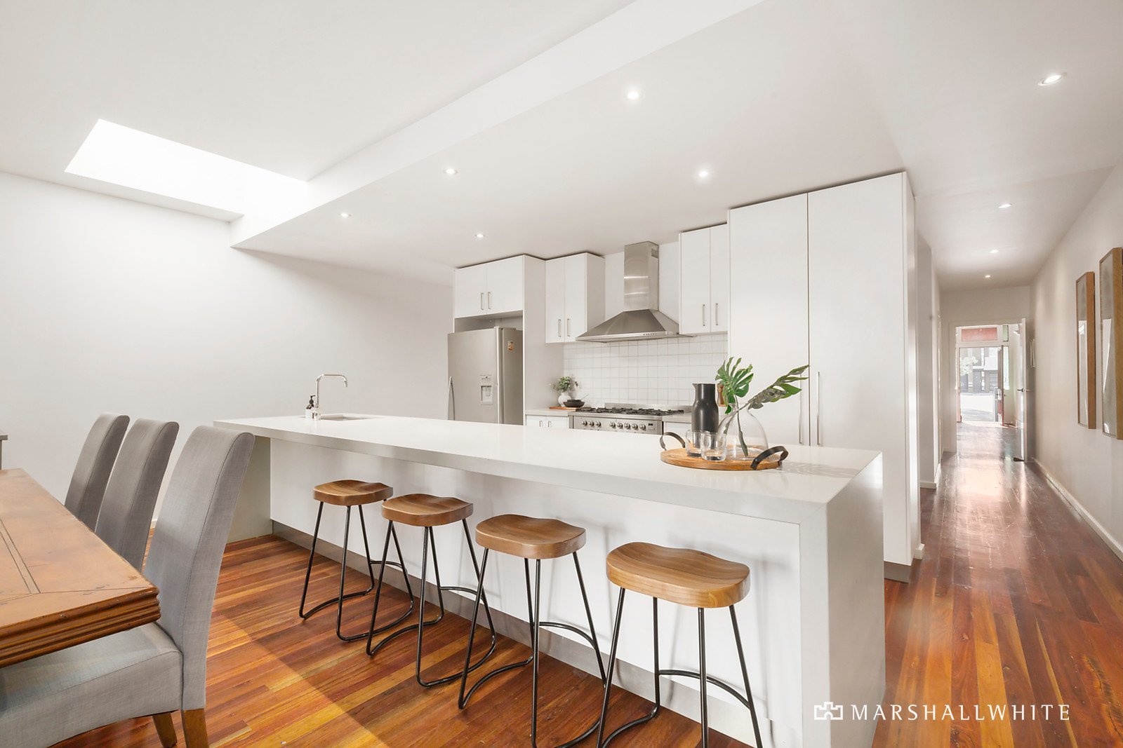 Defined by inspired designer style, exceptional proportions and an intelligent floor plan that will adapt to every family requirement, this impressively renovated 6.7m wide, solid brick Victorian residence is further advantaged by a deep private allotment (approx. 50m deep) with second frontage on Church Street for very easy vehicle access for two cars. Timber floors flow through the arched hall to a generous sitting or media room, gourmet kitchen boasting European appliances and stone benches and an exceptionally spacious living and dining room with a wood fire heater. Glass sliders open to a deep private decked garden shaded by a magnificent Canary Island Palm tree. At the end of the garden there is a double garage accessed from Church St. Generous family accommodation comprises two downstairs bedrooms with fireplaces and a stylish bathroom, and upstairs, the serene main bedroom with walk in/built in robes, a chic en suite and a 4th bedroom. Perfectly situated just a short walk to the beach, Bay St shops and restaurants, light rail and schools, it includes ducted heating, RC/air-conditioning, laundry and storage. Land size: 330sqm approx.
