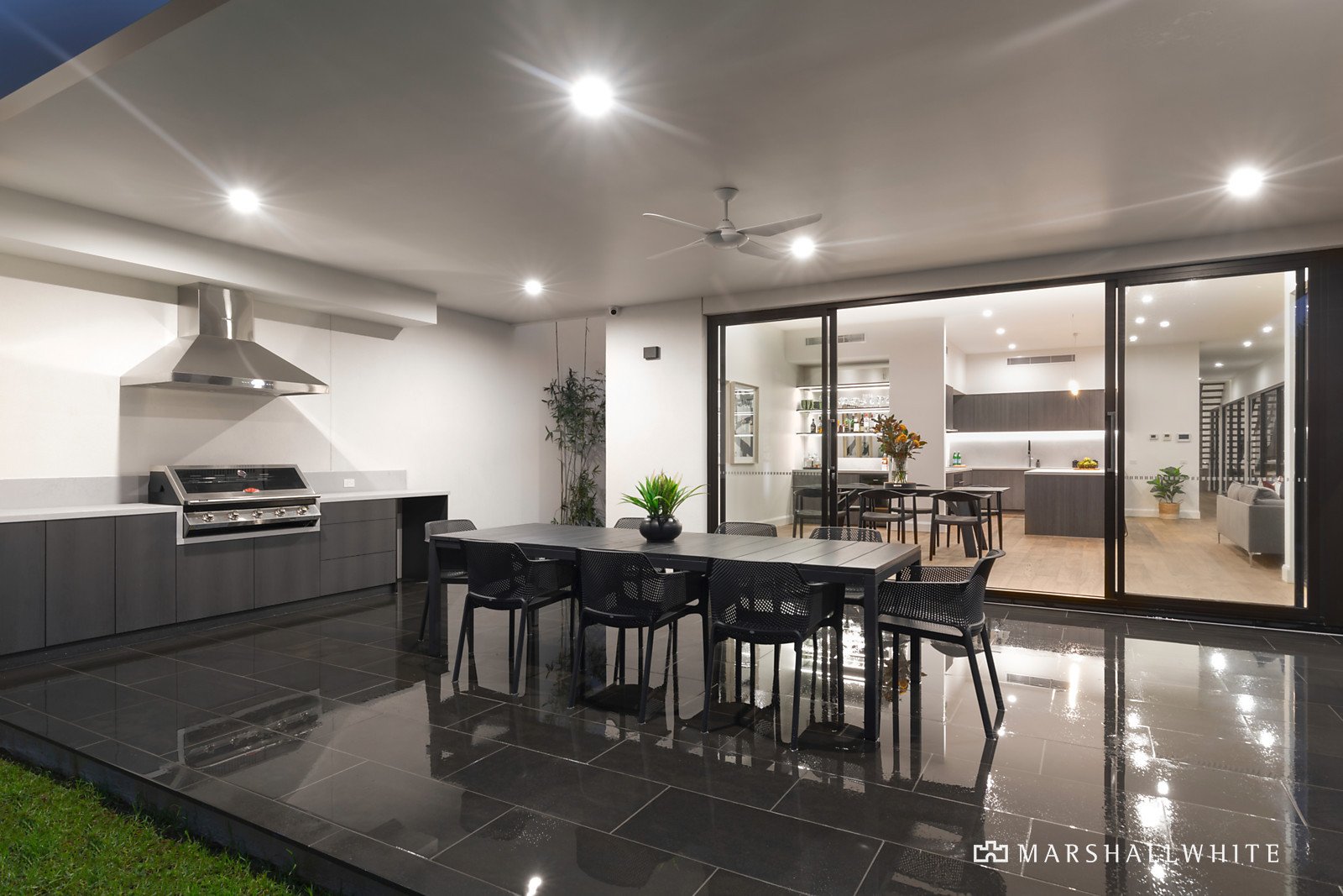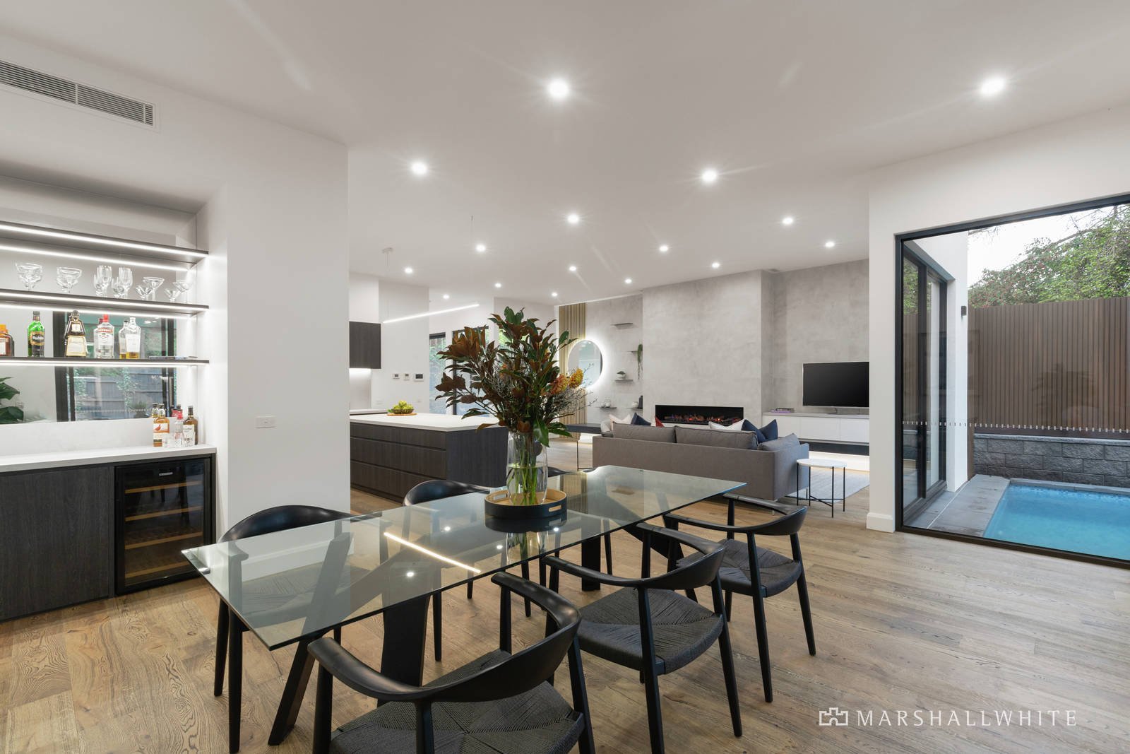 The home's centrepiece is its enormous open plan living/dining area with built-in entertainment wall and low-line gas/granite fireplace. It opens to the kitchen with premium stone benches, plentiful storage, a butler's pantry and full suite of Ilve appliances (including induction cooktop and integrated dishwasher). The dining room features a stylish bar with LED lighting and wine cooler.
