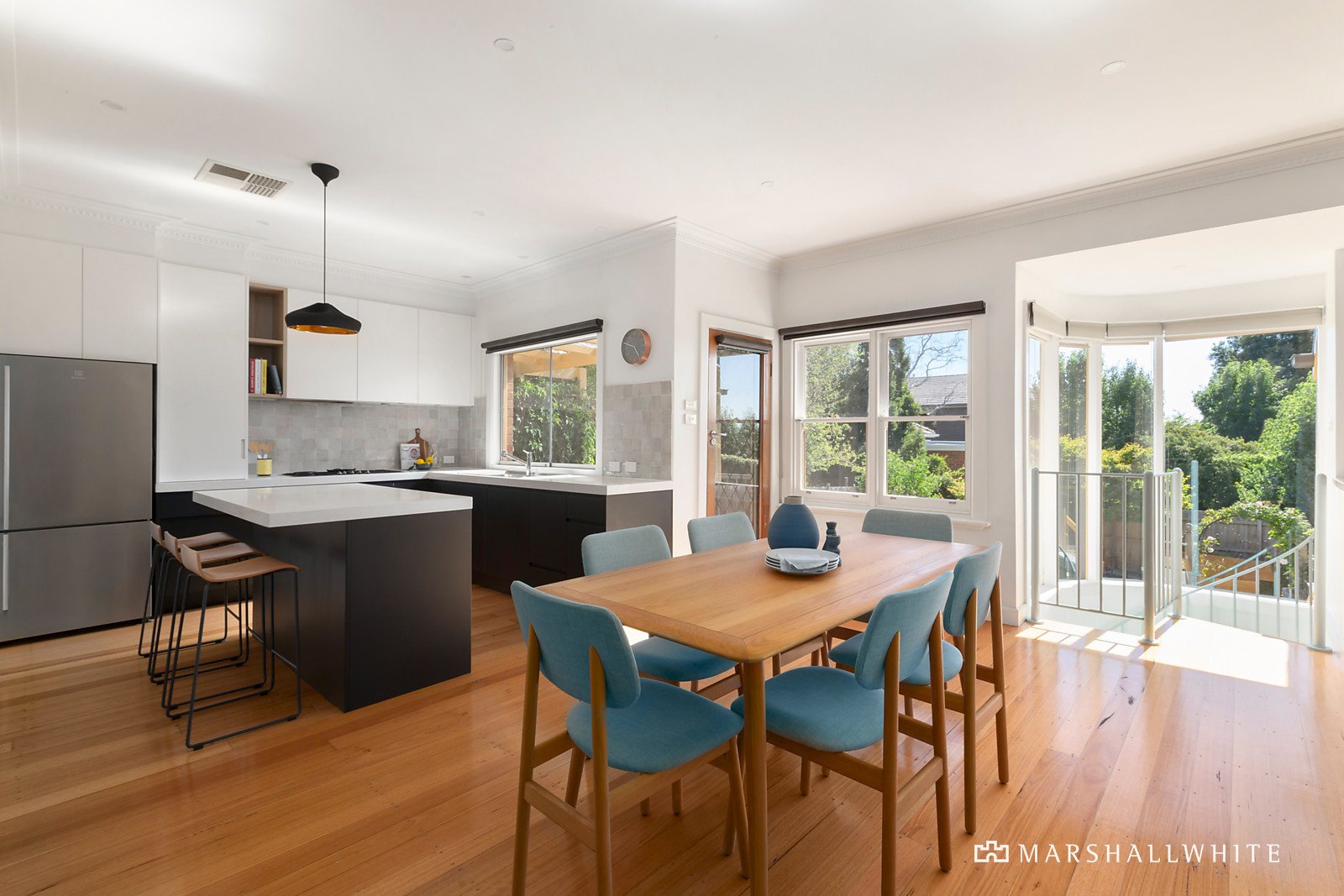 With consummate attention to detail, the original features including timber floors, high ceilings and large picture windows have been brilliantly enhanced and celebrated by the addition of contemporary style. The wide entrance hall introduces a generous sitting room or home office with a fireplace, a separate sun-drenched living room and an expansive dining area served by a superbly appointed gourmet kitchen with stone benches and Miele appliances. The dining area opens to a large deck overlooking the leafy garden. Three spacious bedrooms with built in robes and a deluxe bathroom are set apart from the lower-level main bedroom with designer en suite, built in robe and its own private northwest paved courtyard.