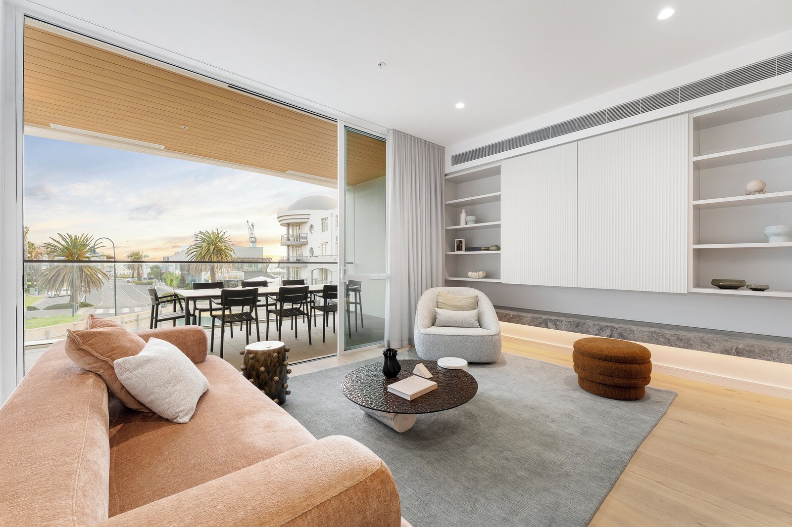 Crafted by Carr Design, the residences embody understated sophistication, timeless architecture, and a seamless connection between inside and out. Expansive living spaces are framed by floor-to-ceiling glazing, capturing uninterrupted views across Port Phillip Bay and the city skyline. Interiors are generous, refined, and designed for both relaxed beachside living and grand entertaining.