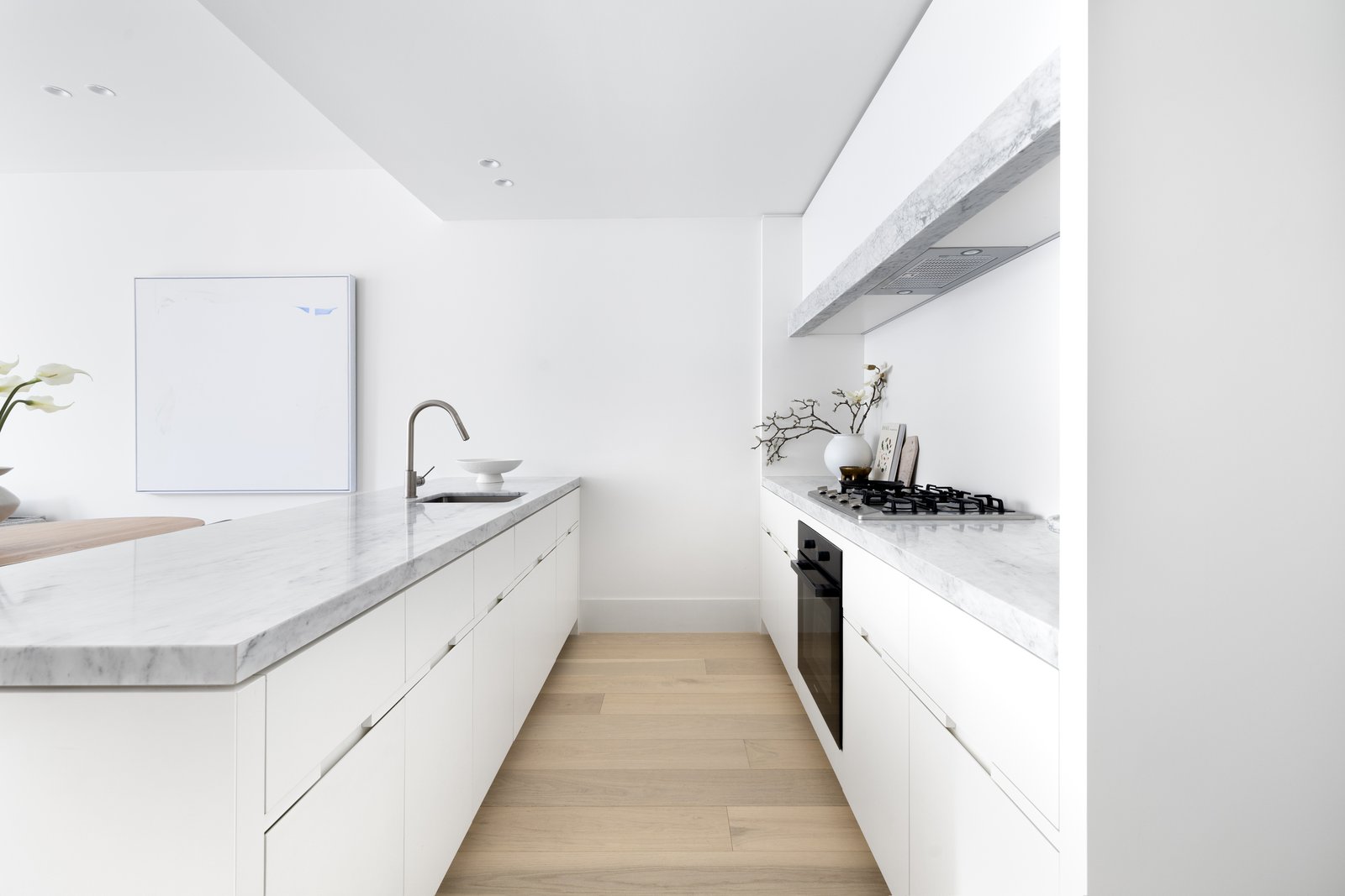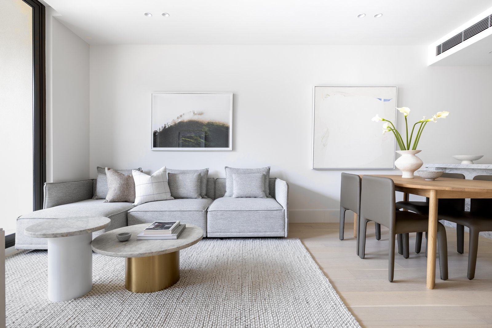 The interior of Soligo boasts a sophisticated palette predominantly composed of organic materials. Carrara marble and European Oak create a refined yet tranquil ambiance throughout the living spaces. Outside, the facade is adorned with travertine stone, adding depth and texture while imparting an air of sophistication to Whitehorse Road.