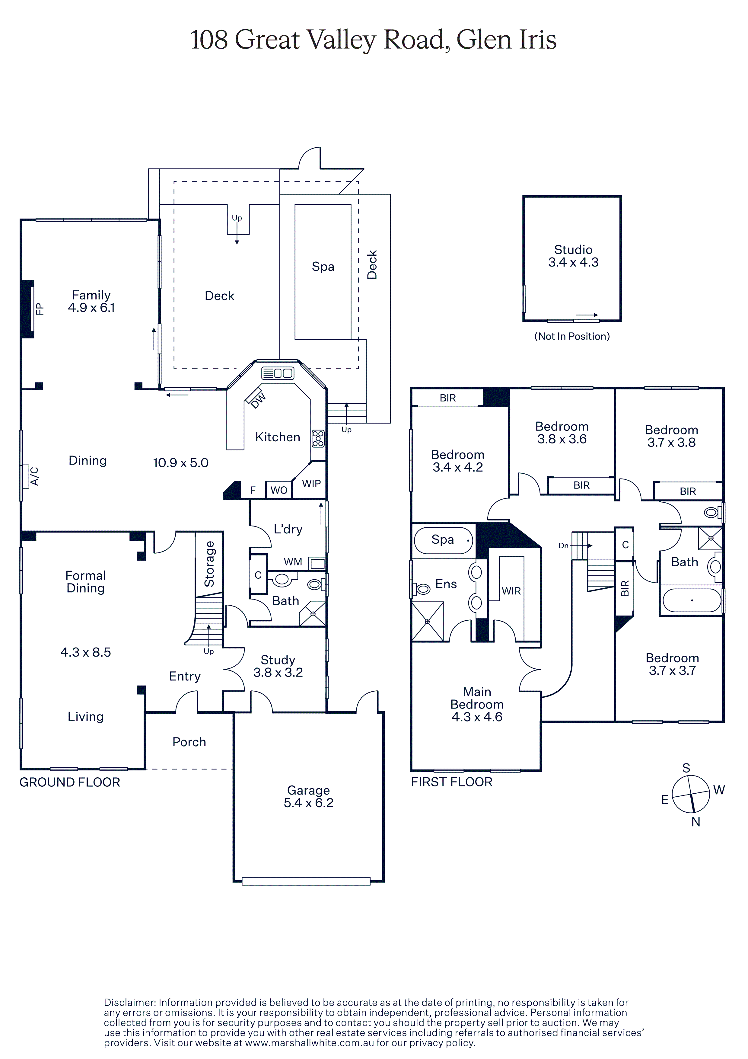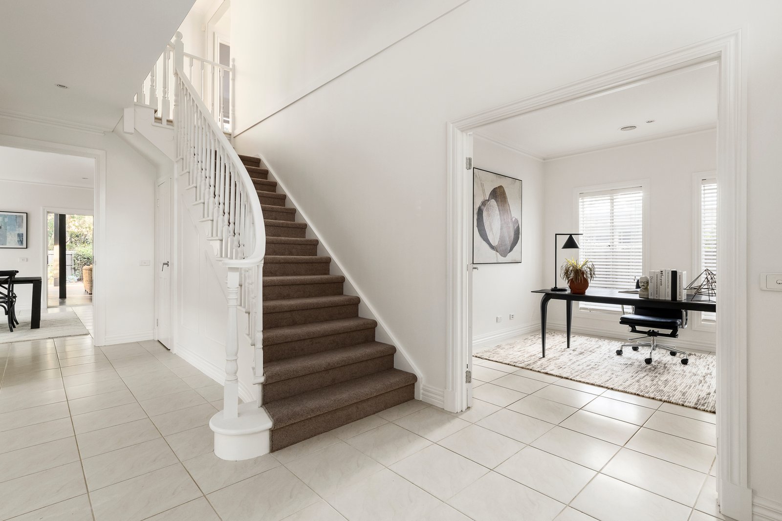 Beneath a soaring void, the impressive entrance foyer flows through to a home office with adjacent bathroom and to the graciously proportioned formal sitting and dining room. The gourmet kitchen appointed with stone benches and a walk-in pantry, a light-filled family dining area and the generous living room with a gas log fire open to a large undercover deck and heated spa overlooking the deep private garden with a studio/gym and gate to the park. An abundance of family accommodation upstairs comprises the gorgeous main bedroom with walk in robe and lavish en suite with spa bath, four additional robed bedrooms and a stylish bathroom with separate toilet.