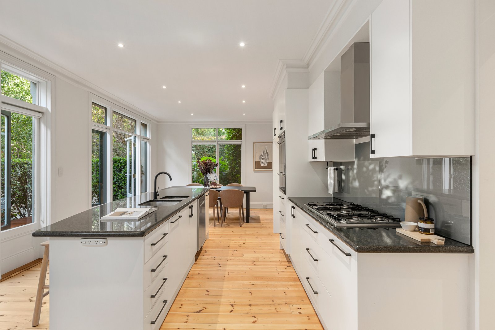 Serenely set well back from the street behind a high fenced stunningly landscaped garden, the majestic arched hallway featuring matt-finished Baltic pine floors introduces glorious formal sitting and dining rooms both with marble fireplaces and cleverly separated by recessed solid timber doors. Bathed in natural light, the open plan family living and dining room served by a gourmet stone kitchen with butler’s pantry/laundry opens to a large northeast deck and leafy private hedged gardens. Upstairs, the parents’ suite comprising gorgeous main bedroom with full width undercover balcony, designer en suite with large bath, double glazing and a home office or dressing room with robes is complemented by three additional double bedrooms with robes, a stylish bathroom with separate powder-room and a generous teenage retreat.