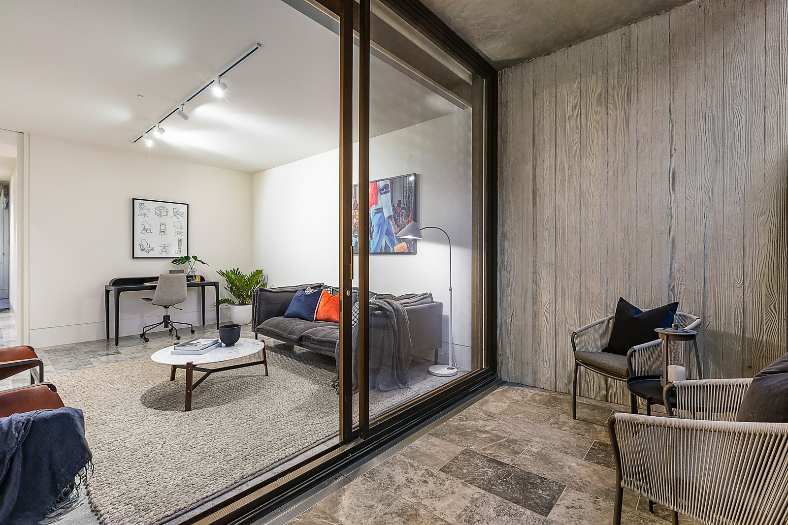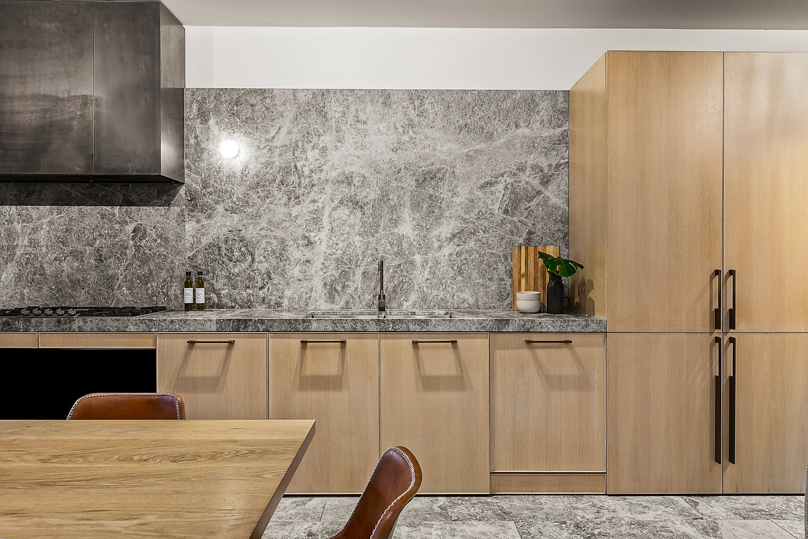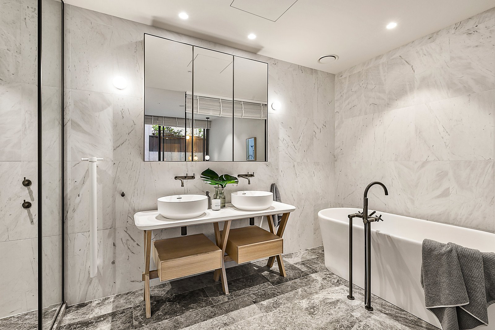 Beautifully appointed throughout, it features a lavish palette of honed Grey Aether marble, custom oak joinery and aged brass tapware. The welcoming entrance hall introduces a generous open plan living and dining room with a fitted cocktail cabinet and deluxe gourmet kitchen boasting Gaggenau appliances, integrated Liebherr fridge/freezer and marble benches, opening to a covered balcony. Oak stairs lead down to the gorgeous main bedroom with robes, ultra-stylish designer en suite with a freestanding bath, a second double bedroom with robe, stylish bathroom and a sunny terrace. A versatile retreat or media room with a kitchenette, terrace and separate street access is ideal for guests or as a home office.