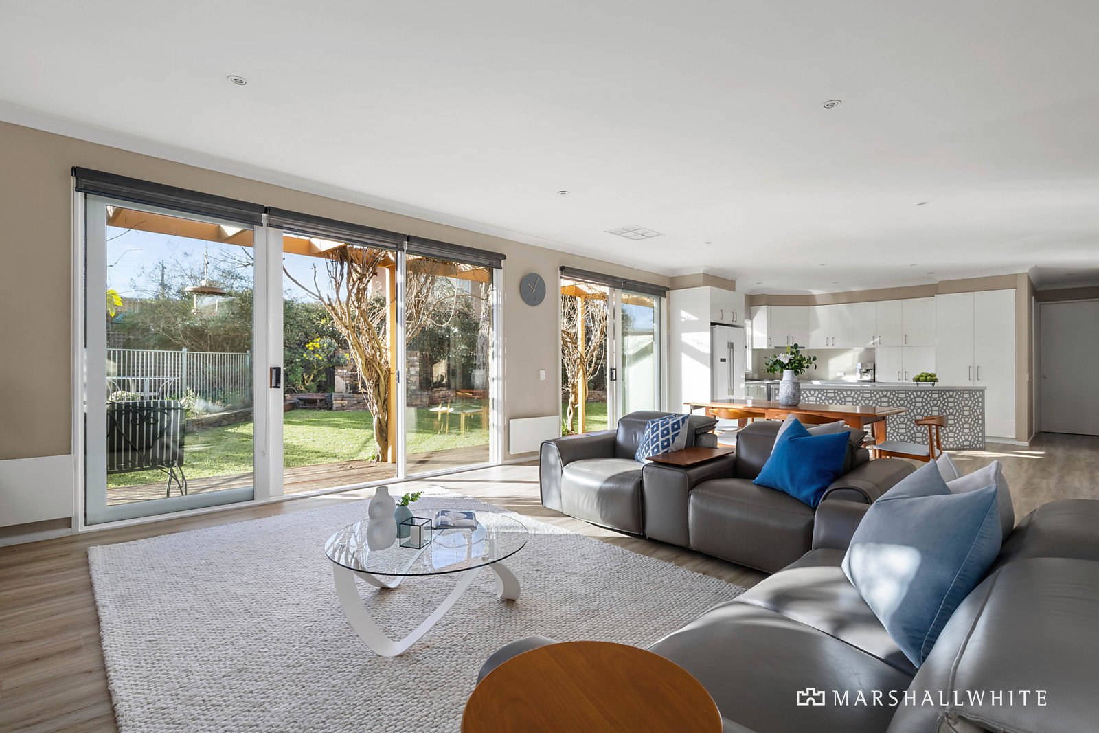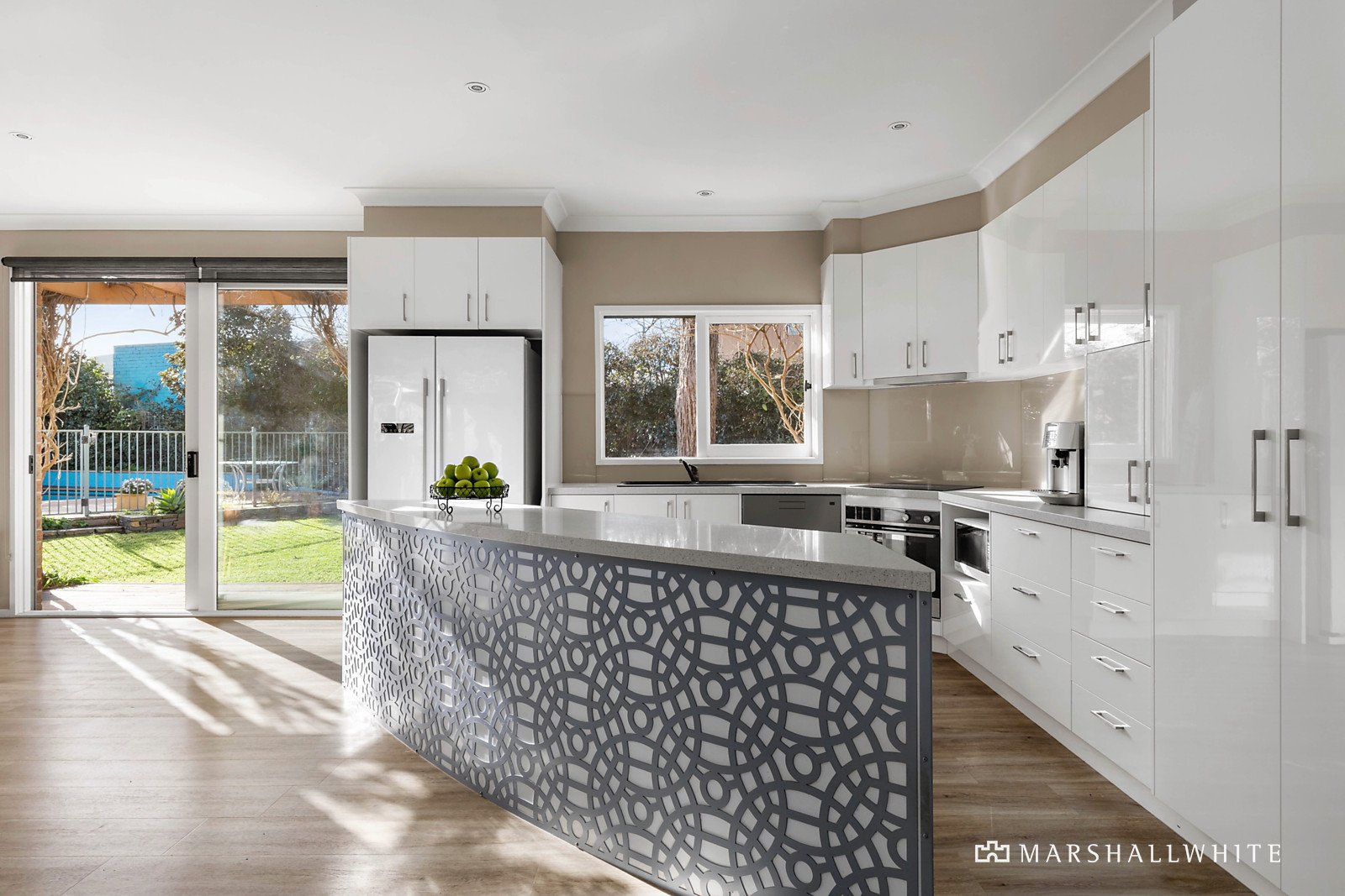 Brimming with natural light from all directions, the kitchen / dining / living room manages to flow seamlessly to two generous decks while retaining a remarkable sense of privacy. With fresh stone kitchen benches, volumes of contemporary kitchen cabinetry and new timber-look flooring, the living area is perfect for entertainers as it overlooks a solar-heated in-ground swimming pool and lawn that bask in northern sunshine. Meanwhile, an inviting lounge is a wonderful place to warm in front of the fireplace.