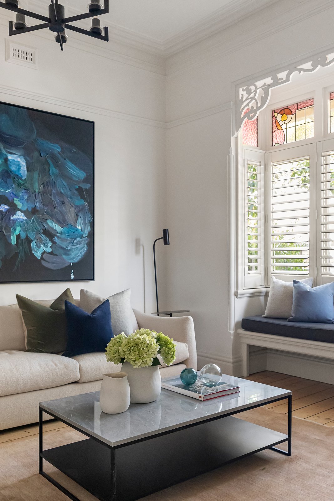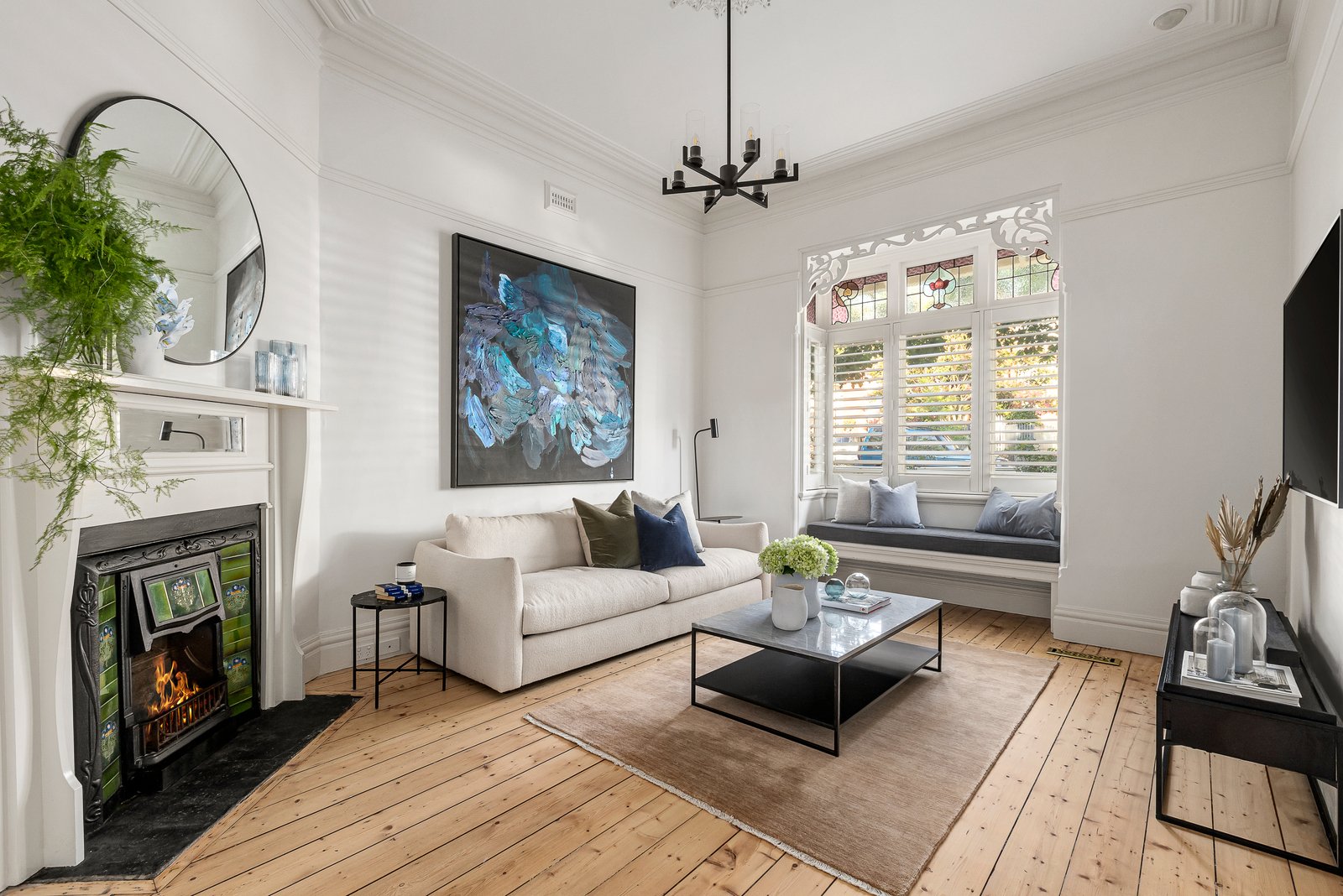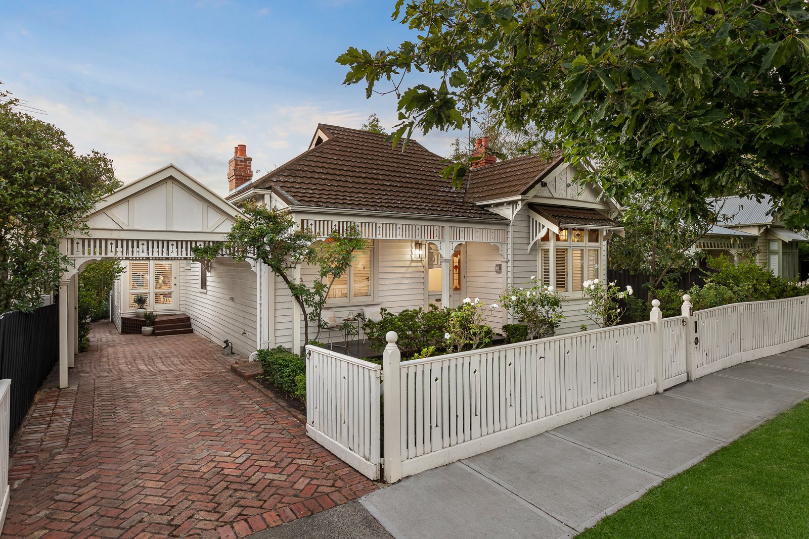 A wonderful light-filled ambience inside is amplified by the pale Baltic pine floors that flow through the wide central hall, elegant sitting room and library/home office featuring ornate ceilings and fireplaces. The beautiful main bedroom with walk in robe and stylish en suite is matched by three additional double bedrooms and a designer bathroom. At the heart of the home, a modern kitchen appointed with granite benches and a 90cm Smeg oven is adjacent to the inviting dining area. The expansive living room with a fireplace opens through French doors to a large undercover deck complete with bar fridges and sink, perfect for all weather al fresco dining and entertaining. The deck overlooks the deep private leafy garden with a freestanding studio/home office and rear access to St Johns Lane.
