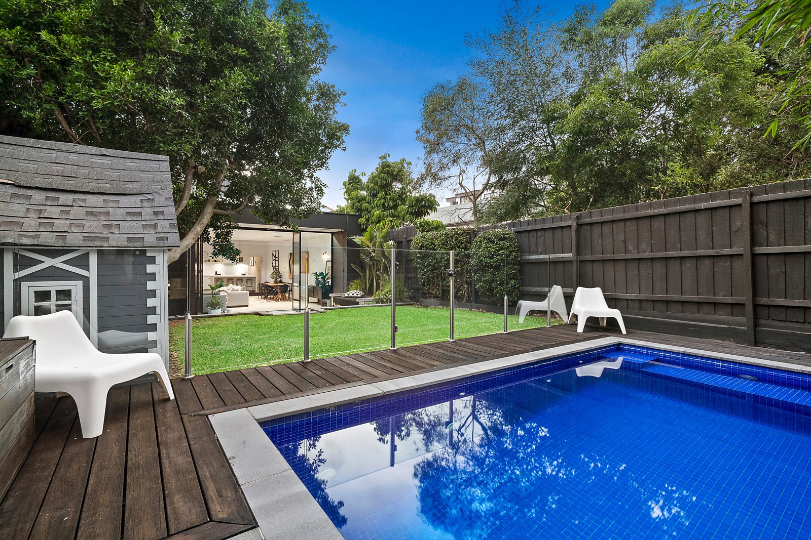 A long, arched entrance hallway with dark stained timber floors leads to three bedrooms with BIRs, main with a sleek ensuite and a sparkling family bathroom. Through to a spectacular living precinct with dining, full-height glass and a stylish kitchen with stone bench-tops, prestige Euro appliances, adjacent laundry and study nook; flowing through bi-fold doors to a paved alfresco area with an included built in bbq with mains gas and superb elevated azure blue pool with solar heating - delivering a tranquil oasis for year round relaxing with family and friends, in complete privacy. Other features include ducted heating and cooling, OFPs, surround sound, ample internal storage including roof, utility area, cubby house, auto gate and off-street parking.