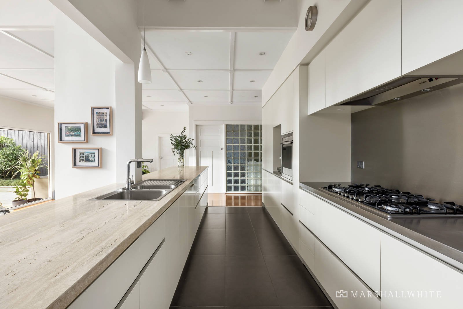 Behind the charming exterior, a central entrance hall featuring timber floors flows through to an inviting sitting room, a home office and stunning gourmet kitchen appointed with Travertine benches and Neff appliances. A soaring raked glass ceiling accentuates the wonderful sense of light in the expansive family meals/living room which opens out to the picturesque north-facing private garden with extensive paving, undercover BBQ area and a tranquil pond. It's a completely private leafy sanctuary for outdoor living and entertaining. The ground floor main bedroom - complete with a chic ensuite and built-in robes - is joined by two further bedrooms and a centrally located bathroom, while upstairs another fabulous living area comprises two additional robed bedrooms, a third bathroom, spacious sun-drenched retreat, and north-facing balcony.