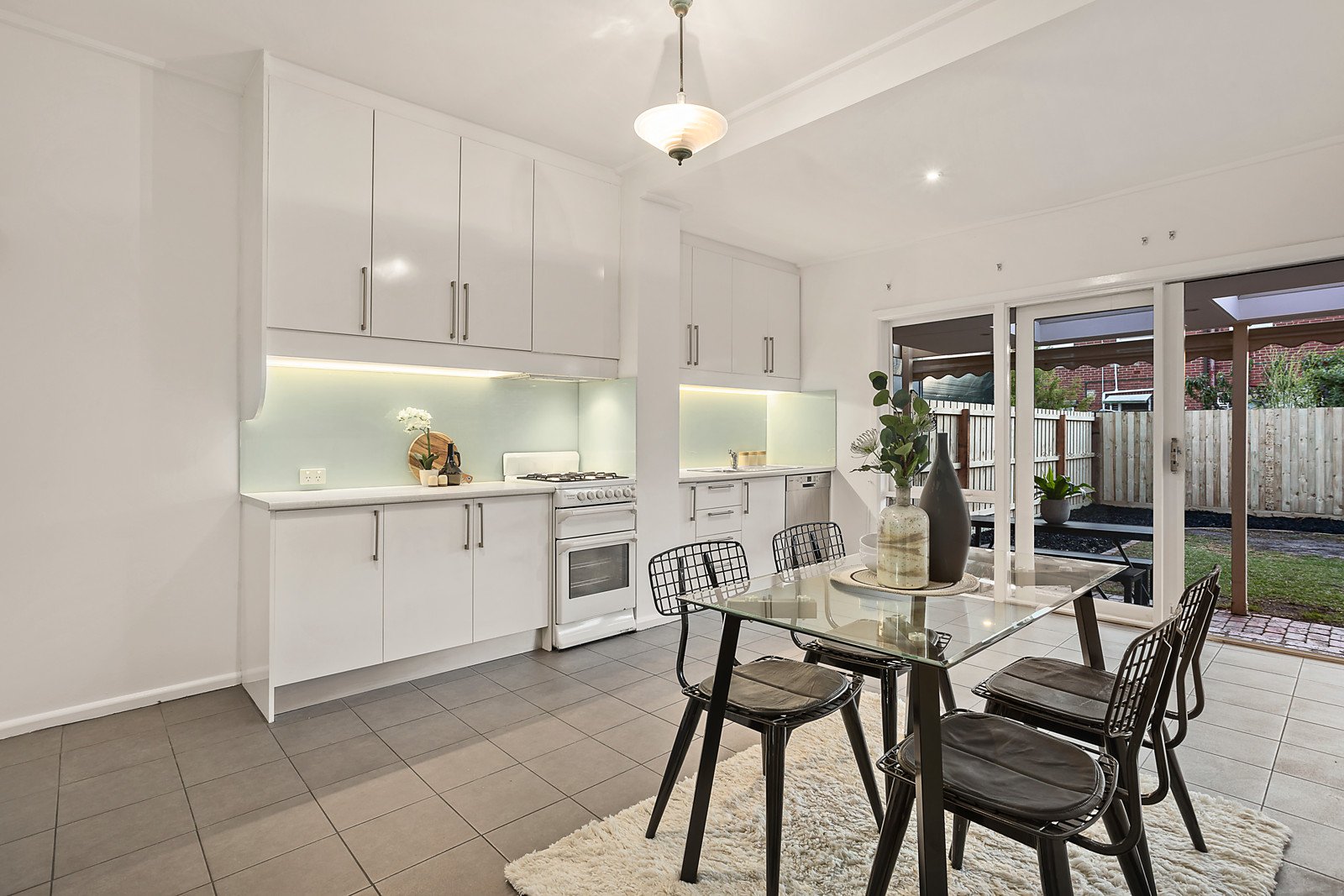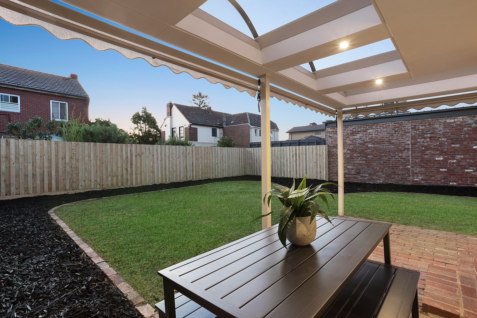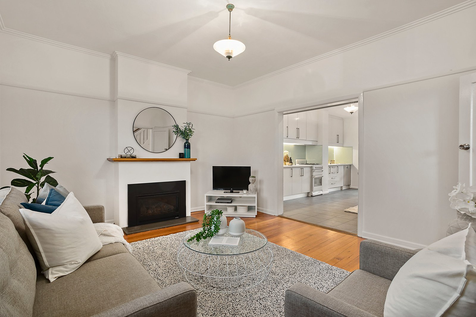 Streaming with natural light throughout, the entrance hall featuring timber floors flows through to a generous living room with gas fire, Deco light-fitting and original etched glass doors. The light-filled well-appointed kitchen and dining area extend out to a covered terrace shaded by cafe blinds and the large private garden. Timber floors continue upstairs through a main bedroom with built in robe and city glimpses, two additional bright bedrooms with robes and a stylish new fully tiled bathroom.