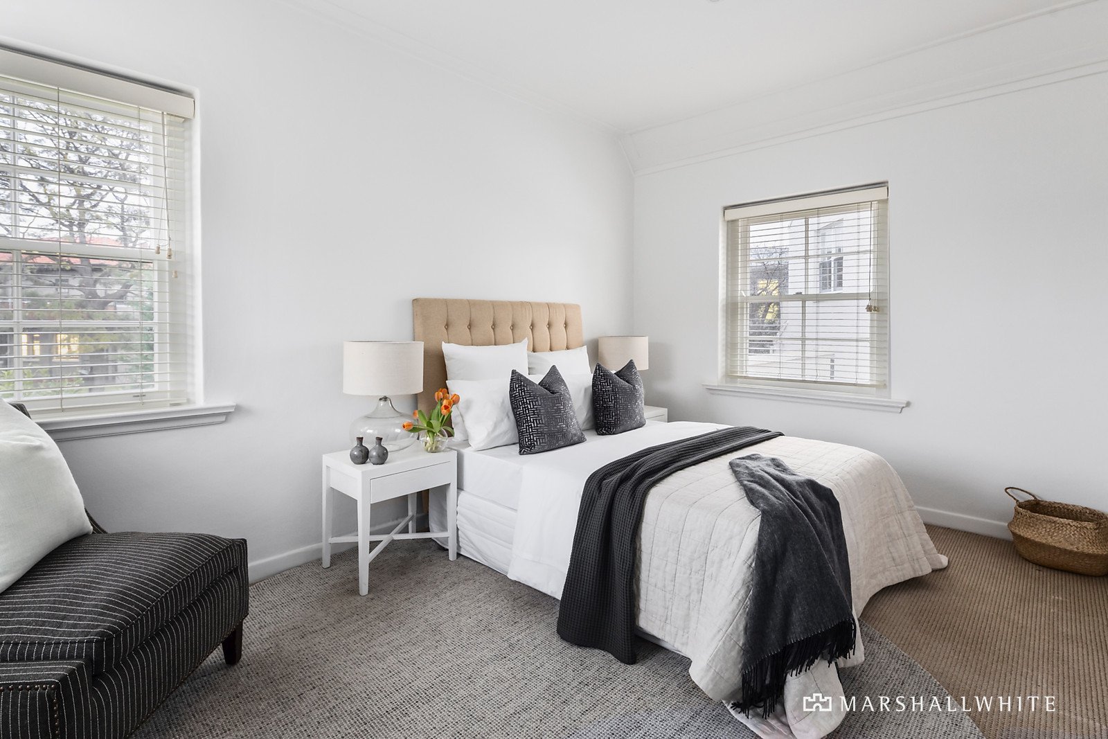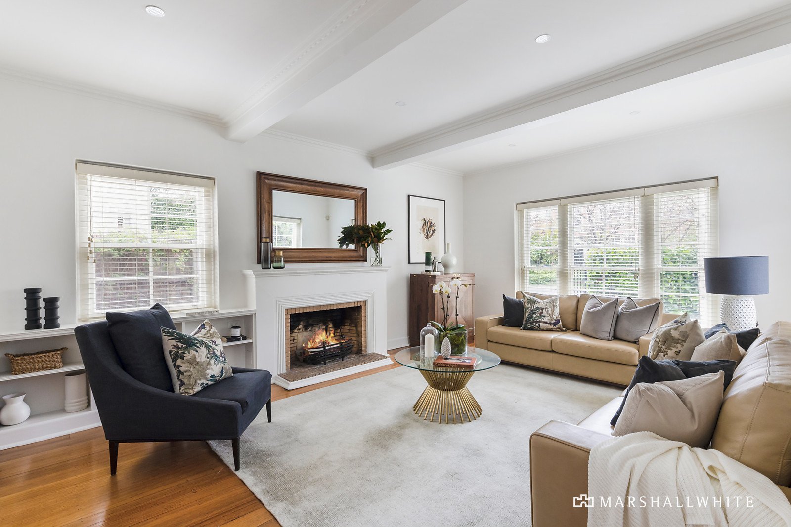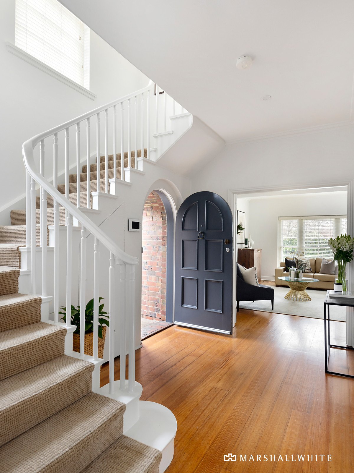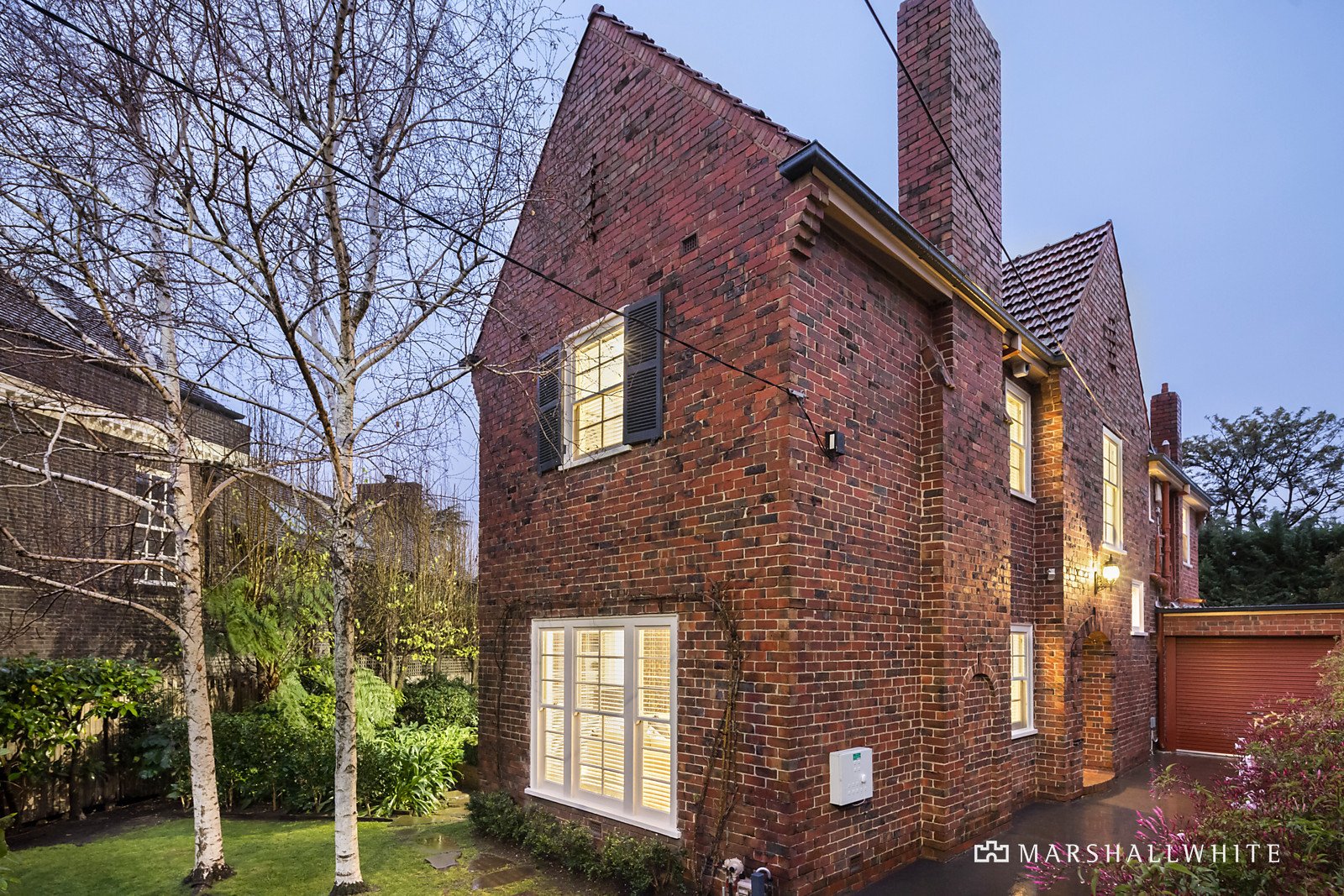 An elevated position at the end of a tranquil cul-de-sac reveals this magnificent c.1939 Interwar old English style residence presenting inspired, elegant living domains in sublime garden surrounds. Abundant light permeates throughout this tranquil two-level oasis superbly situated in an esteemed Toorak pocket. Through the striking arched doorway, high ceilings and Tasmanian Oak floors flow into the formal lounge area featuring a stunning fireplace and multi-aspect sash windows, with sliding doors into a home office. To casual living and dining, where ample windows, herringbone parquetry floors and a high coved ceiling enhance the airiness of this inviting space. Timber framed bi-fold doors open out to a paved alfresco terrace amidst a fragrant garden of lavender and jasmine - the perfect location for private dining and entertaining. The kitchen details Miele and Smeg appliances with stone benches leading to a butler's pantry with double sink and wine storage. Upstairs, the entire level is infused with light from every direction, complementing three spacious robe bedrooms, two with stylish ensuites, one adjacent to a pristine third bathroom. A single garage opens to a peaceful self-contained studio for guests or independent teenagers, offering a living area, kitchen and bathroom with full-height glass extending out to a rear alfresco zone amongst citrus trees. This captivating home also features a powder room, hydronic system, solar panels, laundry with external access, study/exercise or music room and storage space. Moments to excellent schools such as St Catherine's and St Kevin's, Heyington Station, Citylink access and Toorak Village boutiques and dining. Land: 467sqm approx.