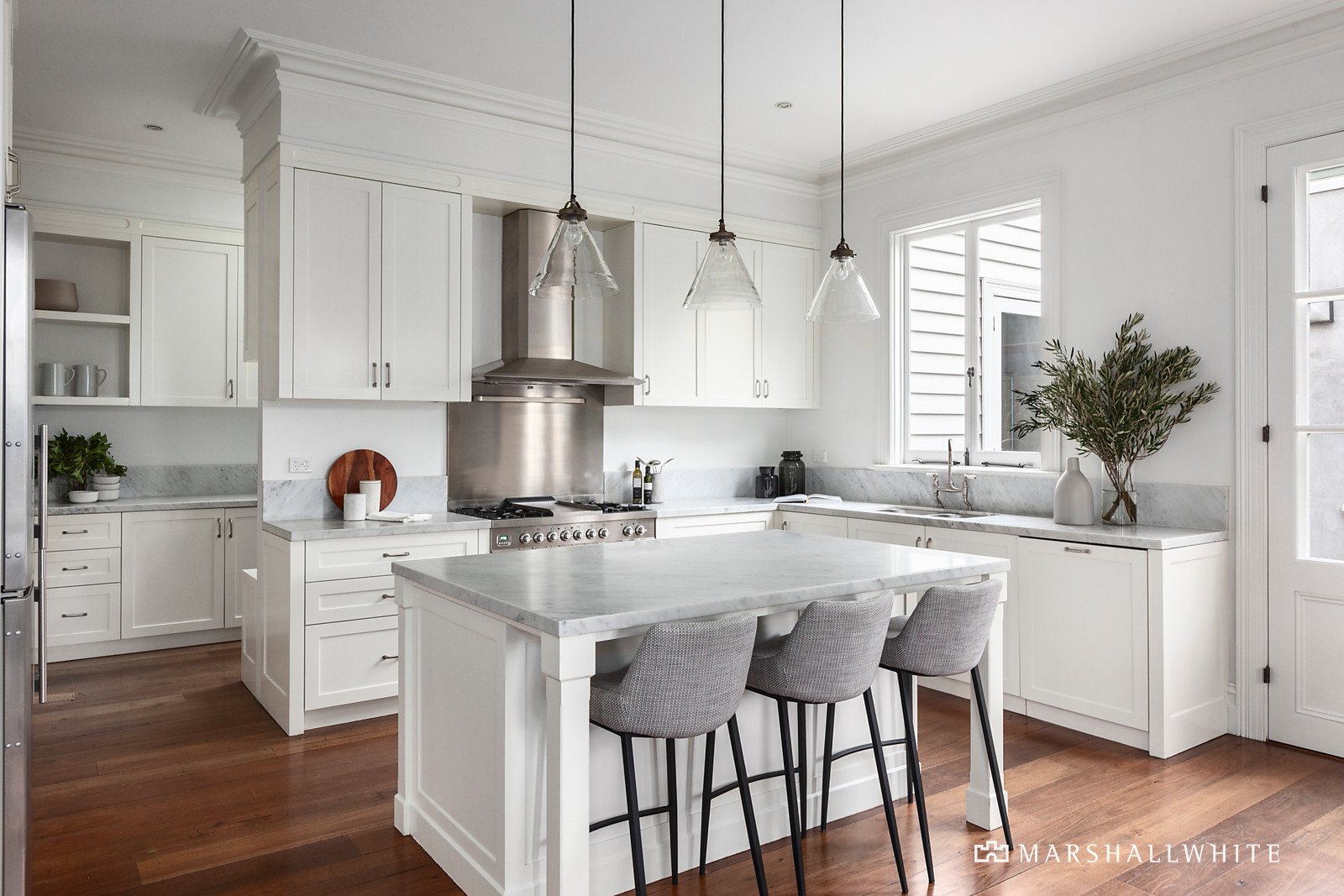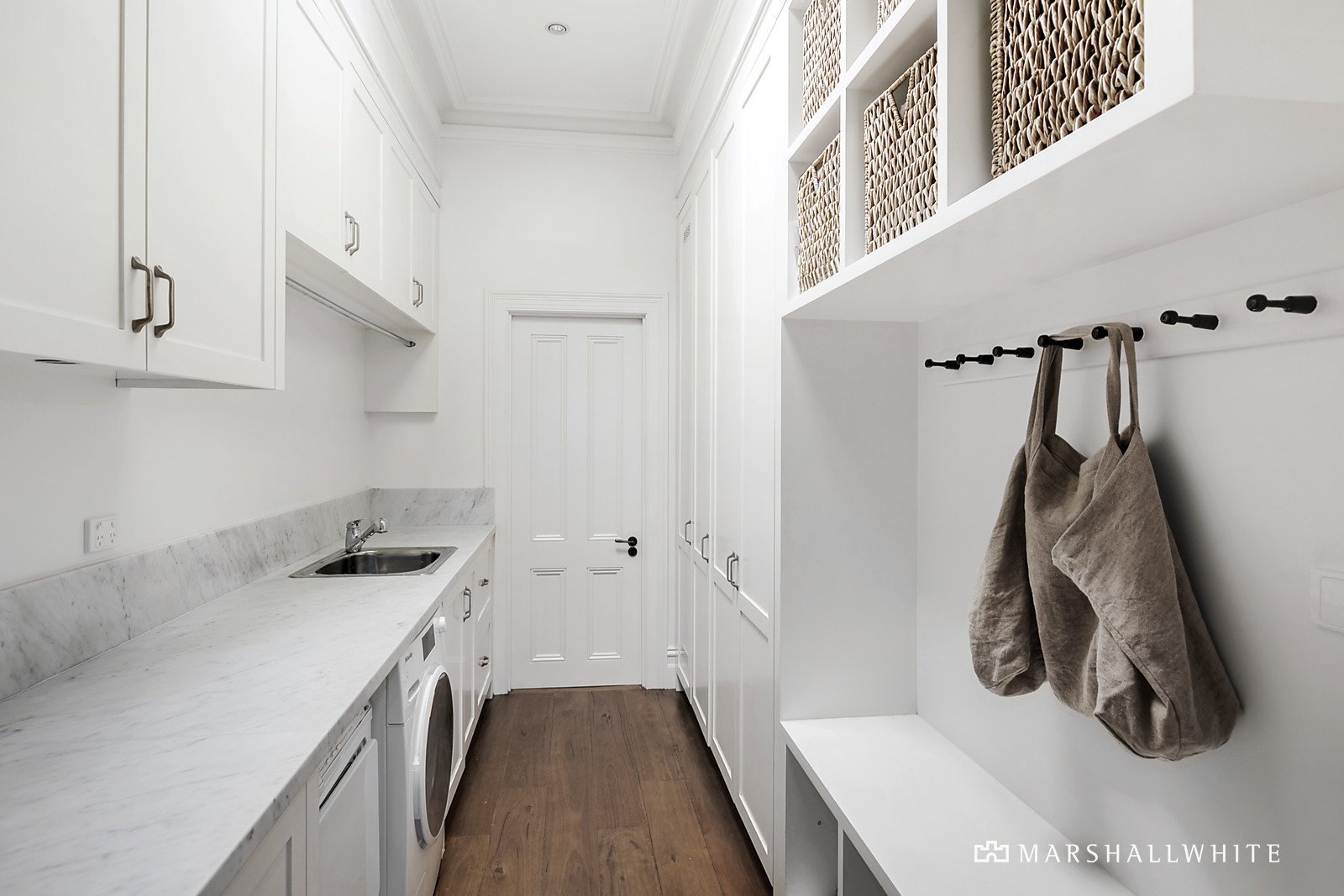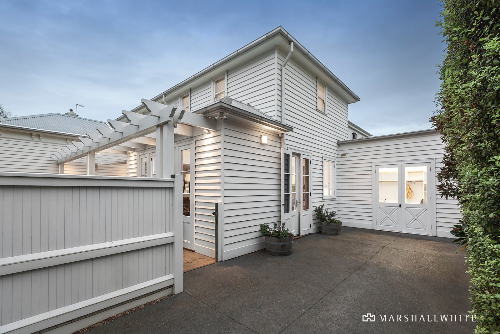 A grand hallway introduces three beautiful principle rooms serviced by a stylish central bathroom, whilst a large master bedroom enjoys direct access to the garden with a walk-in-robe and classically designed ensuite. A beautiful central sitting room with fireplace is perfectly complimented by an adjoining kitchen and dining area complete with butler's pantry, Carrara marble surfaces, and a combination of high end European appliances. Upstairs, an informal family room/retreat is combined with an additional two double bedrooms (BIRs) and 3rd bathroom making this the perfect family home.