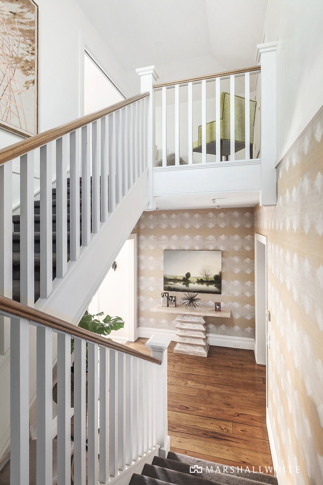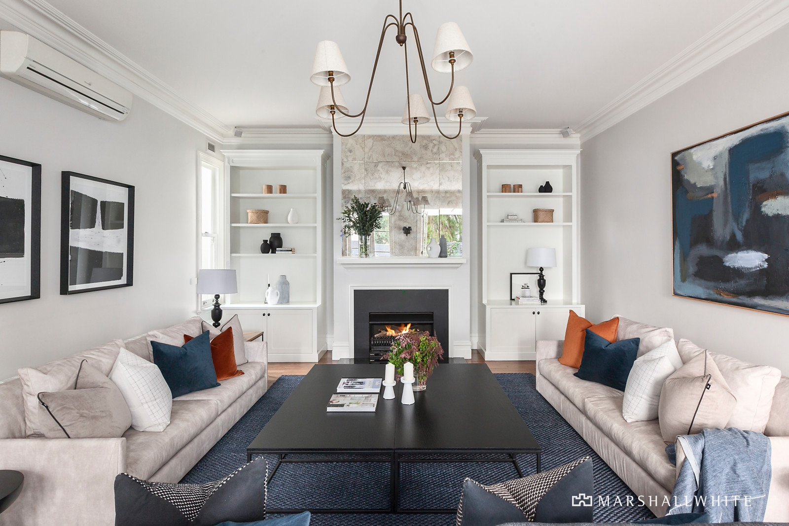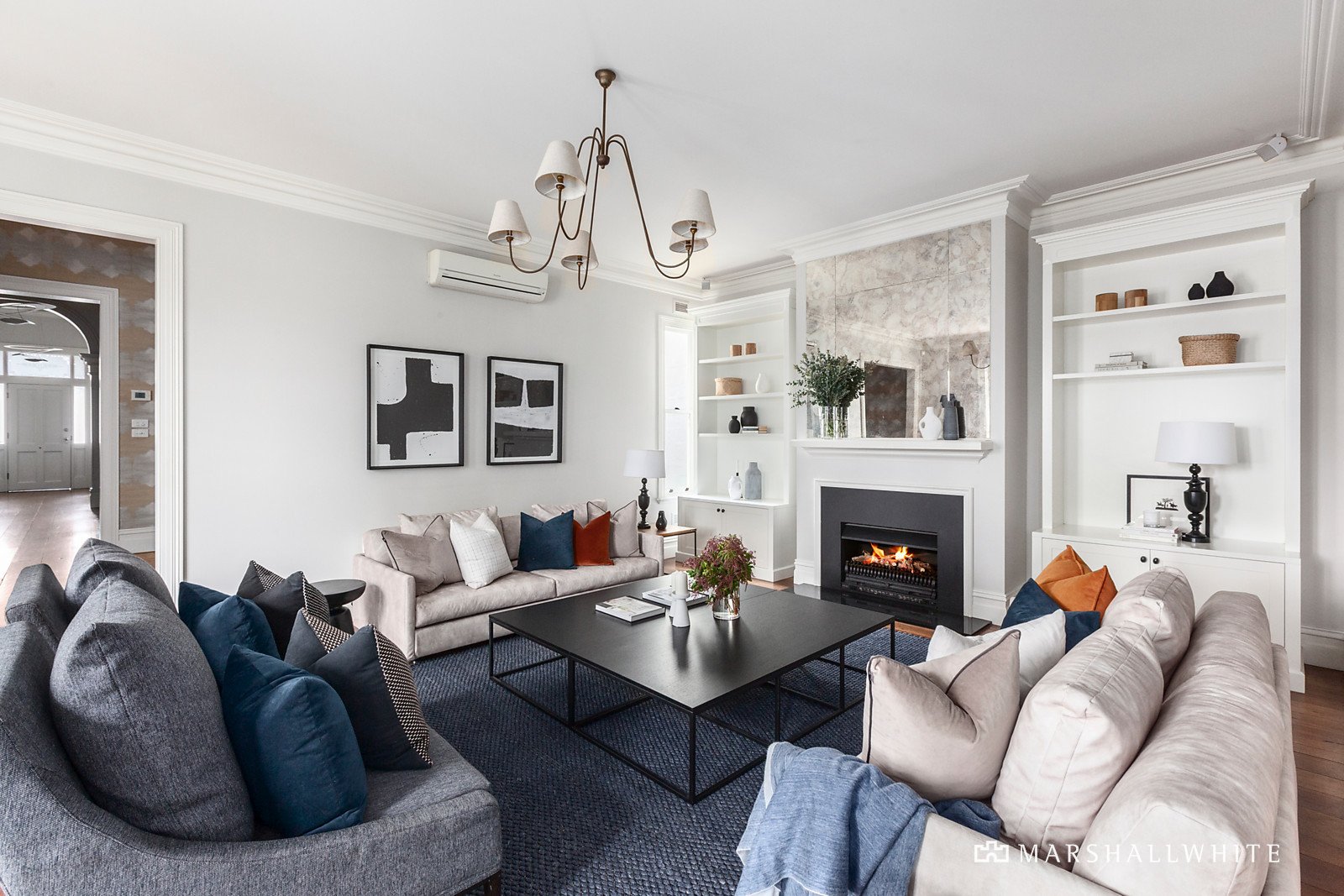 A grand hallway introduces three beautiful principle rooms serviced by a stylish central bathroom, whilst a large master bedroom enjoys direct access to the garden with a walk-in-robe and classically designed ensuite. A beautiful central sitting room with fireplace is perfectly complimented by an adjoining kitchen and dining area complete with butler's pantry, Carrara marble surfaces, and a combination of high end European appliances. Upstairs, an informal family room/retreat is combined with an additional two double bedrooms (BIRs) and 3rd bathroom making this the perfect family home.