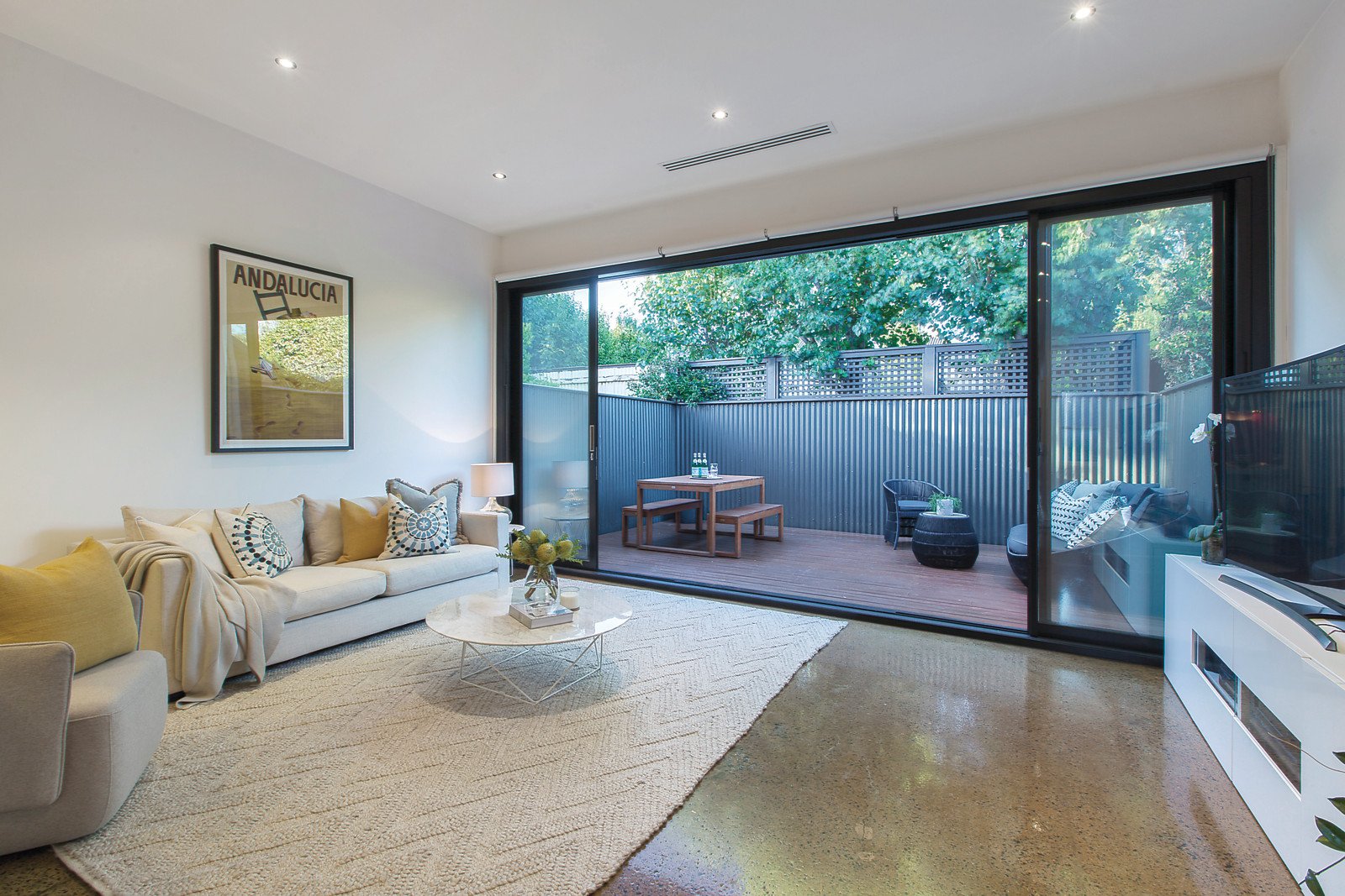 Stained dark, the Baltic pine floors in the sun-drenched hallway lead to two gorgeous double bedrooms with open fireplaces and built in robes and a sleek stylish bathroom. High ceilings throughout accentuate the inviting sense of space. Polished concrete floors in the generous living and dining room with a stunning gourmet kitchen boasting stone benches and Miele appliances. A full width bank of sliding doors open completely to a leafy private decked north-facing courtyard, the perfect venue for al fresco dining.