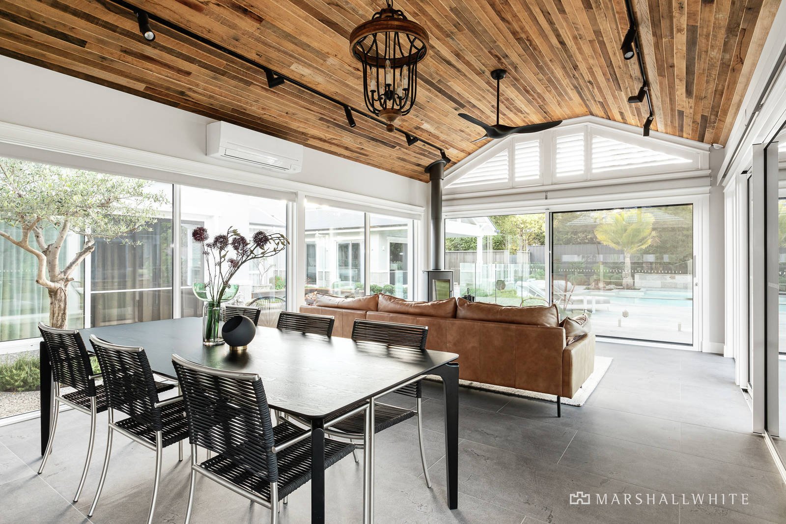 A remarkable sun-drenched, glass-walled entertainment room provides the ideal setting for large groups to enjoy breathtaking views of this acreage property in every season. Complete with vaulted recycled timber ceilings, cooking facilities including Wolf grill and teppanyaki cooktop, fireplace and direct access to the impressive resort-inspired swimming pool/spa, poolside alfresco with built in BBQ, and floodlit mod grass tennis court.