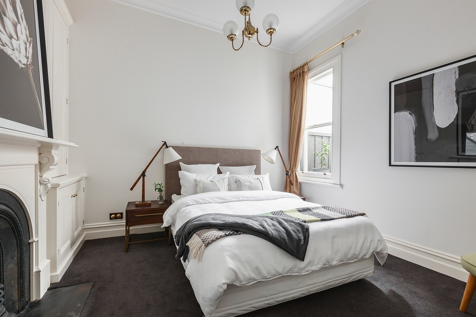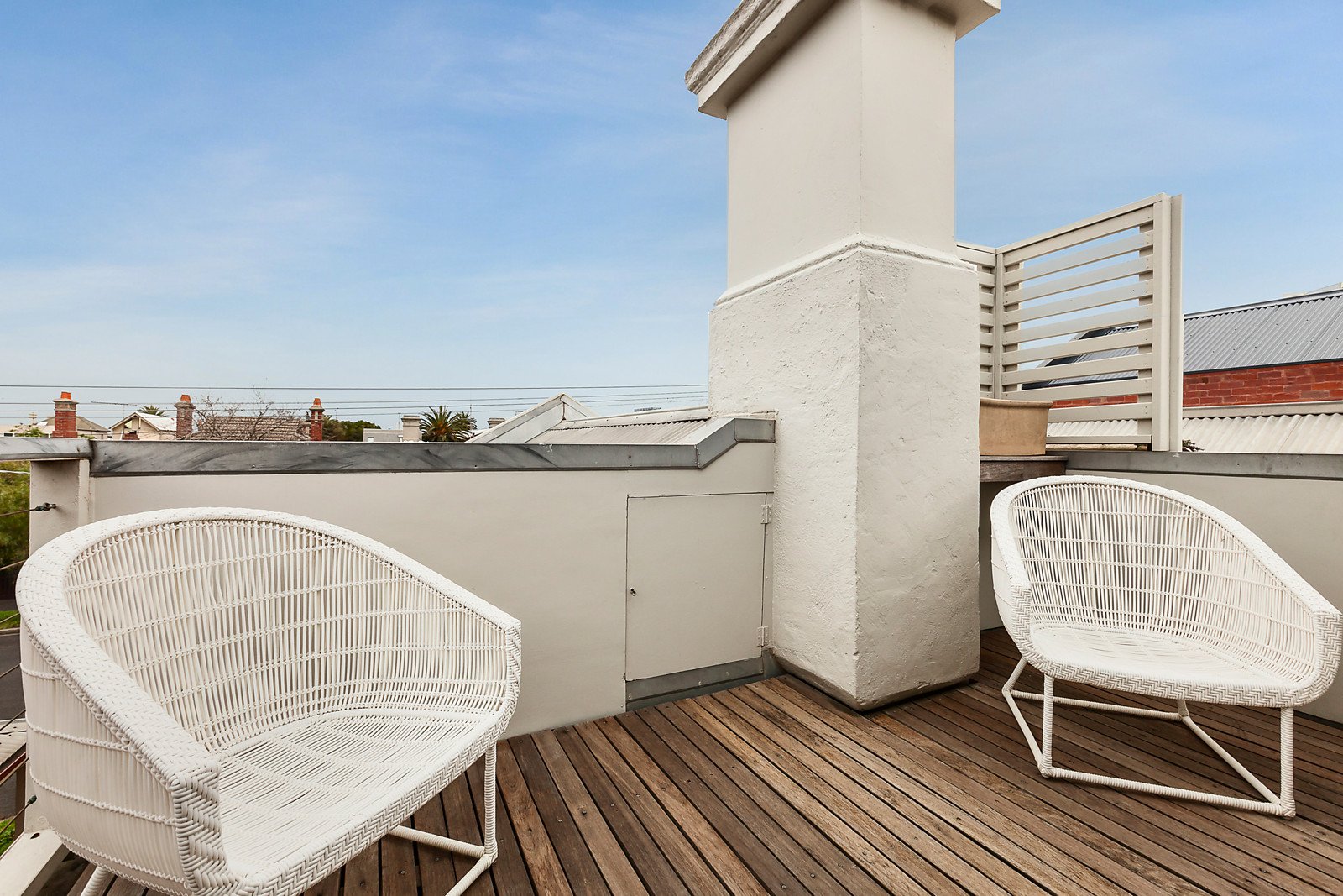 Limed oak floors accentuate the sense of light through the arched entrance hall which flows through to an inviting open plan living and dining room and gourmet European kitchen featuring stainless steel and stone benches. French doors open the living to a private north-facing decked garden, a leafy entertainer's oasis with built in seating and plumbed gas for a BBQ. The rear lane also offers potential for off street parking. Two beautiful bedrooms with open fires and built in robes and a stylish bathroom are downstairs. On the level above there is a generous sitting room and the gorgeous main bedroom with designer en suite, robes and sunny roof deck.