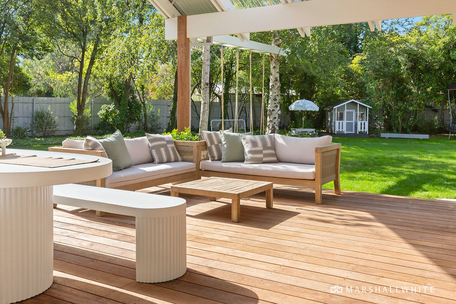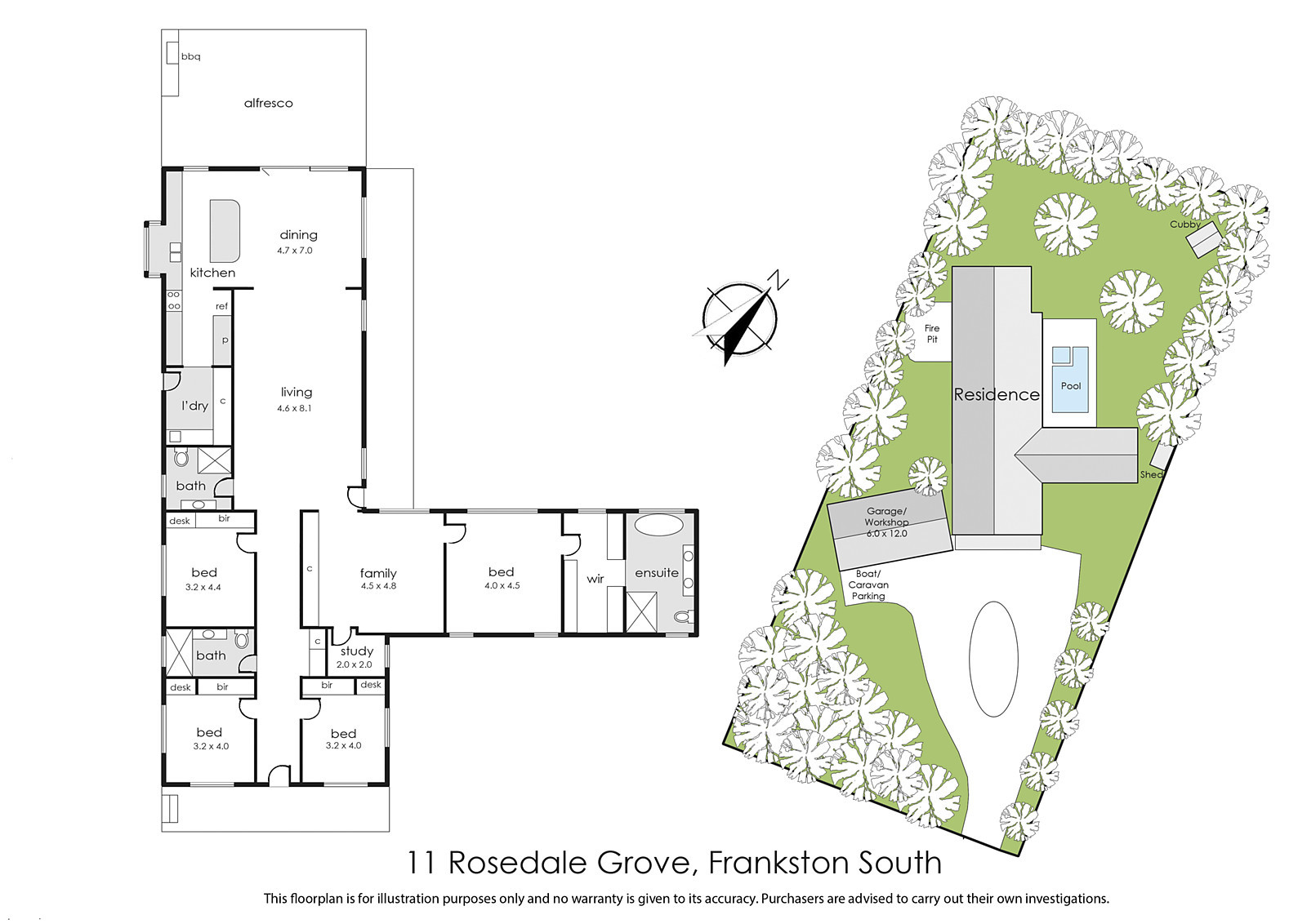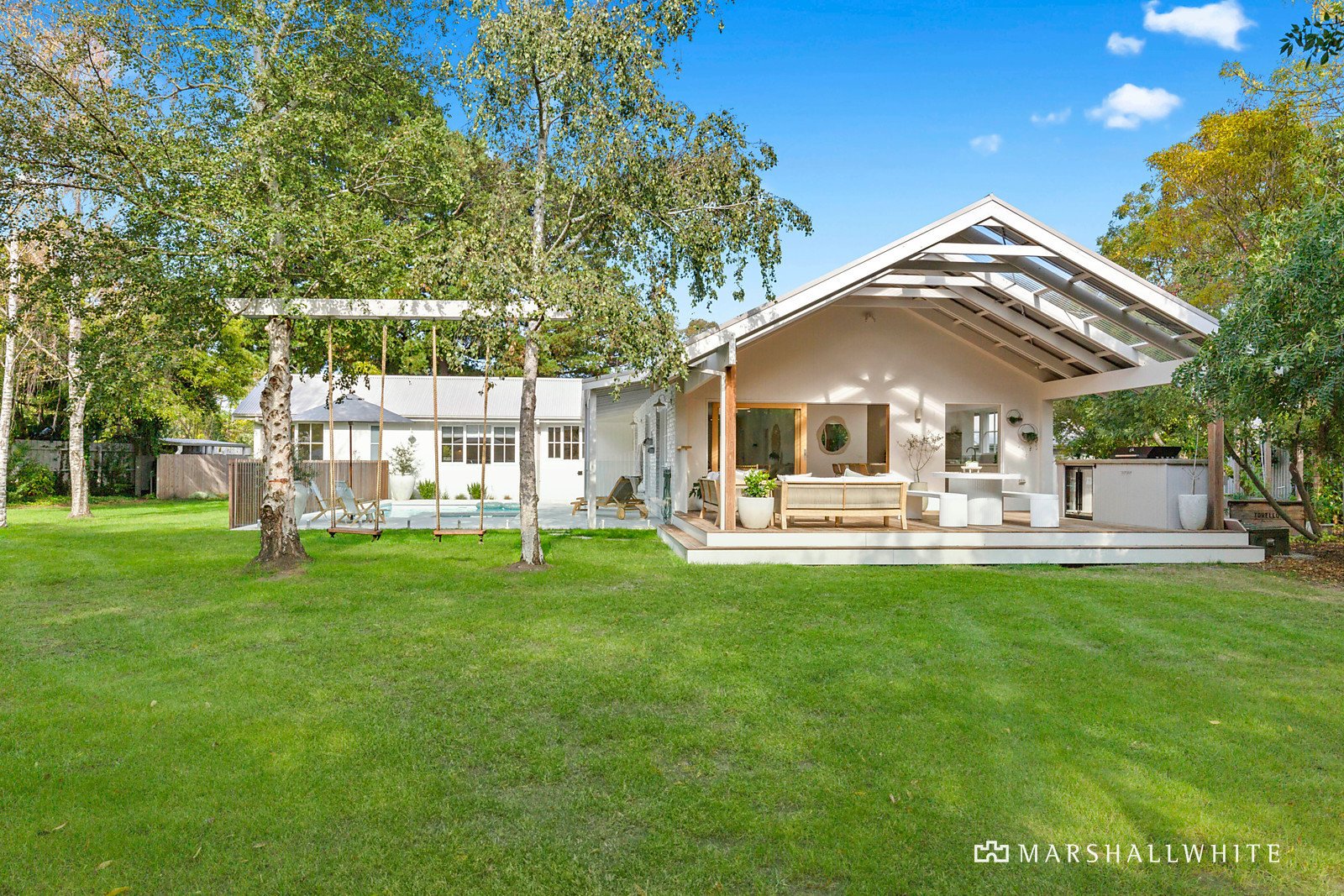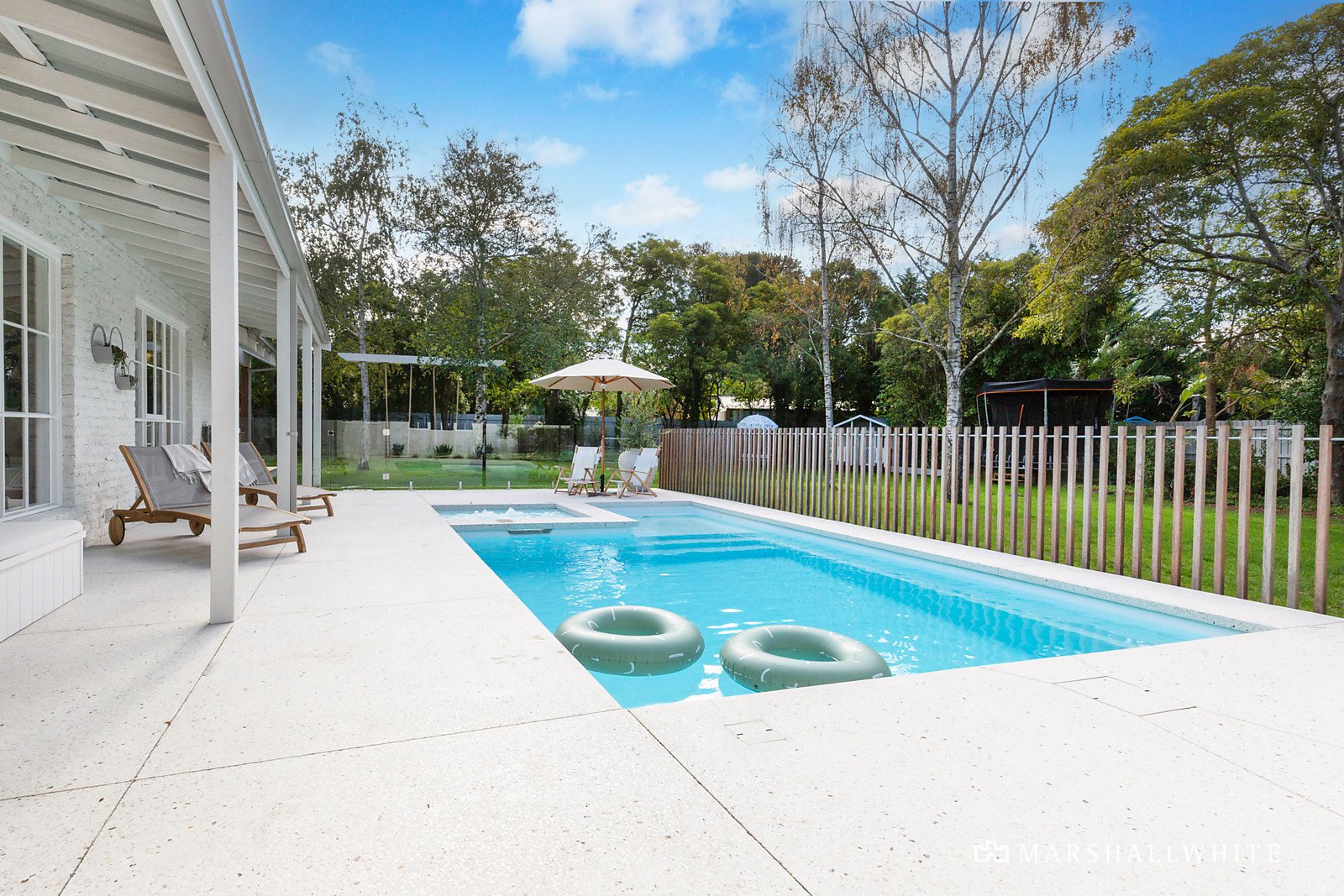 Light-filled and spacious, the central open plan living area has high raked ceilings with a window-sized skylight, and glass-sliding doors opening to the covered alfresco dining deck with built-in outdoor culinary zone. The show stopping kitchen has an island bench with elegantly curved edges in granite from Brazil, all Miele appliances including a 900mm gas cooktop and twin pyrolytic self-cleaning ovens. Other rooms include a stone laundry with external access, a secondary living room/retreat with floor-to-ceiling storage cabinetry, a study, plus a fitted 'mud room' nook. Surrounded by stunning honed concrete, the salt-chlorinated swimming pool is warmed by an electric heat pump, with a gas-heated spa. There are also raised veggie beds, a fire pit area, lush lawns, custom swing set, and cubby house completing the family paradise. The separate garage has an auto door and room for two vehicles, workshop/utility space, plus there is a caravan parking bay with power.