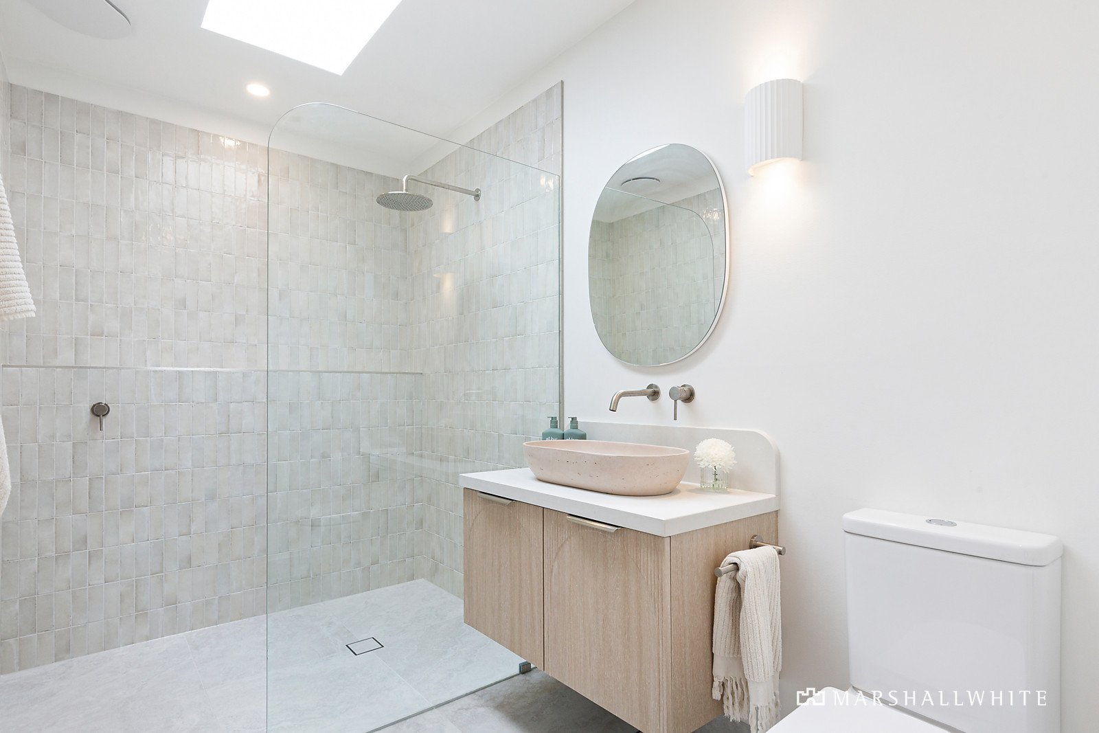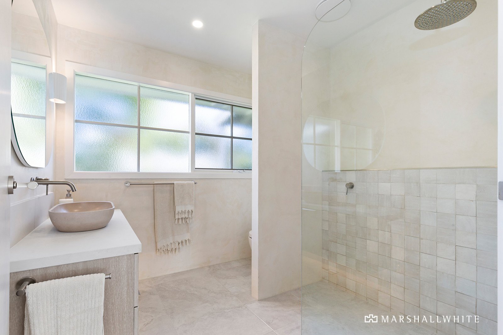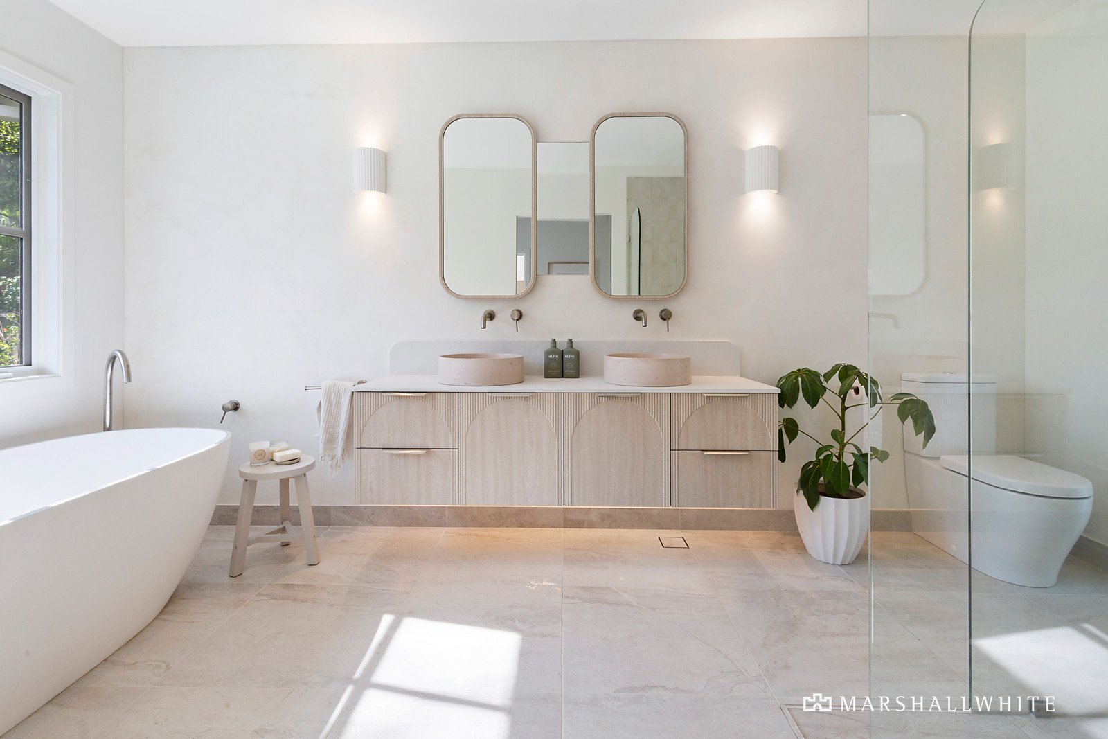 Set behind a high gate with wi-fi video security entry, the picture-perfect single-level brick and Axon-cladded home is set in front of a wide turning circle. Cohesively appointed, the subdued, stone-inspired interior palette is accented with curved elements and soft textures. Engineered 'Calypso' oak floors flow through the main living areas, with plush pure wool carpets in the bedrooms. The intuitive family-friendly layout, and exceptional fit-out with custom joinery, provides enhanced liveability and an abundance of storage. The three bedrooms in the front section of the home all have custom robes, shelving, and study nooks, while the master suite has pool views, a walk-in robe and luxe ensuite with freestanding stone bathtub, twin vanities, and walk-in shower. Signature on point designer elements are evident in all three exquisitely appointed bathrooms with Concrete Nation 'Arc' basins, stone vanities, Moroccan tiles, limestone-effect tiling and a Microcement treatment on the walls.