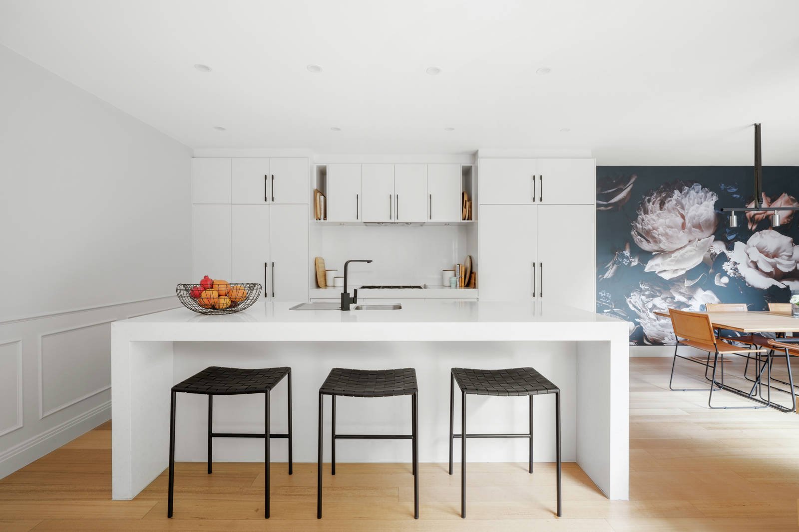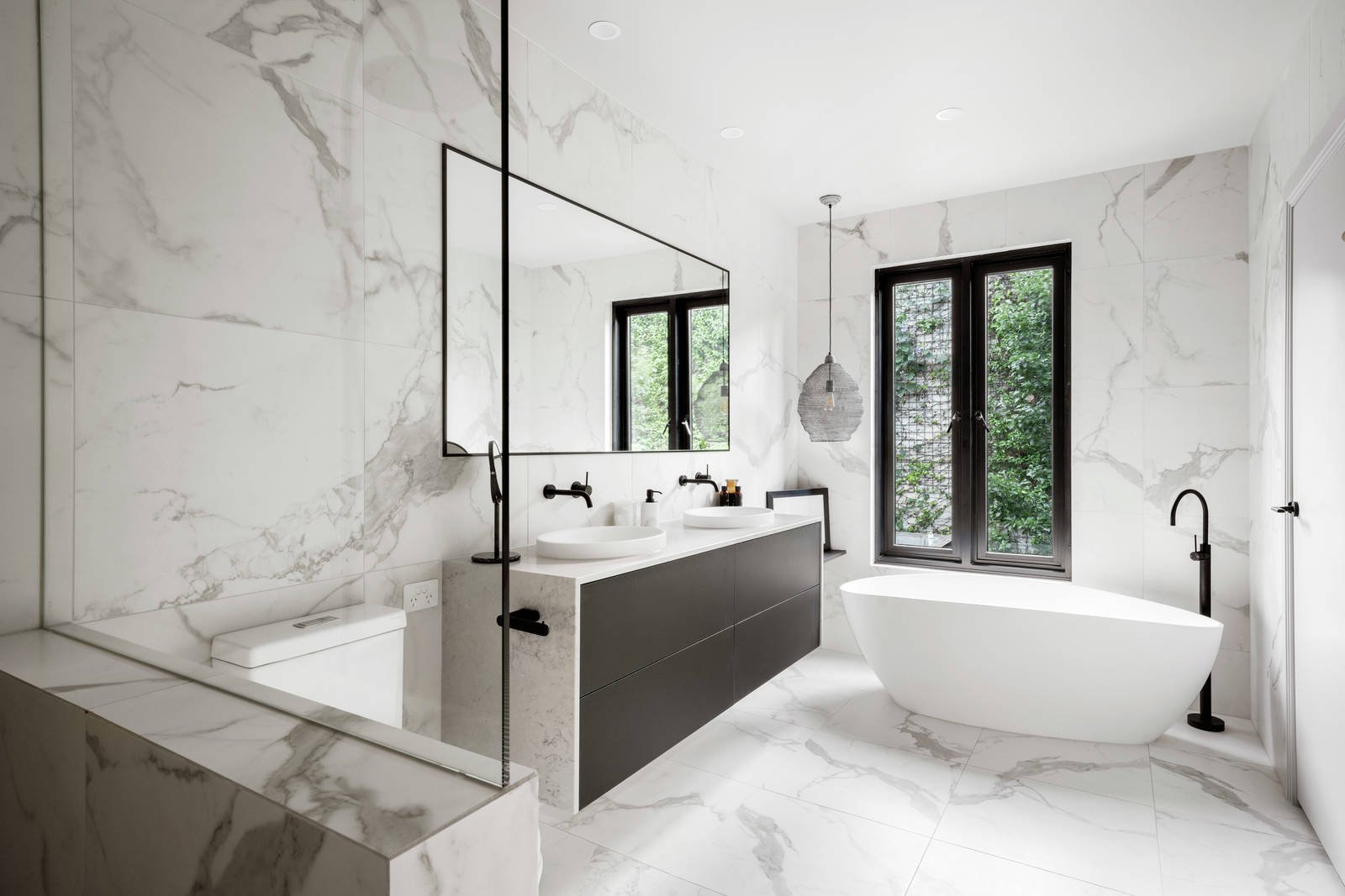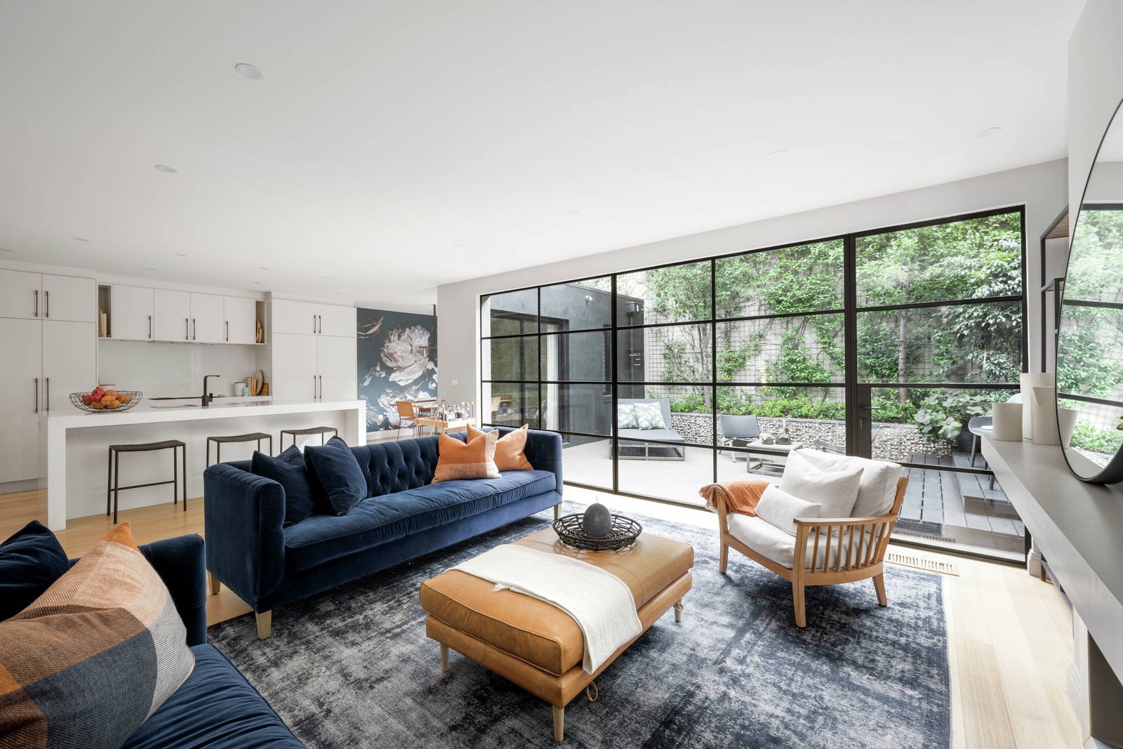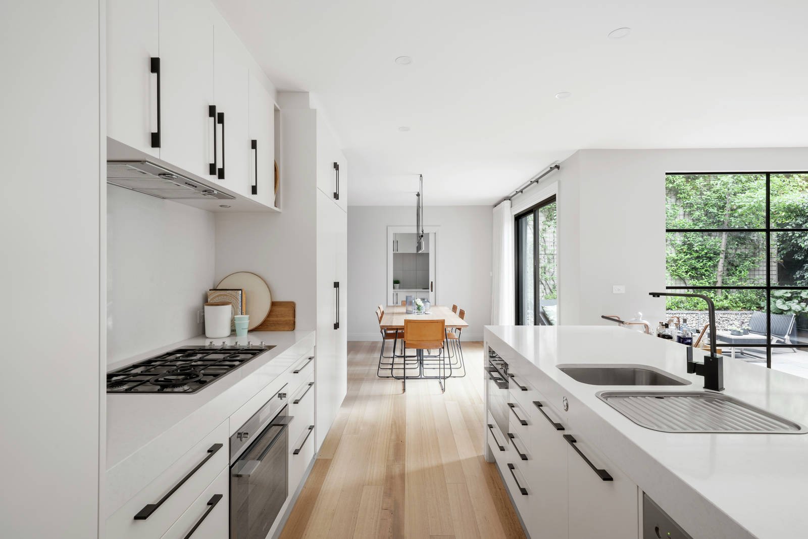 A double height void creates an instant impact in the wide entrance hall where pale timber floors flow through to a sensational living room with a gas log fire, sleek gourmet Smeg kitchen appointed with white stone benches and integrated fridge/freezer and an atmospheric dining room. Industrial style black steel framed glass doors open the living spaces to a gorgeous private northwest courtyard with bluestone paving and garden surrounds. A beautiful bedroom with built in robe is downstairs while upstairs there is a lavish main bedroom with custom robes and a designer en suite with freestanding bath, a third bedroom with robes and a stylish bathroom.