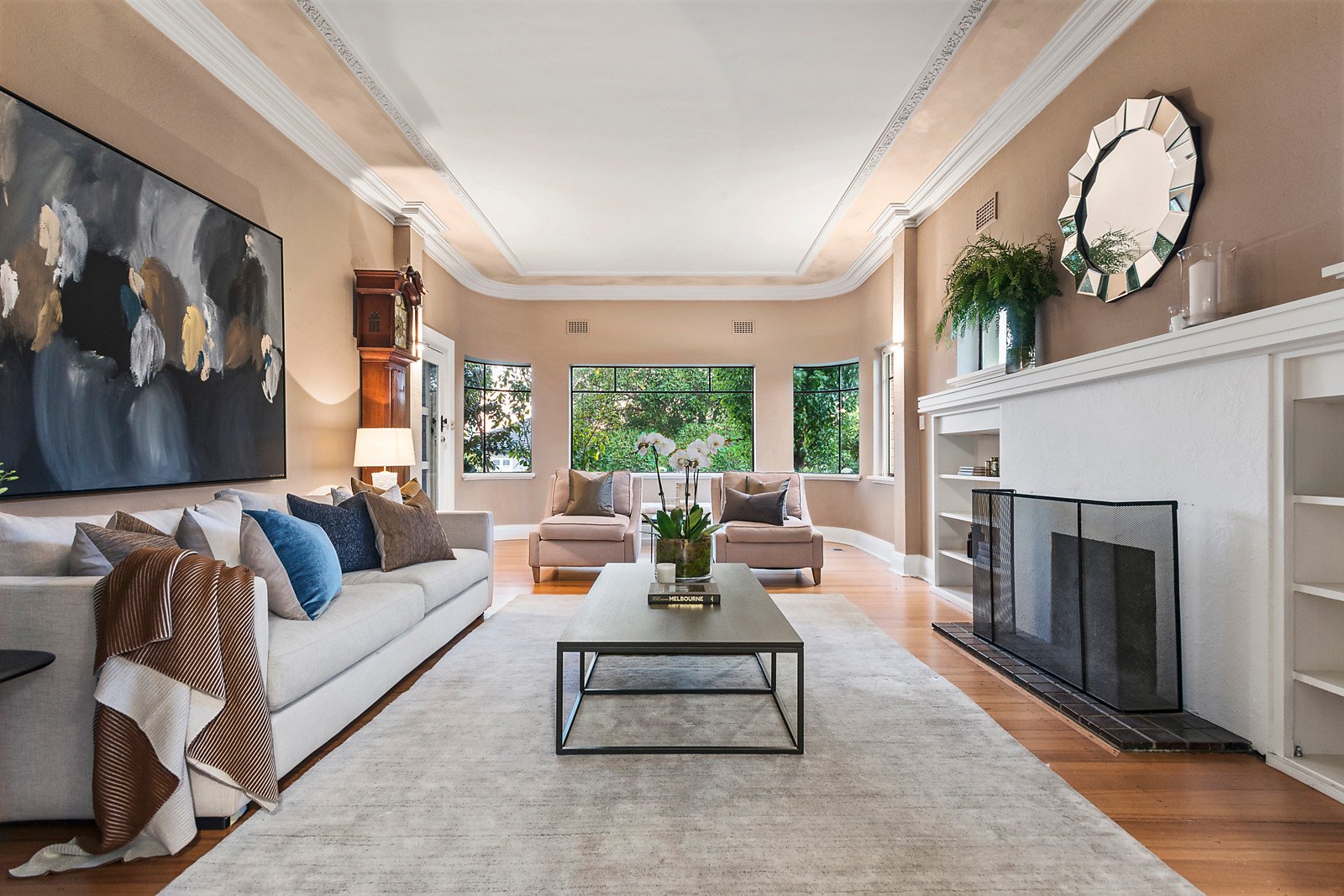 Behind a glorious terraced garden, the evocative exterior beautifully exemplifies nautical Art Deco design with soaring curved walls and windows. Once inside, the inviting light-filled interior spaces feature timber floors, etched glass and decorative ceilings through the wide entrance hall, generous living room with open fireplace and balcony and a fitted study or home office with fireplace. Bathed in northern light, the palatial living and dining room with a premium Gaggenau kitchen boasting a steamer, white stone benches, integrated Liebherr fridge/freezer and butler's pantry opens through bi-fold doors to the deep, picturesque private northwest garden with heated pool. A captivating downstairs main bedroom with built in robe and stunning en-suite opens to a private courtyard. Upstairs, a very spacious bedroom with dressing room, built in robe and balcony enjoys wonderful views to the Dandenongs. Two additional double bedrooms with built in robes are accompanied by a stylish bathroom.