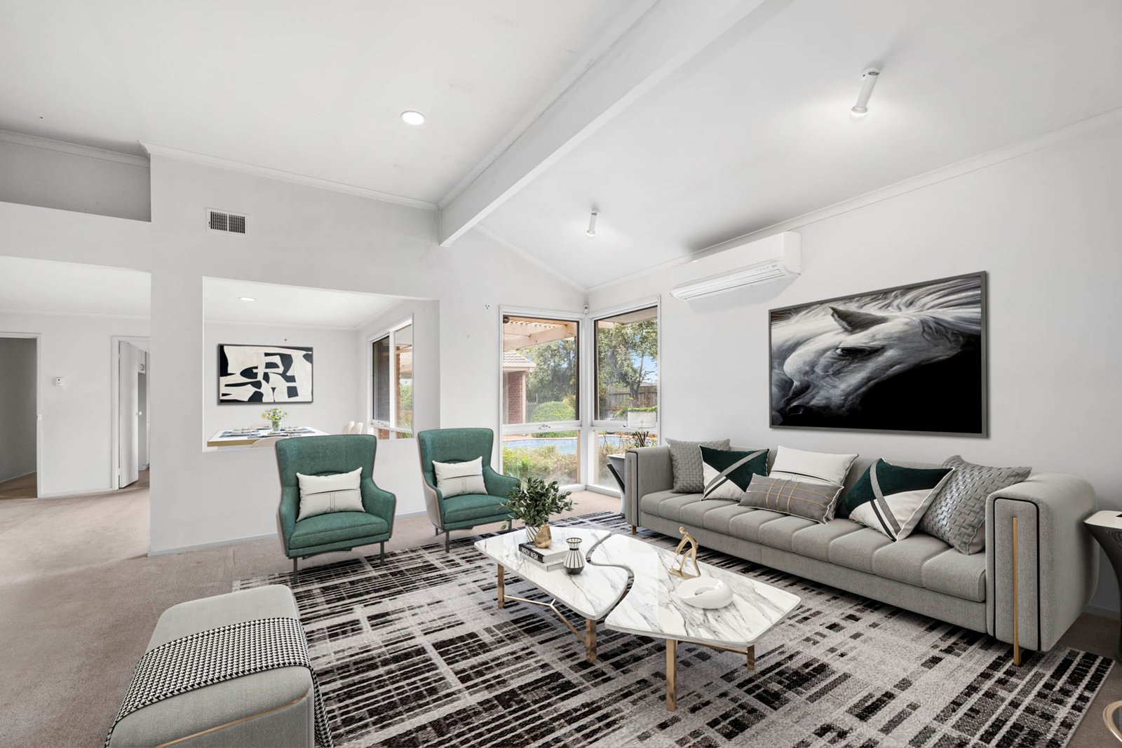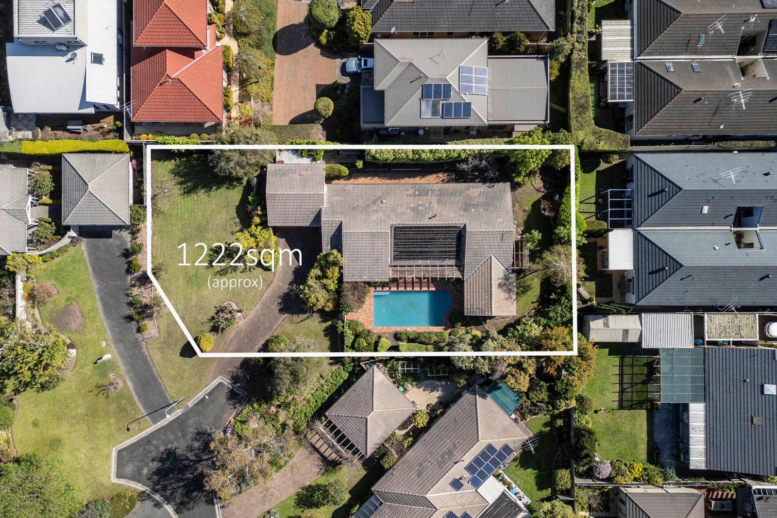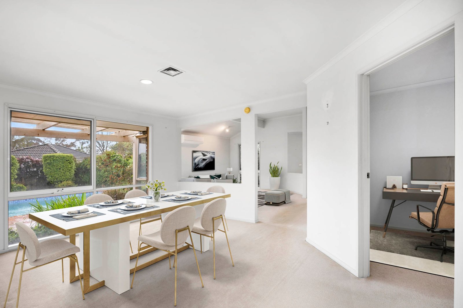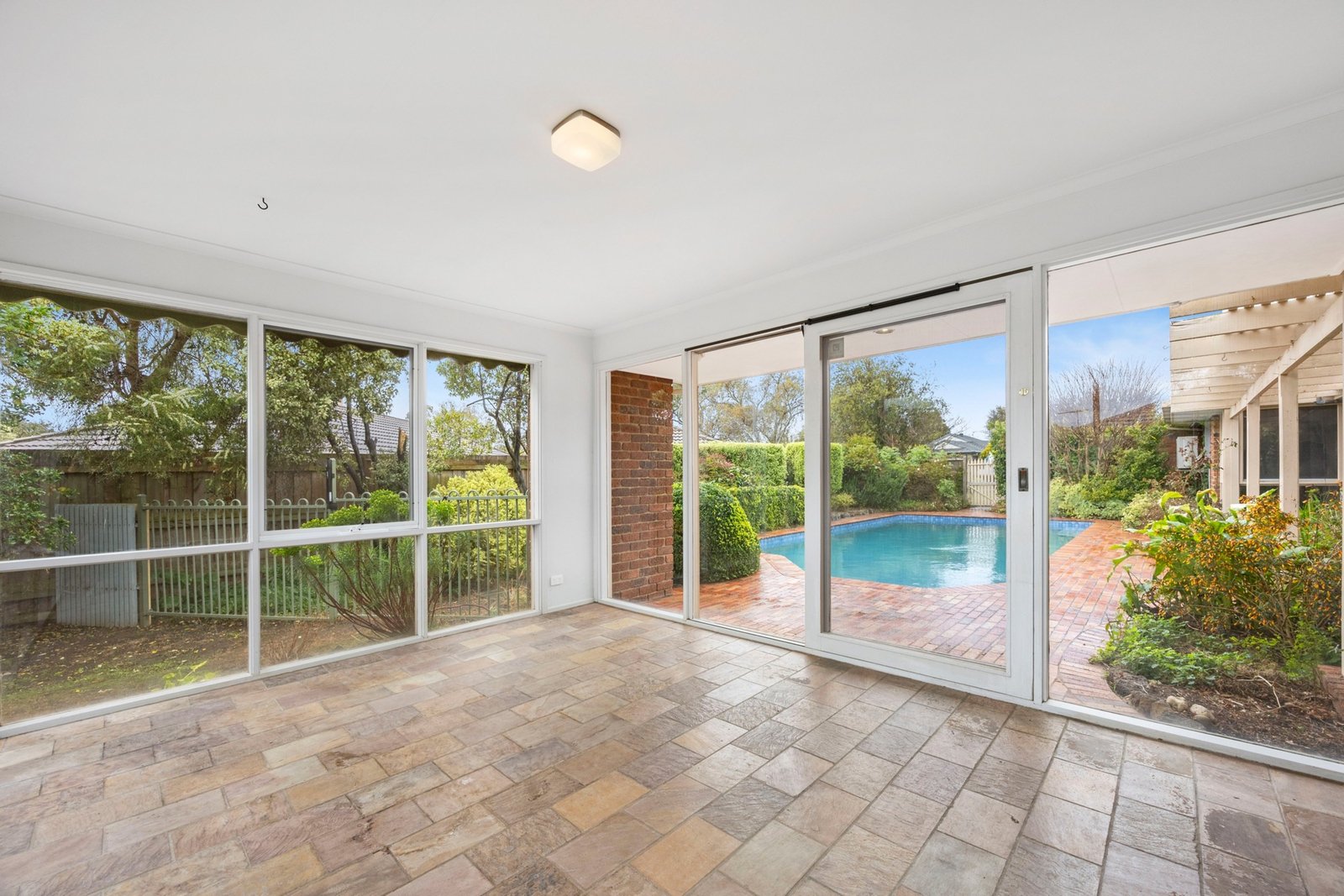 The open-plan design incorporates formal and informal living and dining areas, a central kitchen, and a covered enclosed alfresco/sunroom overlooking the fully tiled pool. The spacious main bedroom has a walk-in robe and ensuite, two further bedrooms with built-in robes, plus a study or fourth bedroom.