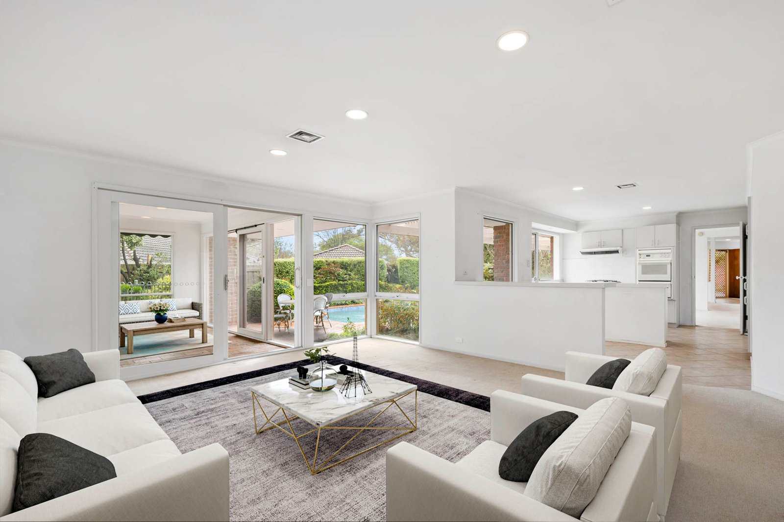 Situated on a flat block measuring 1,222* sqm (approx.) with a sunny north-easterly rear aspect and a sparkling in-ground swimming pool, the four-bedroom two-bathroom home boasts architectural features including vaulted ceilings and an abundance of glazing drawing in loads of natural light.
