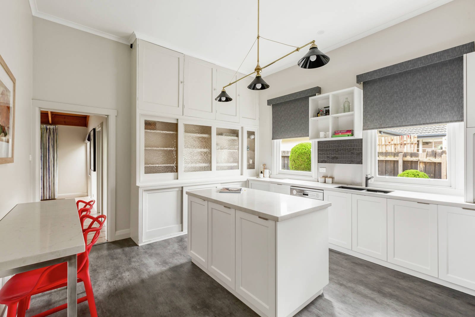 A broad verandah introduces the entrance hall and a gracious sitting and formal dining room featuring high ceilings, Baltic pine floors and a gas fireplace. A stunning central kitchen appointed with stone benches and premium appliances is conveniently positioned between the formal room and the expansive family living/dining room warmed by a roaring open fire. The living area opens to the private west-facing garden and pool. The four generous bedrooms and a home office or 5th bedroom are accompanied by two bright bathrooms.