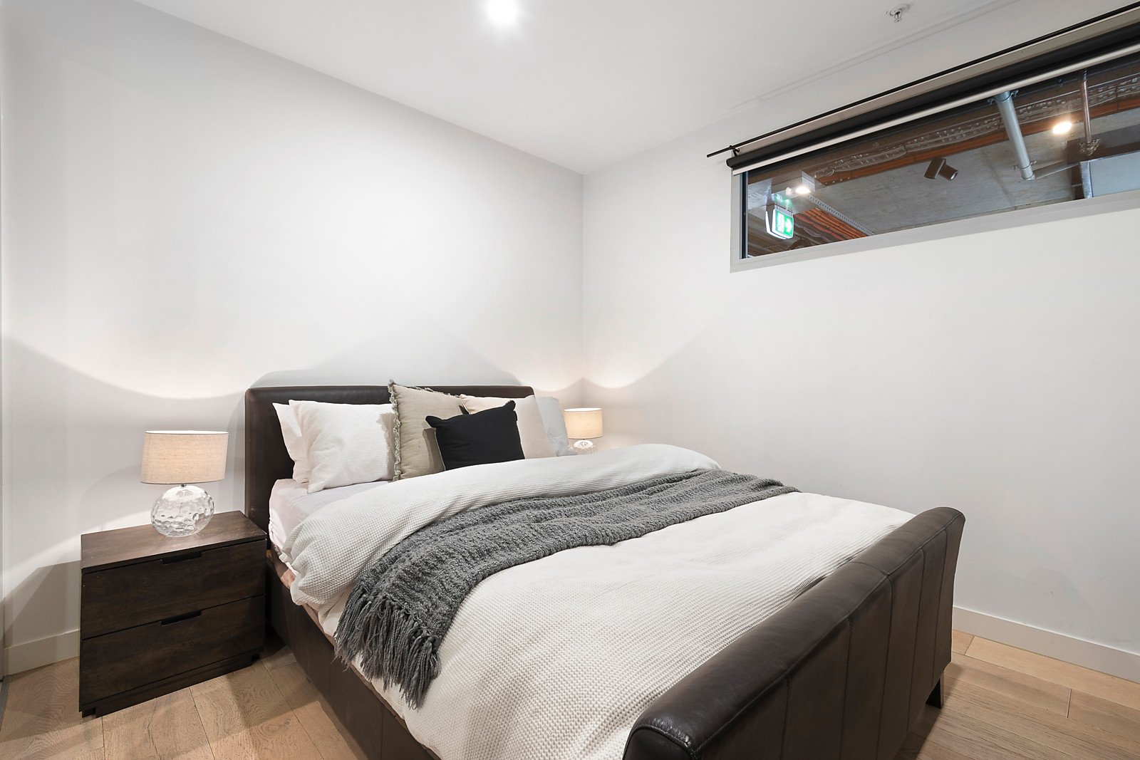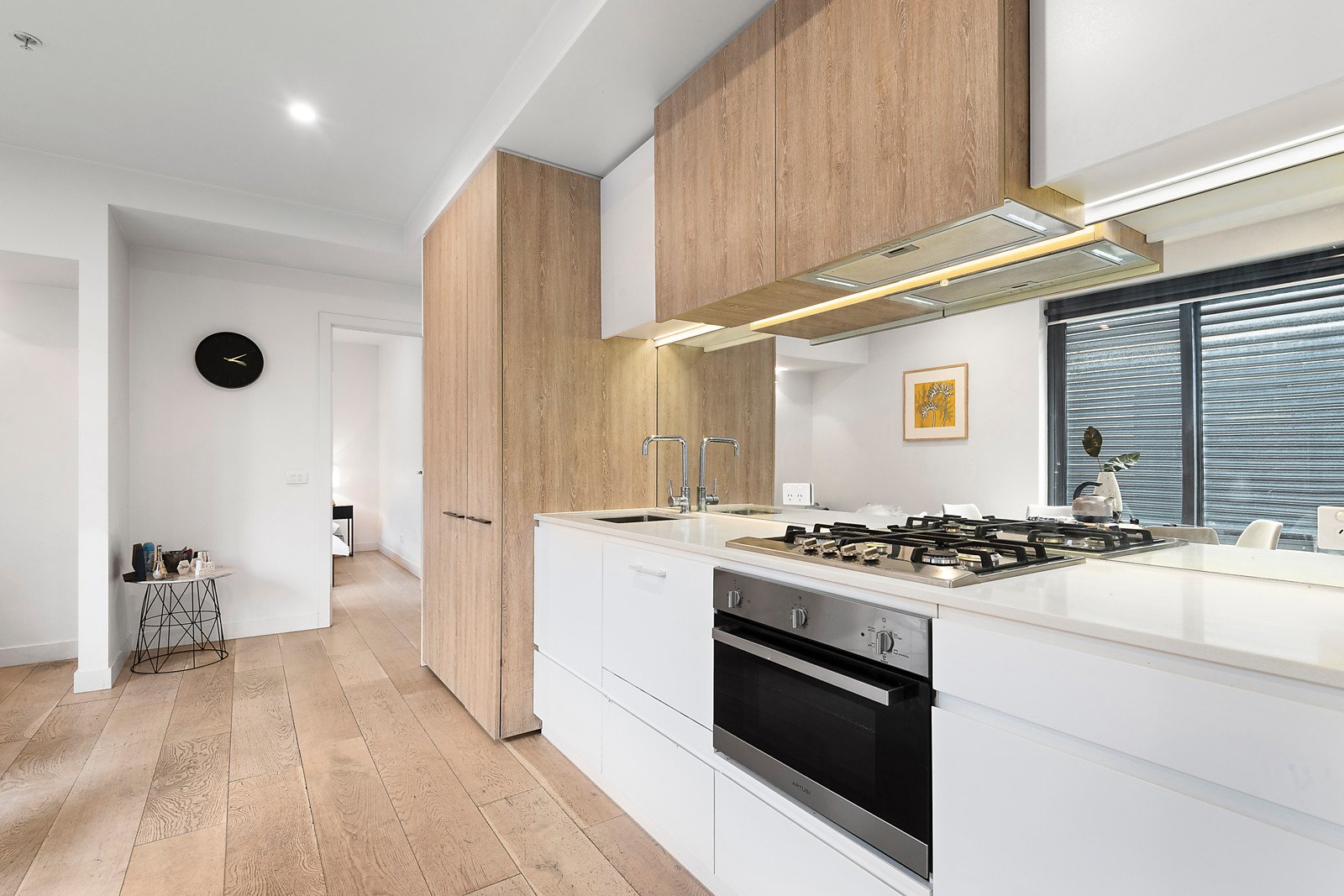 A low-profile, stone-finished, kitchen showcases quality appliances, a concealed refrigerator, under-mount sink, mirrored splash backs and soft-close cabinetry as open-plan living eases its way through double-glazed sliding glass doors to a generous balcony. Opened-up to embrace the late afternoon sun, this is a wonderful setting for an evening beverage. In this highly secure building with edgy industrial overtones, there is secure video entry, basement parking, a storage cage and elevator access. Additional features include a vogue bathroom with European laundry, reverse cycle heating / cooling and striking timber tone flooring.