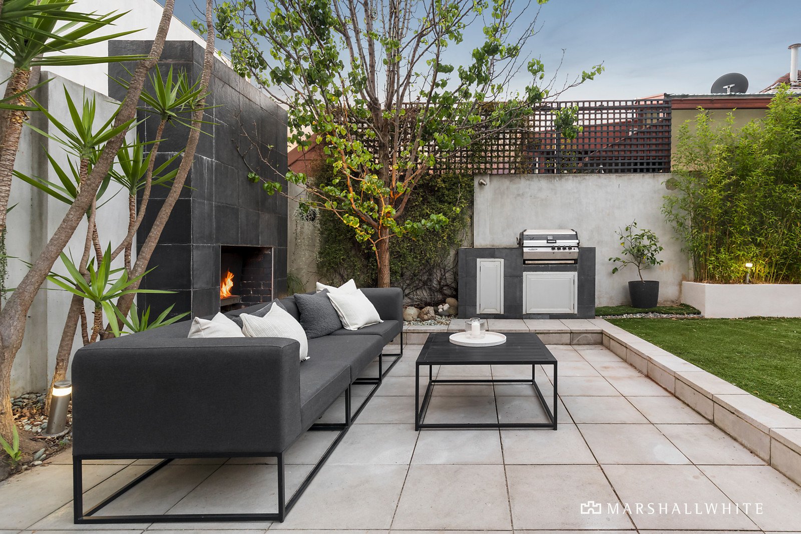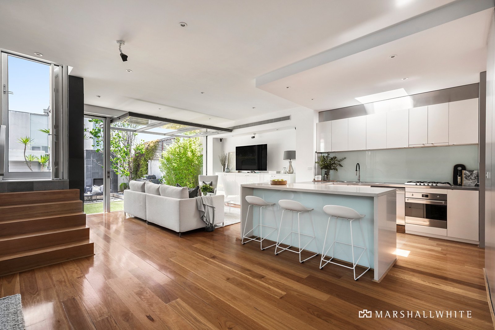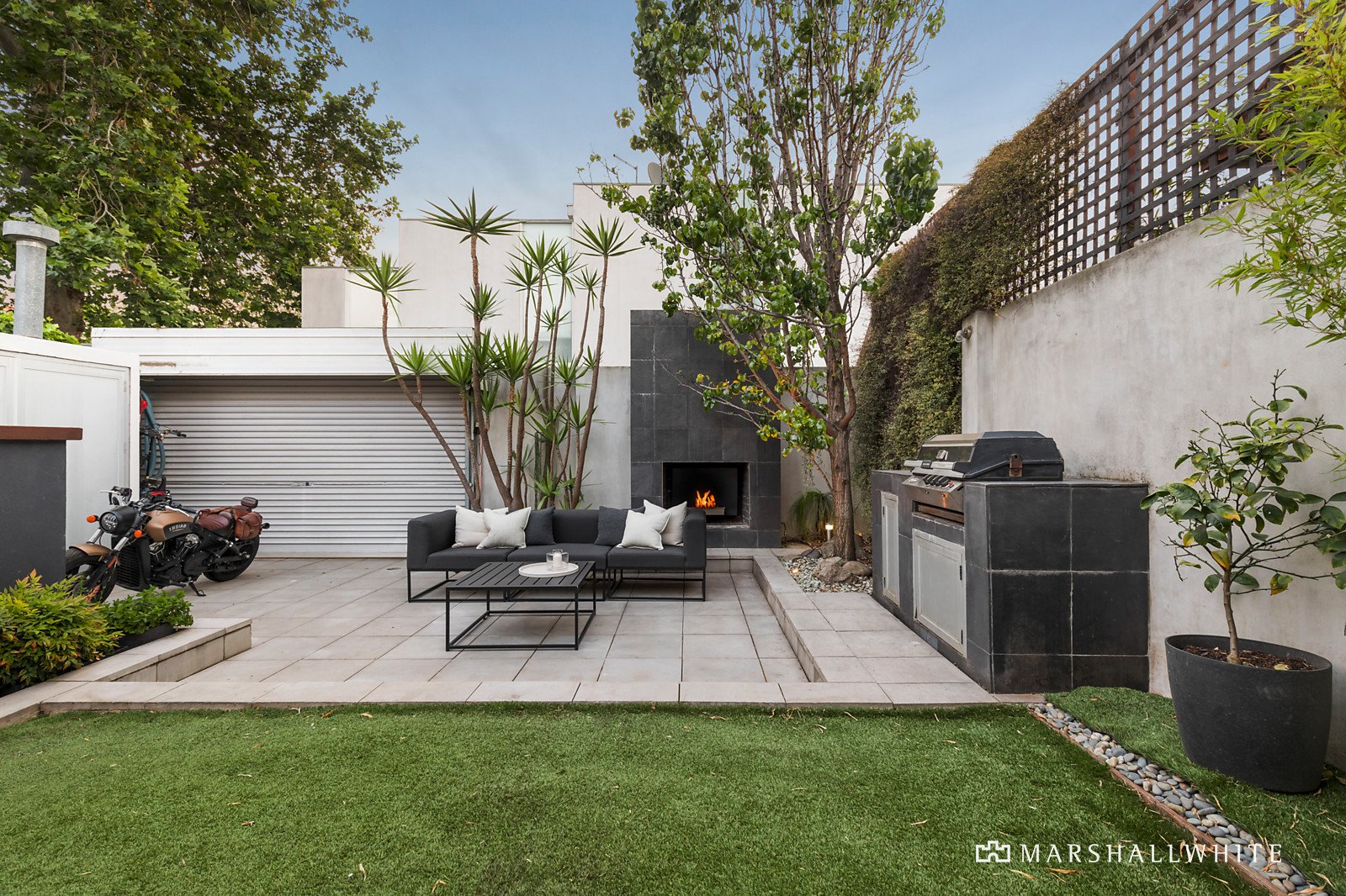 A spectacular full-height glass tilt window connects the living space to a private northwest facing paved courtyard and garden. Includes a built-in BBQ, sun terrace, open fireplace, gas-heated plunge pool with a waterfall feature, enabling elegant entertaining or relaxed family living.