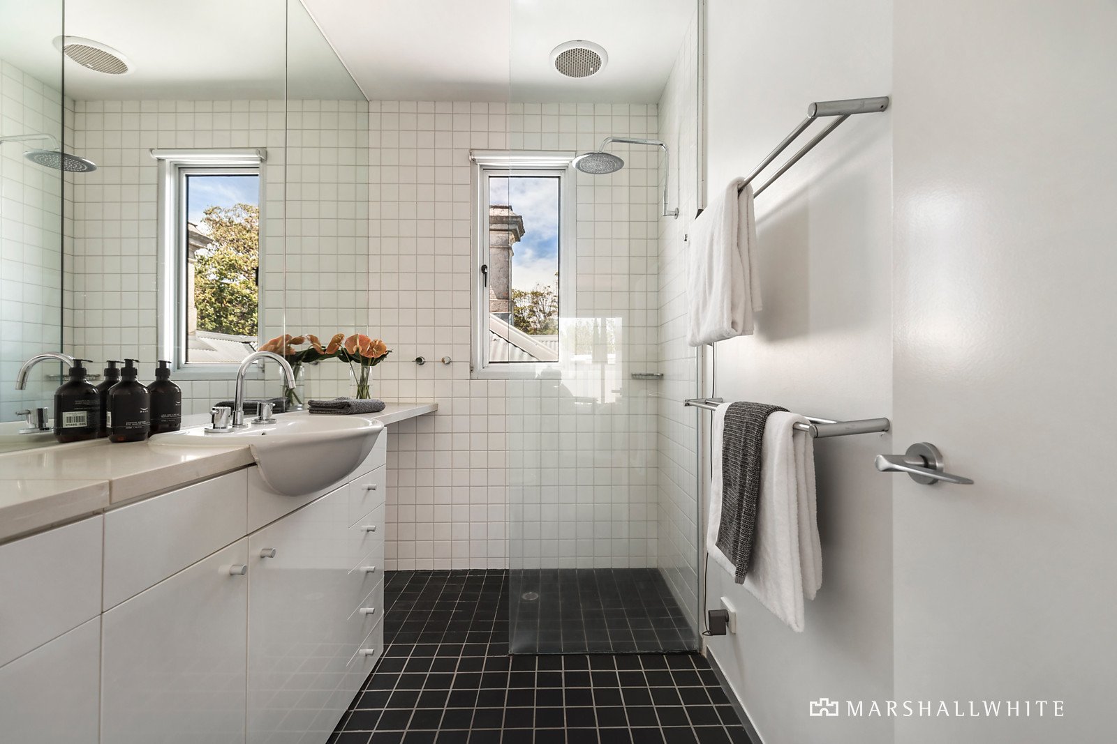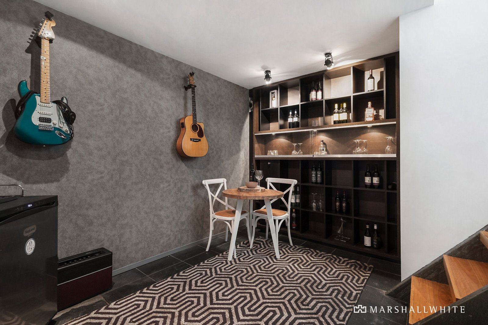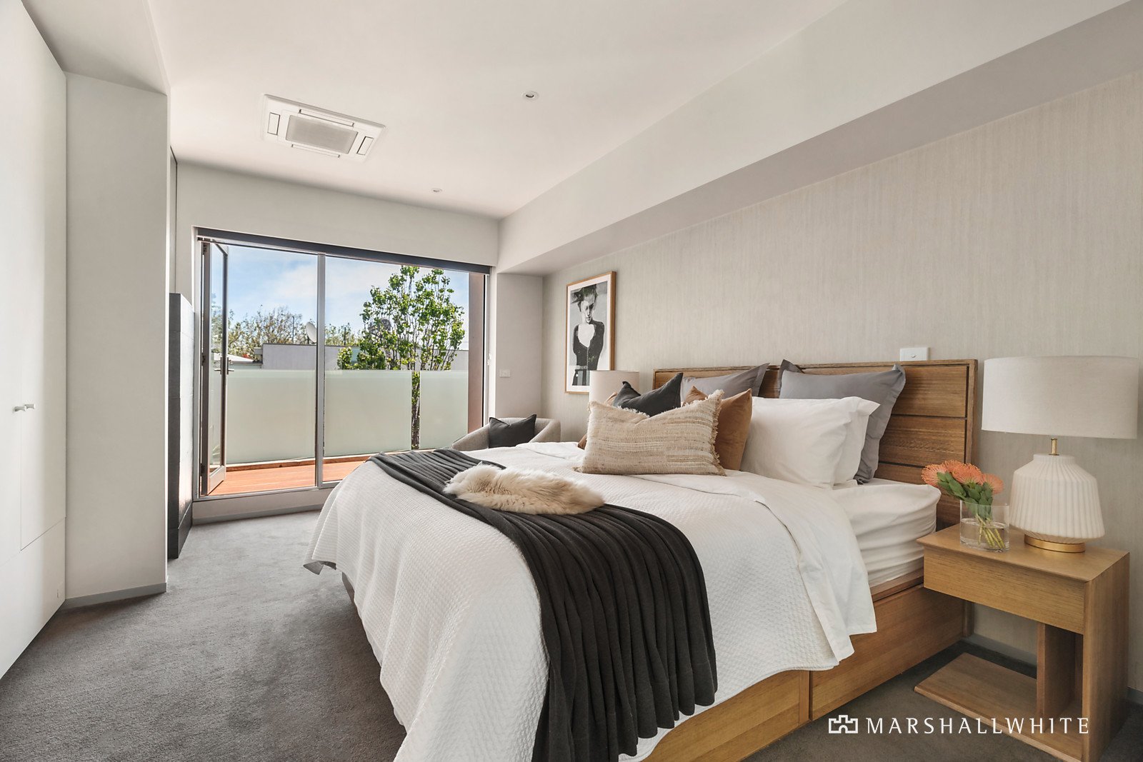 A spectacular full-height glass tilt window connects the living space to a private northwest facing paved courtyard and garden. Includes a built-in BBQ, sun terrace, open fireplace, gas-heated plunge pool with a waterfall feature, enabling elegant entertaining or relaxed family living.