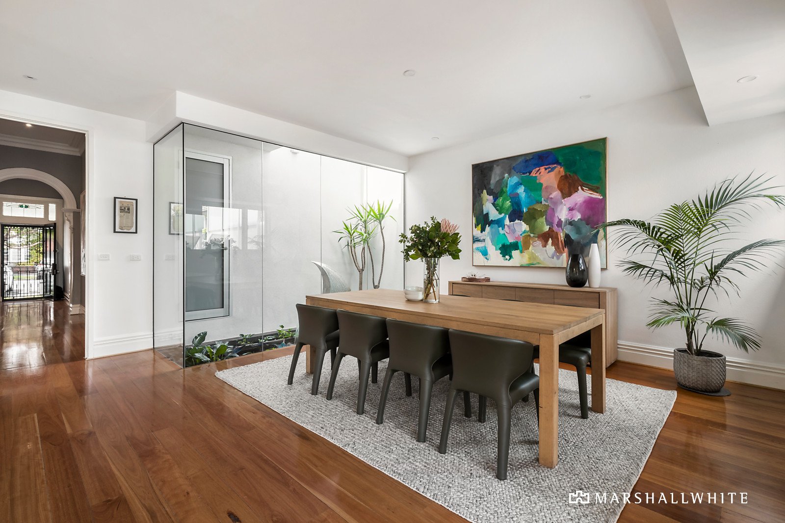 Solid Brushbox floors add a renewed tone to the traditional arched central hall flowing through to an expansive open plan living and dining room with an internal light-well and kitchen equipped with European appliances.