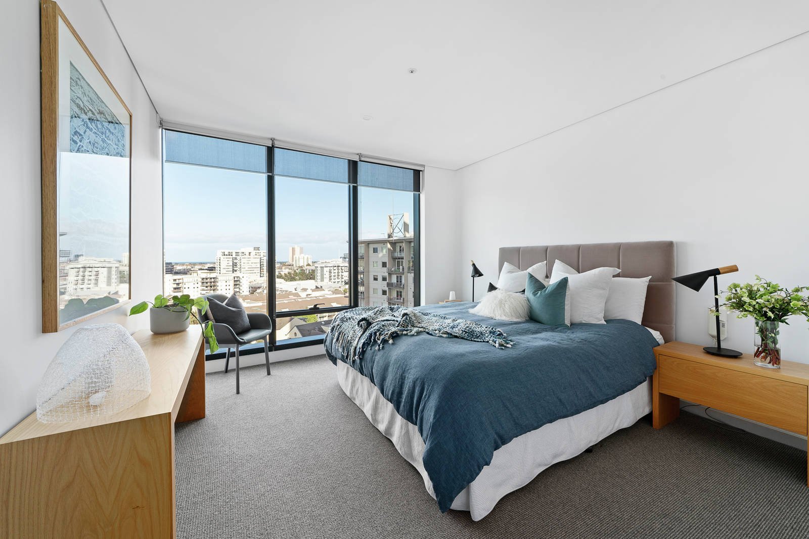 Sun-drenched and superbly spacious open plan living and dining areas with a large covered balcony are oriented to capture northern light and enjoy spectacular views to the city and gardens. The streamlined gourmet kitchen features stone benches, Miele appliances and integrated fridge/freezer. The generous main bedroom appointed with a designer en suite and built in robe, a second double bedroom with built in robe and stylish bathroom along with a third bedroom with robe all overlook Victoria Barracks with glimpses of the bay.