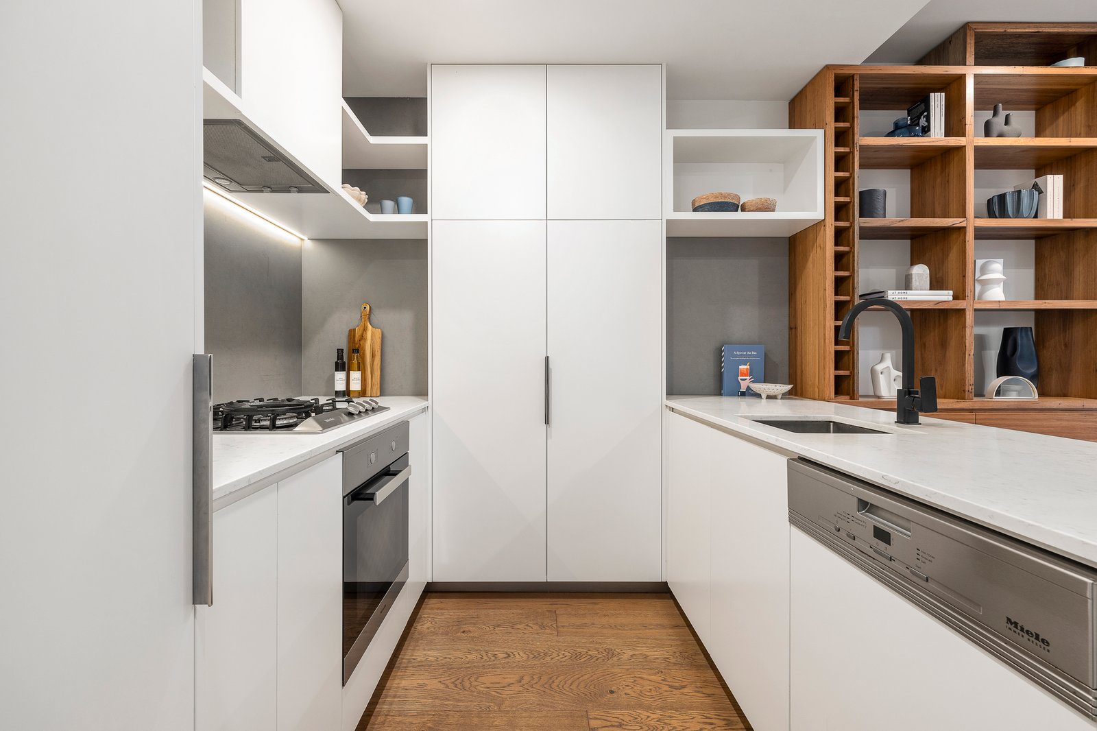 The heart of the apartment, the kitchen, features top-of-the-line Miele appliances, including a dishwasher, ensuring that every culinary need is met with both functionality and elegance. The open-plan living area, enhanced by reverse-cycle heating and cooling, offers a comfortable and inviting space that extends effortlessly onto the outdoor courtyards. These private outdoor areas provide an ideal setting for alfresco dining, relaxing, or entertaining guests.