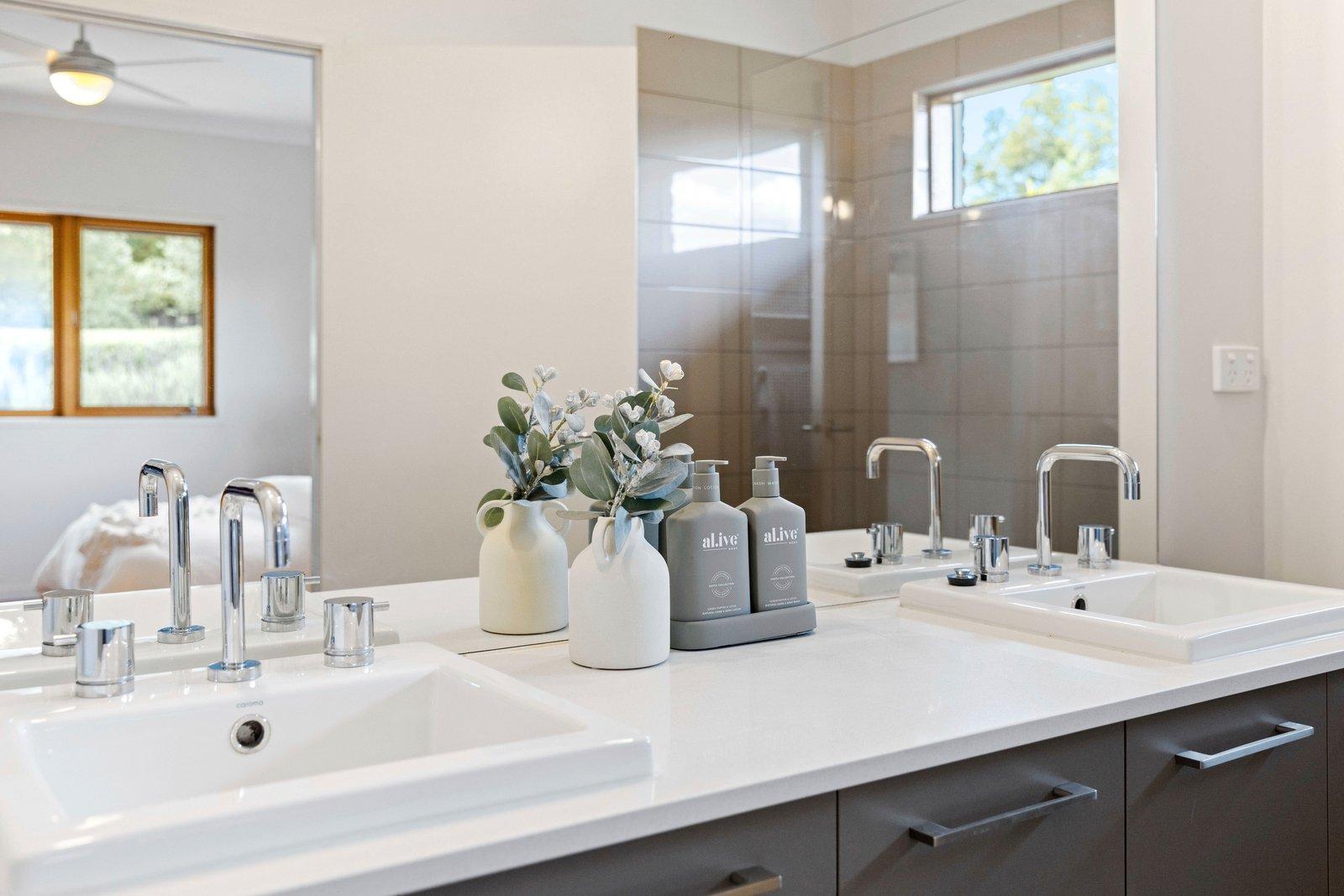 The passive solar design ensures year-round comfort, evident in the open-plan kitchen, living, and dining area. High-end appliances, a walk-in pantry, and lavish stone benchtops complement the free-flowing and north-facing living/alfresco spaces.