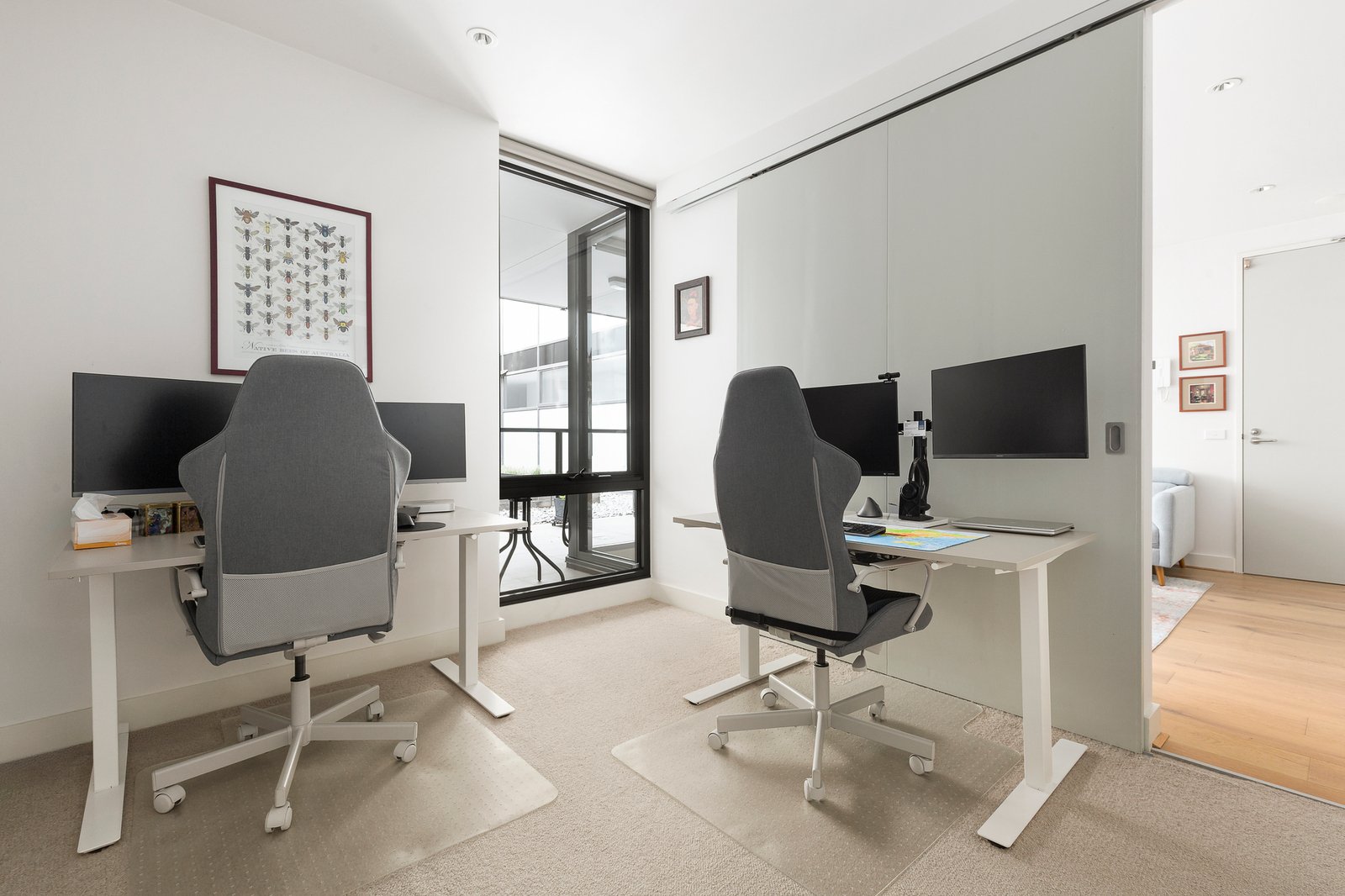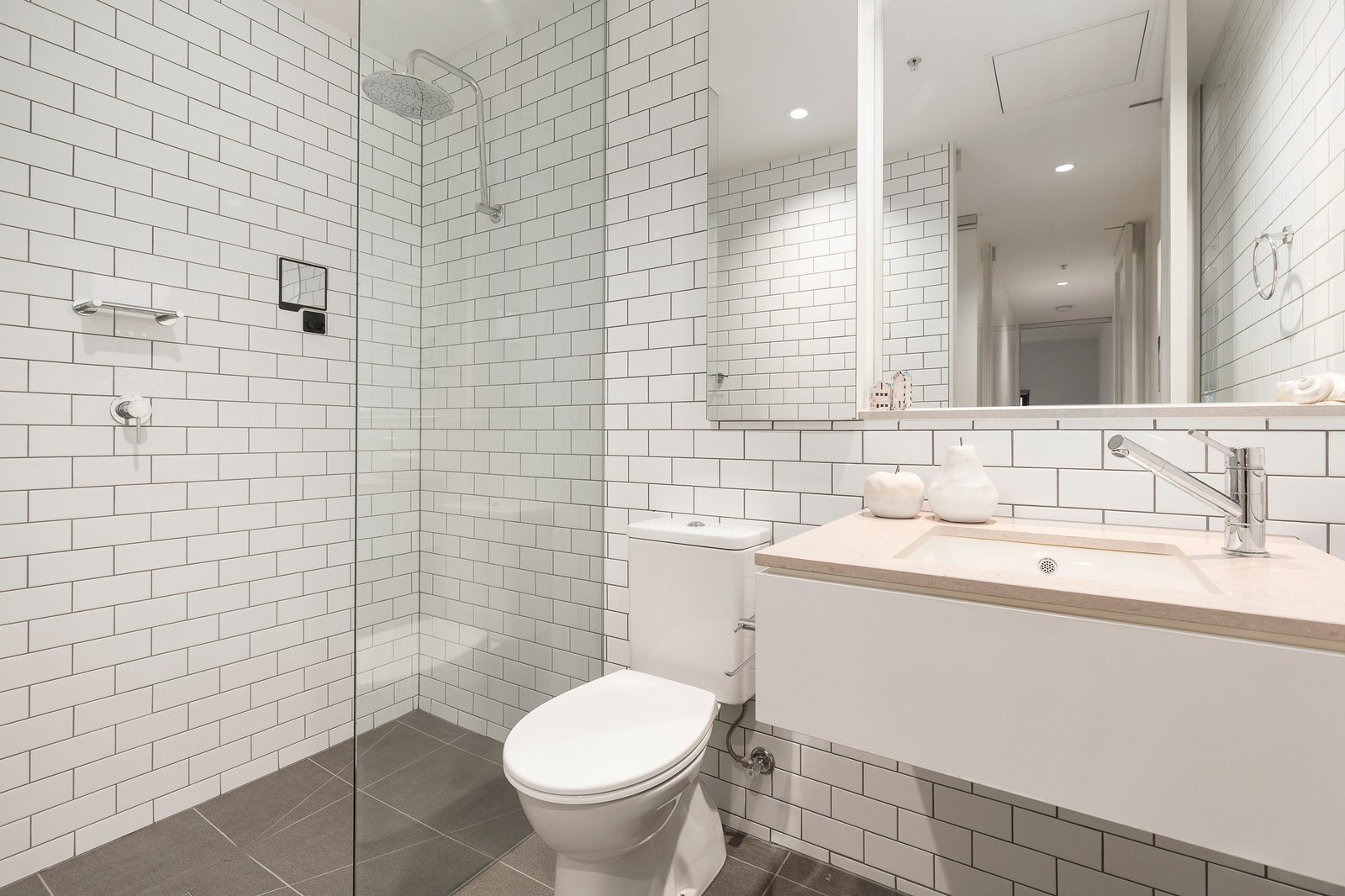 Inside, refined interiors reveal stone benchtops, Smeg cooking, an integrated refrigerator and dishwasher, as open-plan living with engineered Oak underfoot flows effortlessly through floor-to-ceiling double-glazed doors to the terrace. The fully-tiled bathroom is a stylish showpiece, complemented by a separate powder room with a rare second toilet – an exceptional feature in a two-bedroom home. Additional highlights include built-in robes, secure basement parking, a storage unit, video entry, a fob-activated elevator and split system heating/air conditioning.