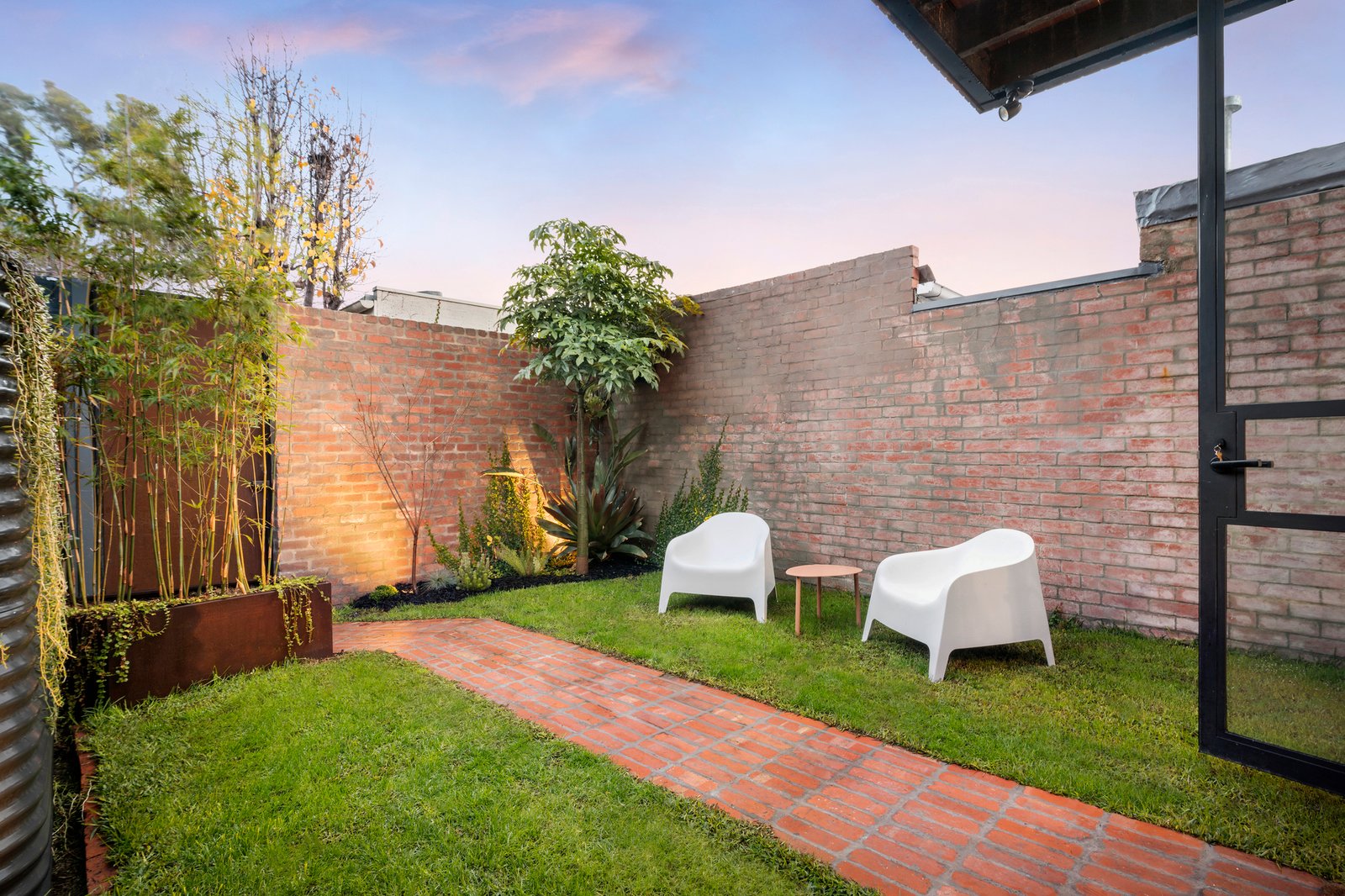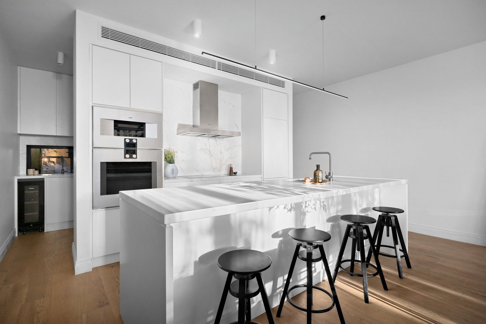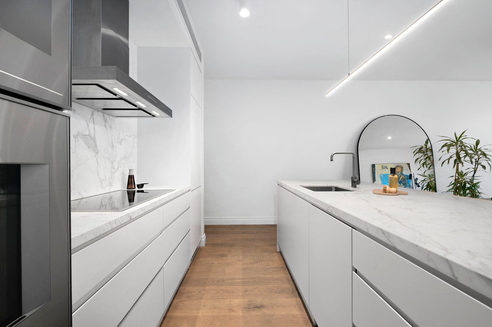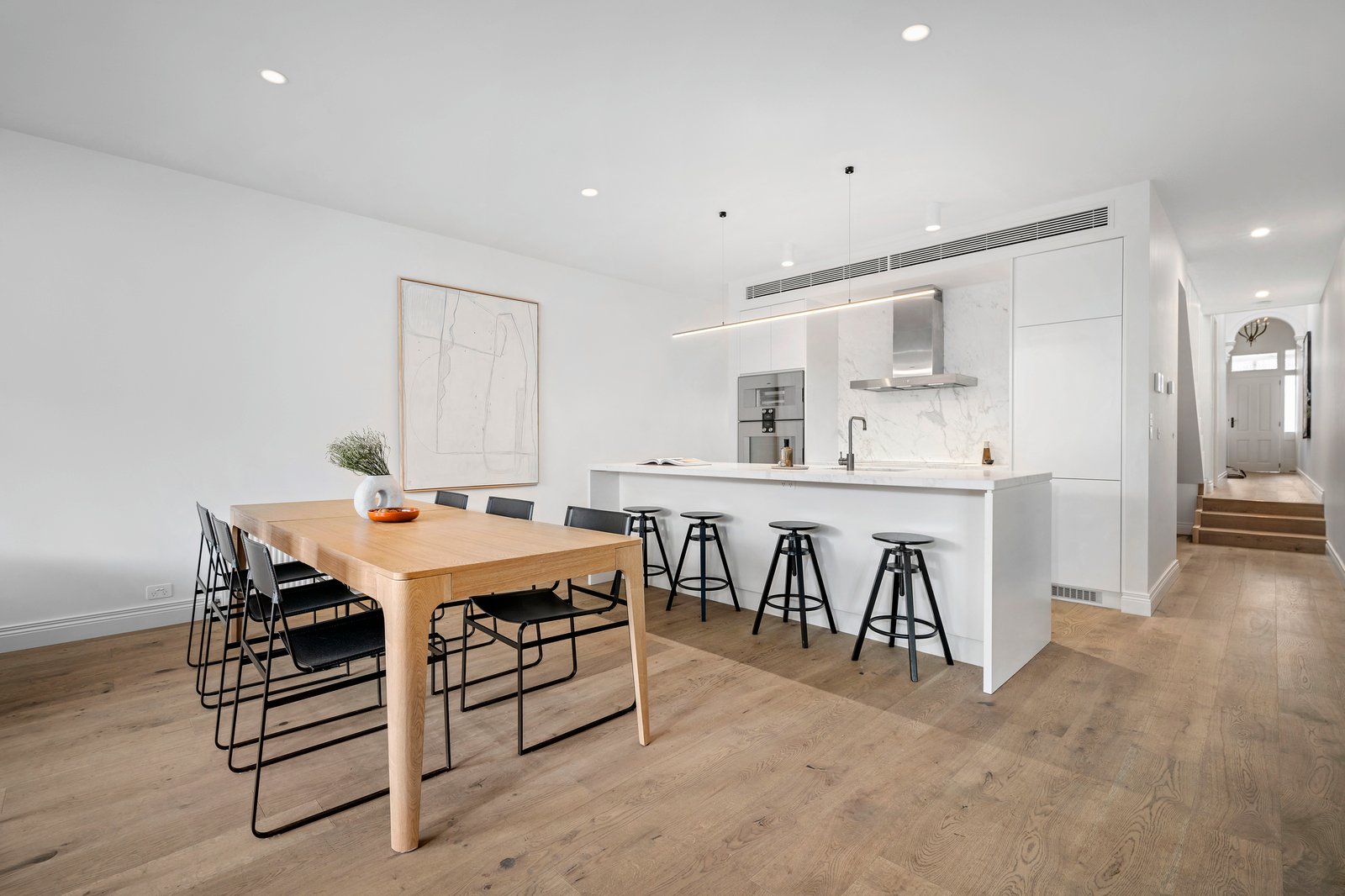 Across two meticulously crafted levels, the interiors radiate an air of refined sophistication, introduced by a traditionally styled sky-lit arched hallway that elegantly bridges the gap between classic and contemporary, leading to expansive open-plan living and dining spaces at the rear. The marble kitchen, outfitted with premium Gaggenau appliances and a butler's pantry, is a striking centrepiece for entertaining, seamlessly connecting through steel-framed French doors to a tranquil garden terrace, a secluded and private retreat that is also accessible via the rear laneway.