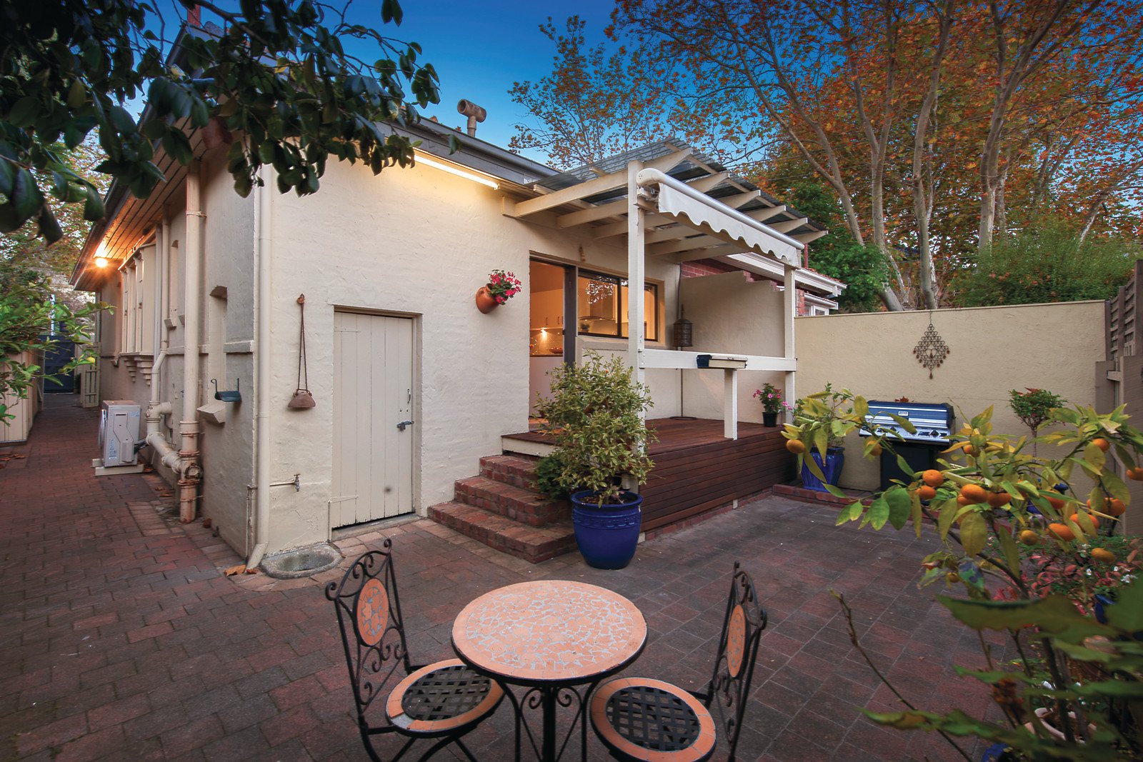 Behind a high walled garden, the timber hall boasting ornate ceilings introduces two bright and spacious bedrooms and a stylish bathroom. The generous living and dining room with an open fireplace and timber floors and the well-equipped modern kitchen with stainless steel oven open to a west facing private garden with covered deck.