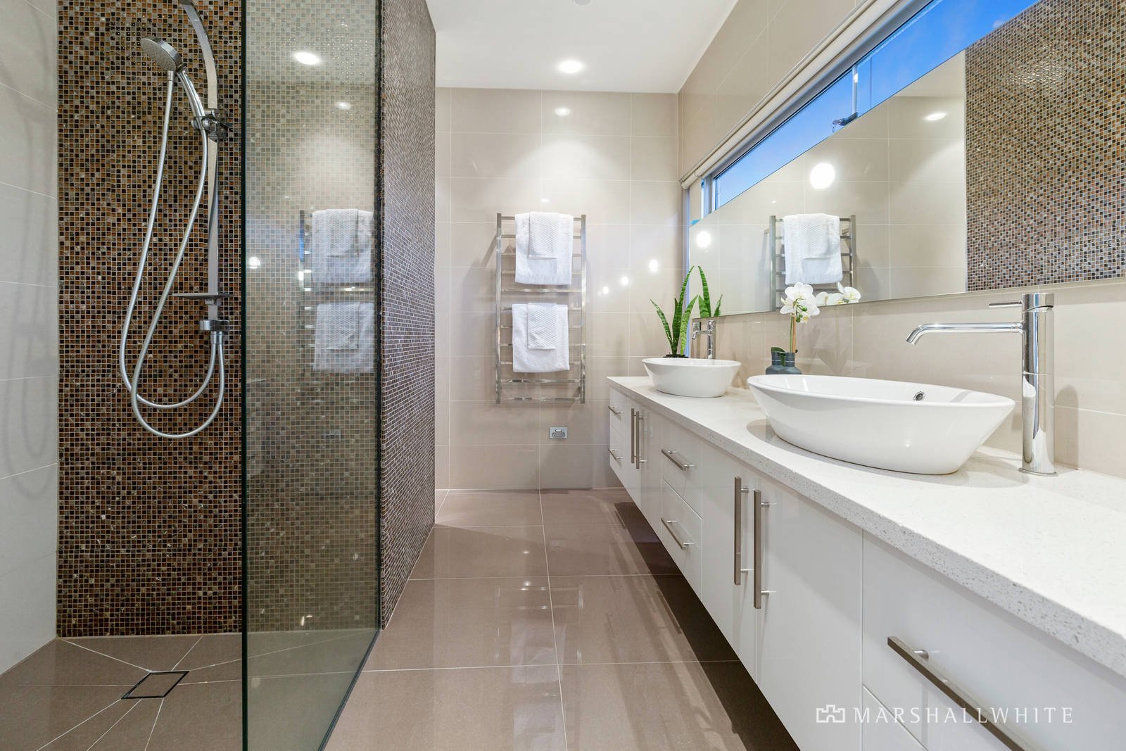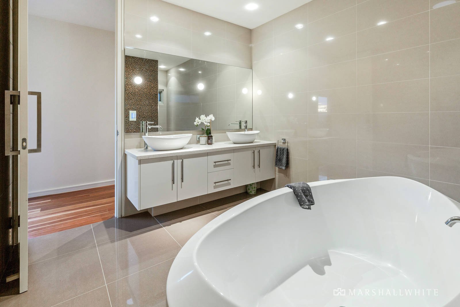 The separately zoned main bedroom suite has a luxe fully tiled ensuite with double-vanity and shower, and walk-in robe, plus a sliding door opening poolside.