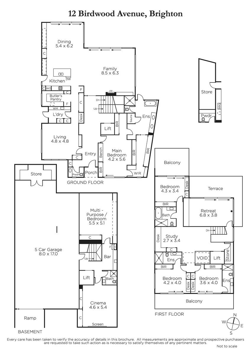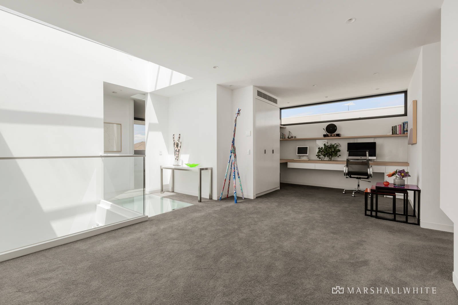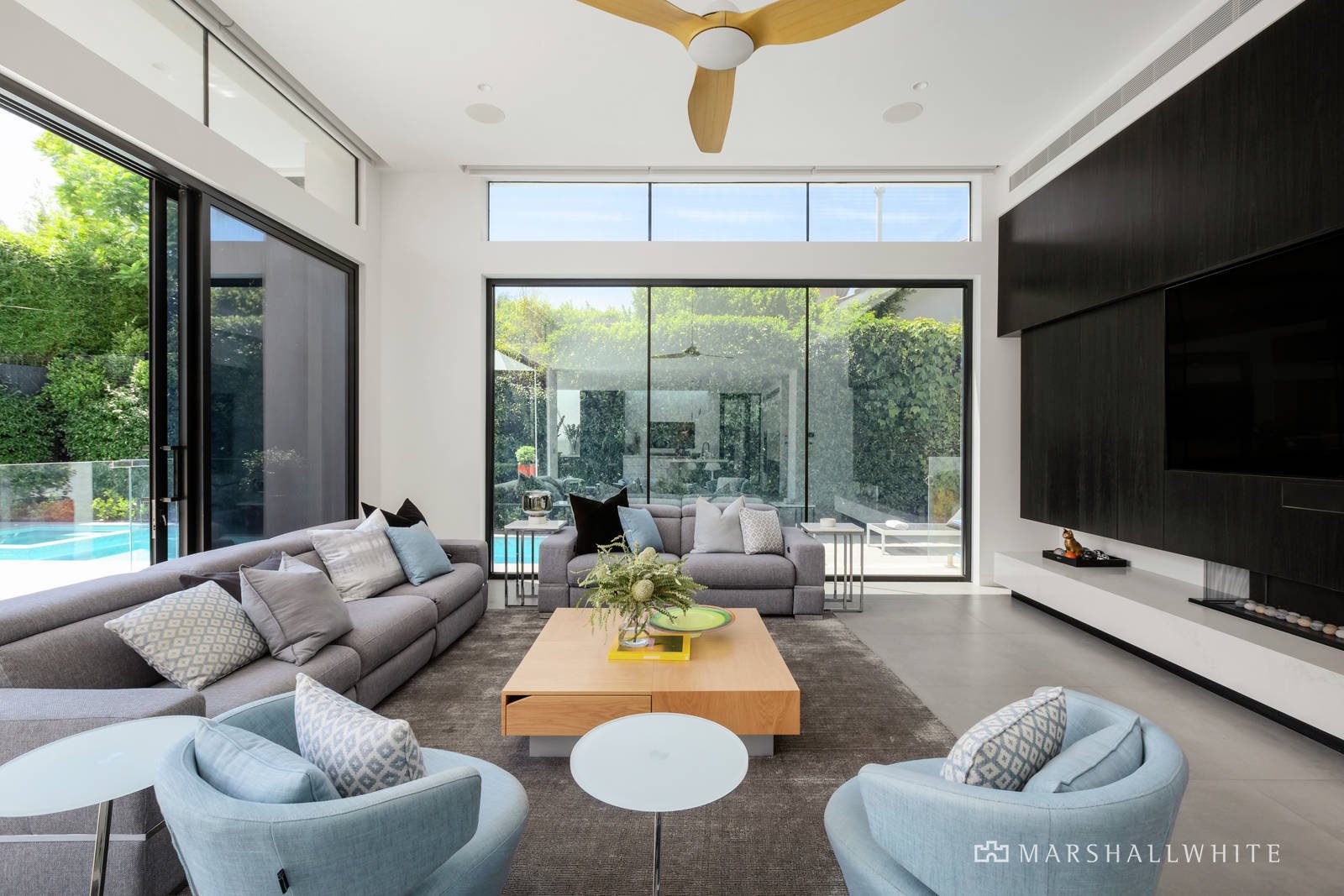 The perfect lifestyle home brings outstanding design, a no-expense spared interior and state-of-the-art home automation to one of Brighton's finest beachside streets. Like-new and luxuriously appointed, this excels for family living and large-scale entertaining. The Jack Merlo-designed garden with a pool and spa adds a resort vibe to this custom-crafted hideaway. Three lift-accessed levels feature up to five living zones, five bedrooms and a large home office, five bathrooms, and a five-car basement garage. Enter via the statement pivot glass door and discover a large family room and dining zone full of light and luxury, a zoned lounge, basement cinema, a multipurpose room that can be your games room, gym or au pair/grandparents' residence, and a large upstairs retreat with city views. Cooking for family and friends is so much easier with metres of streamlined storage in the state-of-the-art kitchen and butler's pantry. There're two ovens and a Smeg induction cooktop, two dishwashers, Zip tap, extensive refrigeration and automated cabinetry. Premium inclusions are everywhere, including the main bedroom's large ensuite and dressing areas. They feature an infrared sauna with its own TV, direct garden access and views, marble feature tiles, a Kaldewei spa bath, and plenty of wardrobe space. Enjoy a five-star movie experience in the surround sound cinema, watch the New Year's Eve fireworks from the large upstairs terrace, and appreciate the privacy of this exclusive home. This is the perfect entertainer's paradise with everything from a built-in Weber barbecue to a cocktail cabinet in the dining room, a kitchenette next to the cinema, and a gourmet garden with lemons, passionfruit and bay leaves. High-tech and high-end features include keyless entry, a self-cleaning pool and spa, slab hydronic heating, a glass floor, and extensive security. Take the time to see this ultra-indulgent domain, with easy access from Martin Street and the bay metres away.