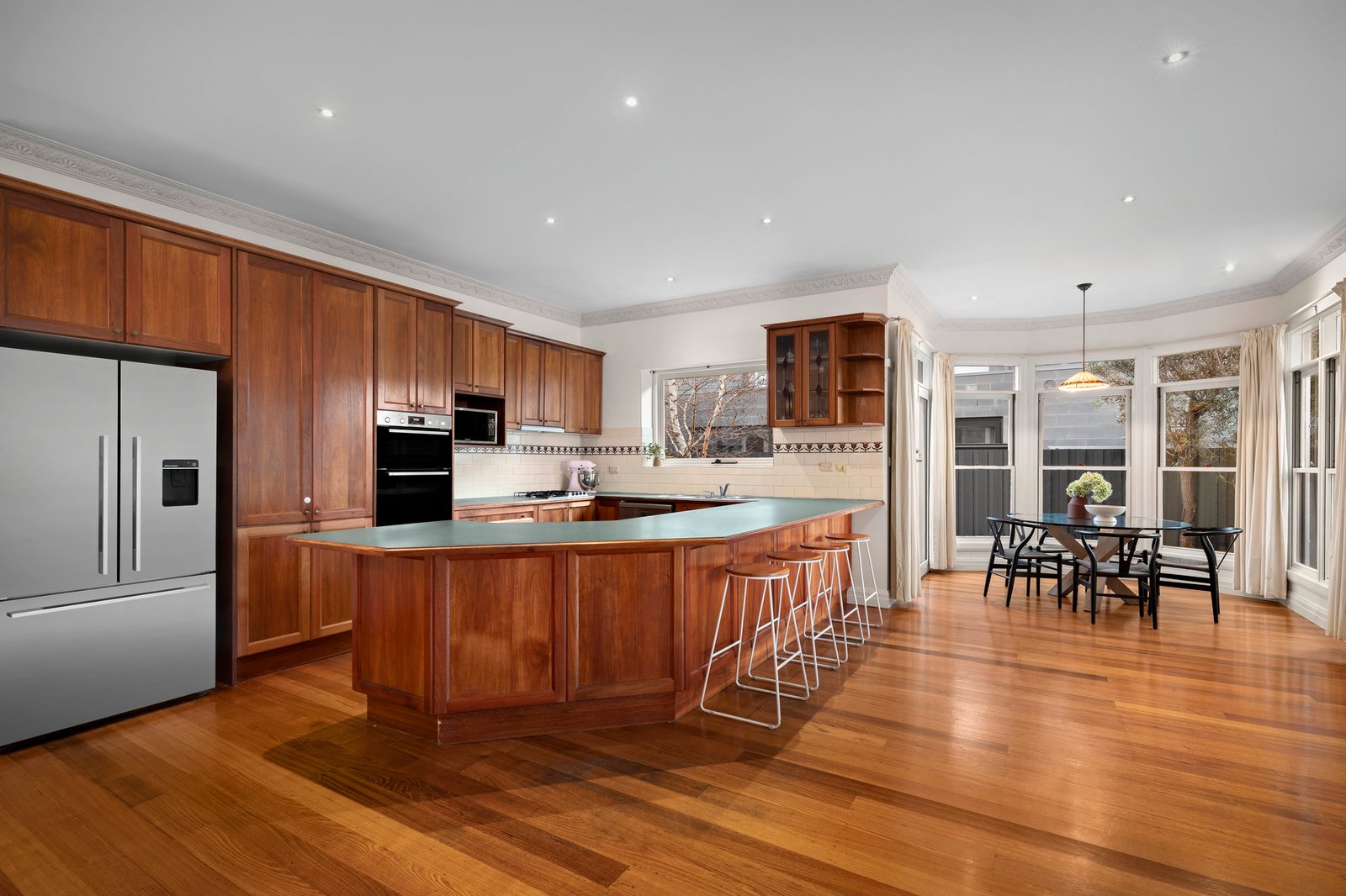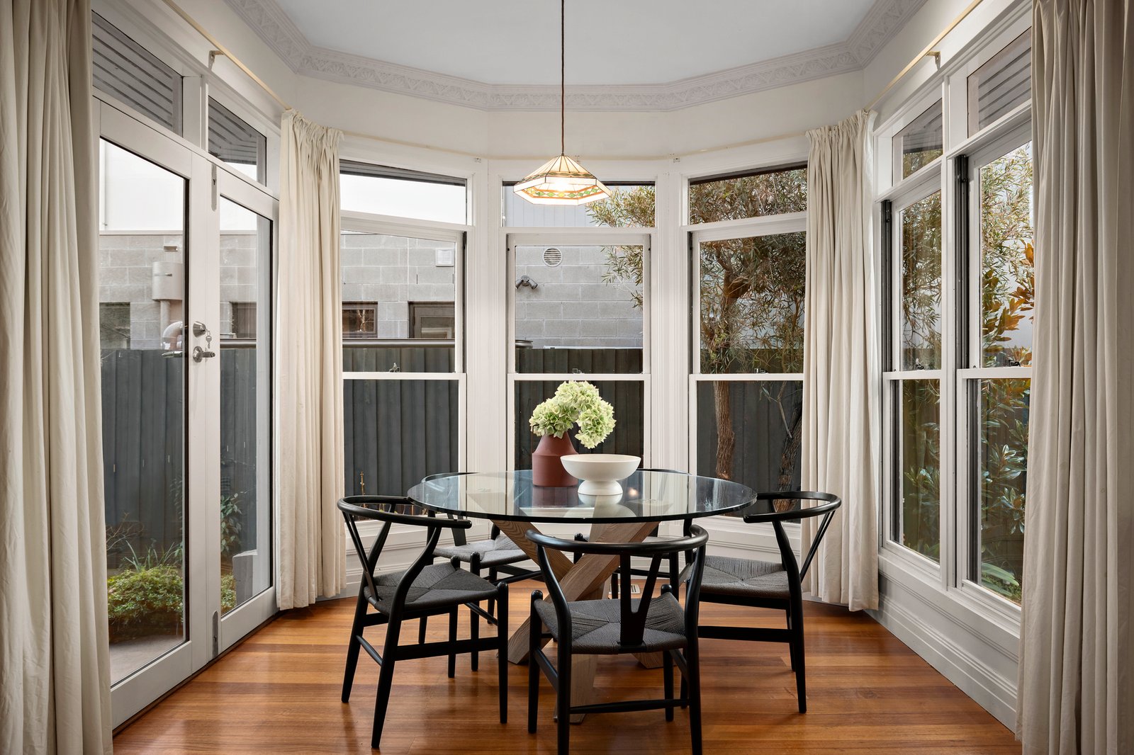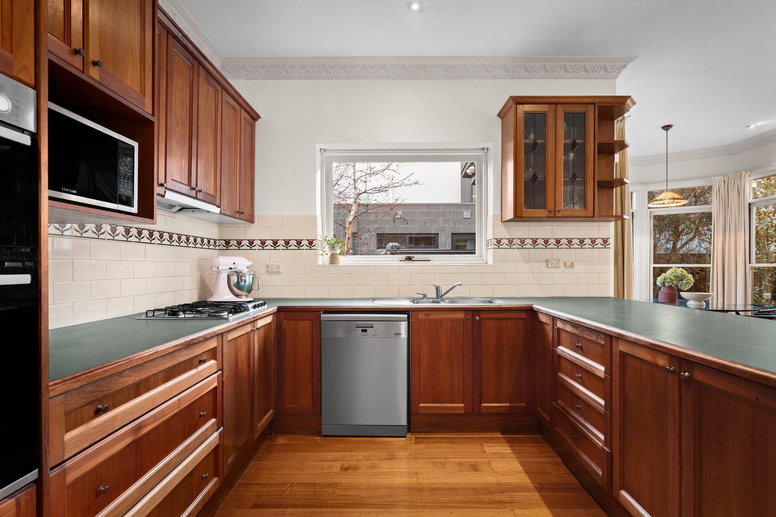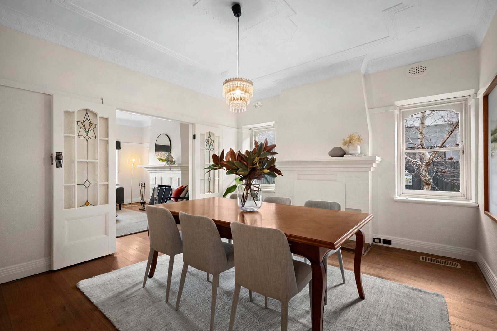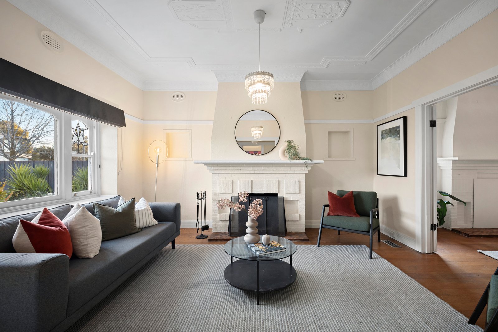 High ceilings and period characteristics accentuate the formal living and dining rooms while the open plan family room is defined by a graceful connection with outside, perfect for everyday enjoyment as well as easy entertaining. Multiple sash windows encase the dining zone, and the living zone leads to a study space, ideal for working from home. A gorgeous main bedroom features a tranquil garden view, a walk-in robe, semi-ensuite bathroom and good separation from the remaining three robed bedrooms. Outside an undercover elevated alfresco zone overlooks the lawn and compelling north-facing orientation adds considerable appeal.