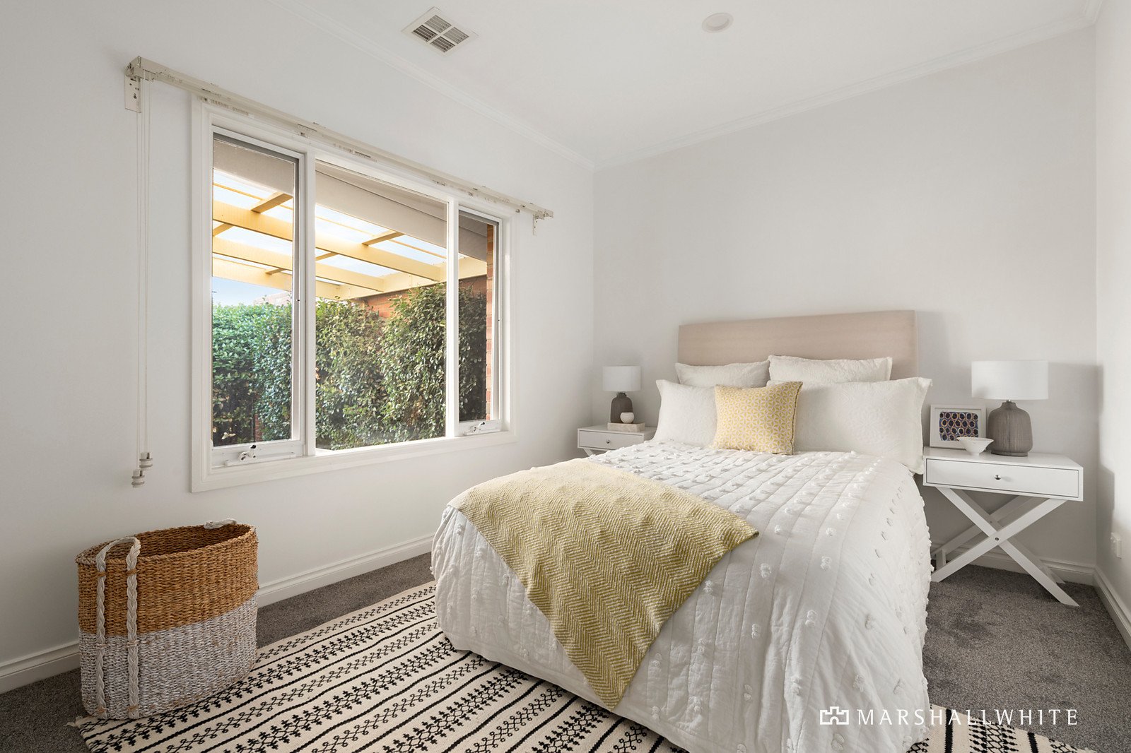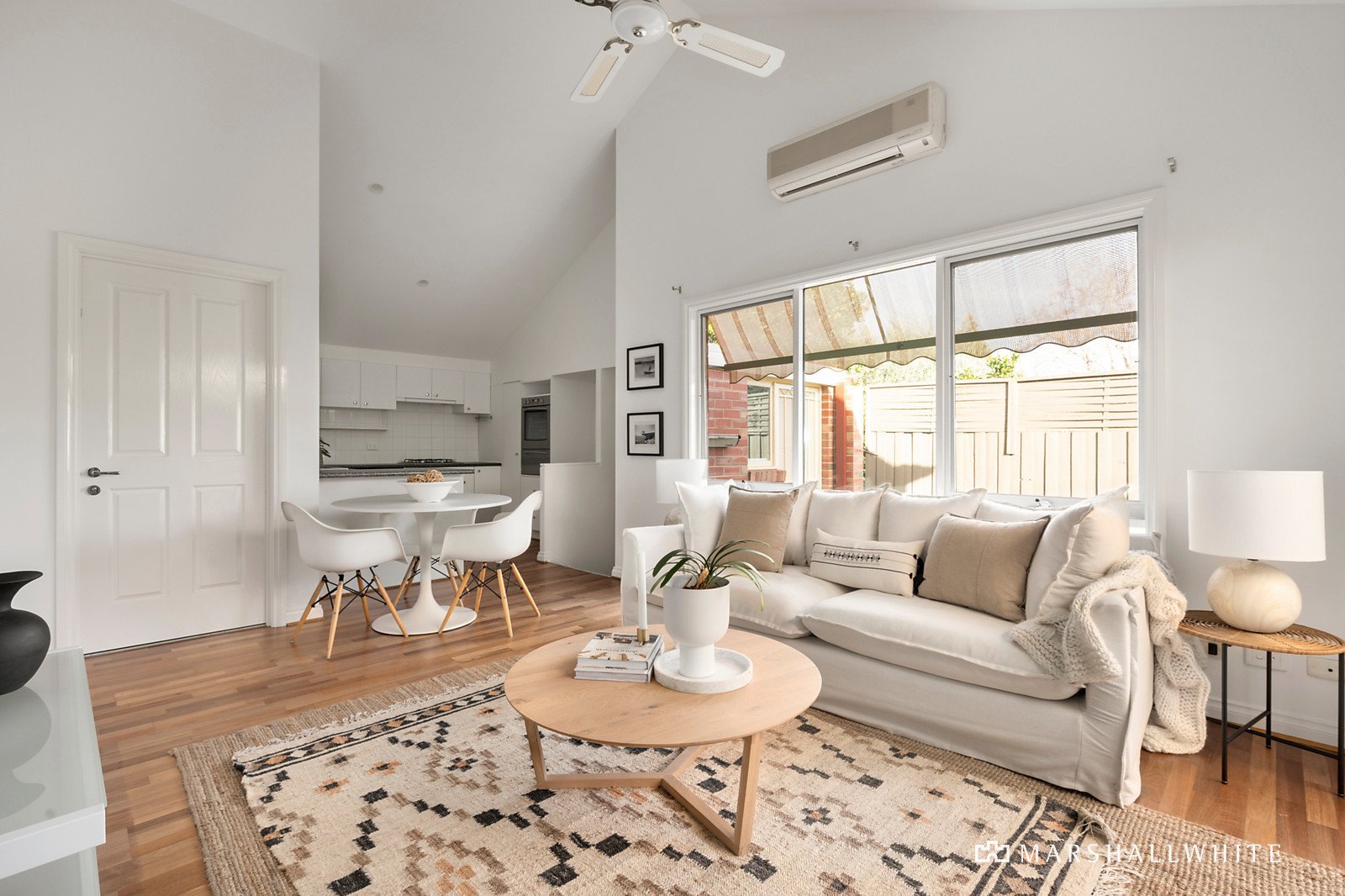 Preceded by a picket fence and a line of standard Iceberg roses this immaculate contemporary California Bungalow-style single level townhouse benefits from modern design principles and space utilisation. Featuring a light and bright interior with a fresh white decor hallway leading to a sitting room with a box bay window, two bedrooms both with built-in robes, main with a box bay window and dual access sky-lit bathroom. Through to a spacious family room including a stylish kitchen equipped with Euro stainless steel appliances and an adjacent laundry. Flowing to a covered outdoor dining area and courtyard garden - offering a delightful space for alfresco relaxation with family or friends. Other features include easy care gardens, new carpets, ducted heating & cooling, quality fixtures & fittings, R/C air conditioner and an overhead fan in the family living room and a remote garage with internal access.