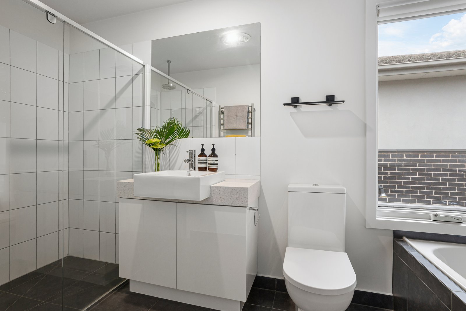 With one bedroom (or study/living area) and powder room on the ground floor, and a further three split over the top levels, there’s plenty of room to spread out. The main bedroom has a double basin ensuite and built-in robes, while an additional family bathroom takes the pressure off the morning rush out the door.