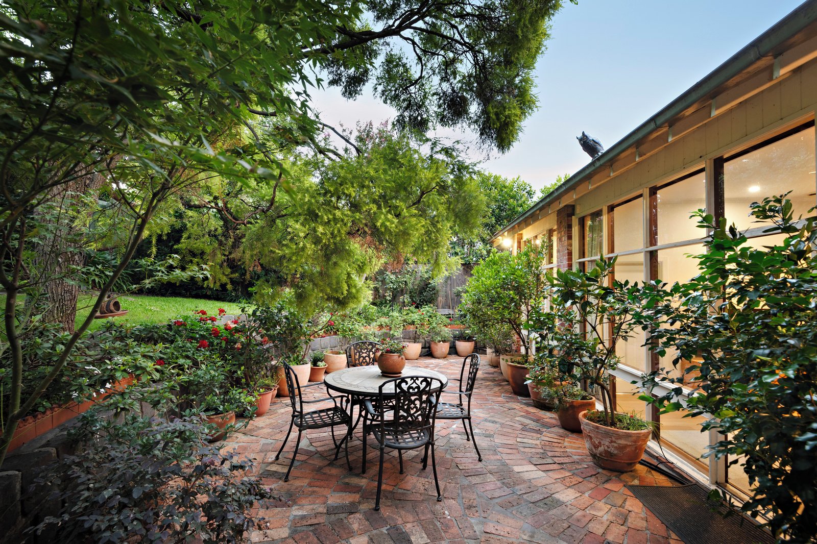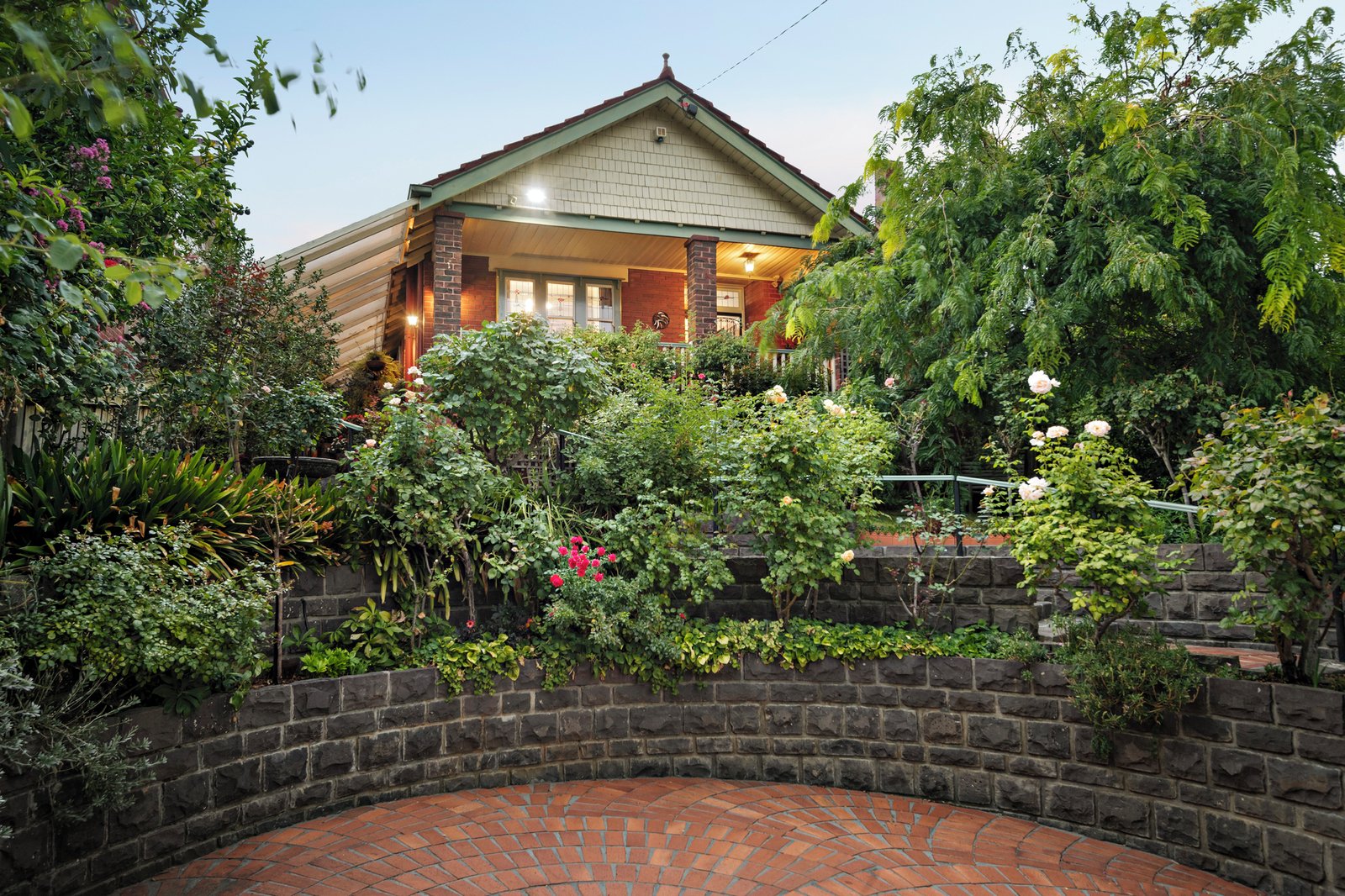 Set amidst a lush tiered garden with lawn, bluestone edging, and paved pathways, additional features include decorative ceilings, timber details, heating and cooling systems, study nook, workshop, under-house storage, and off-street parking for two vehicles.