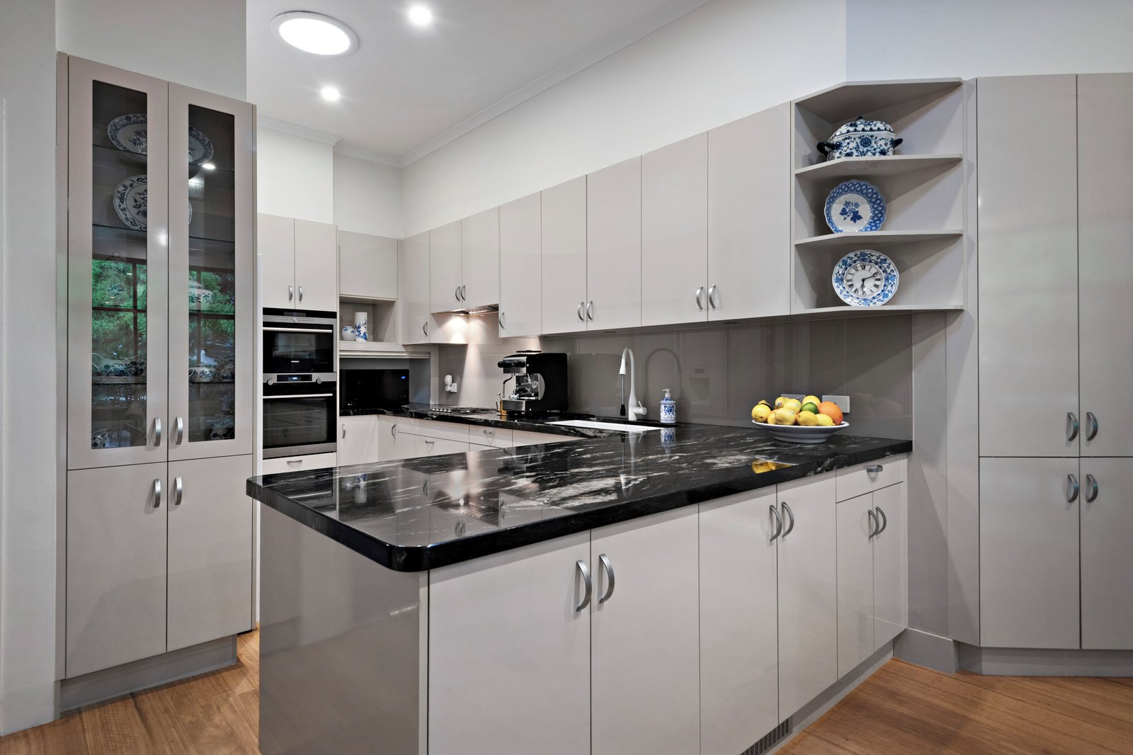 The formal lounge room, complete with an open fireplace and marble surrounds, is graced by a bay window overlooking the garden. A formal dining room flows into a superb open-plan family room with a designated dining area and direct access to the terraced rear garden—perfect for family gatherings and outdoor enjoyment. At the heart of the home, the well-appointed kitchen features granite bench tops, quality appliances, and ample cabinetry.