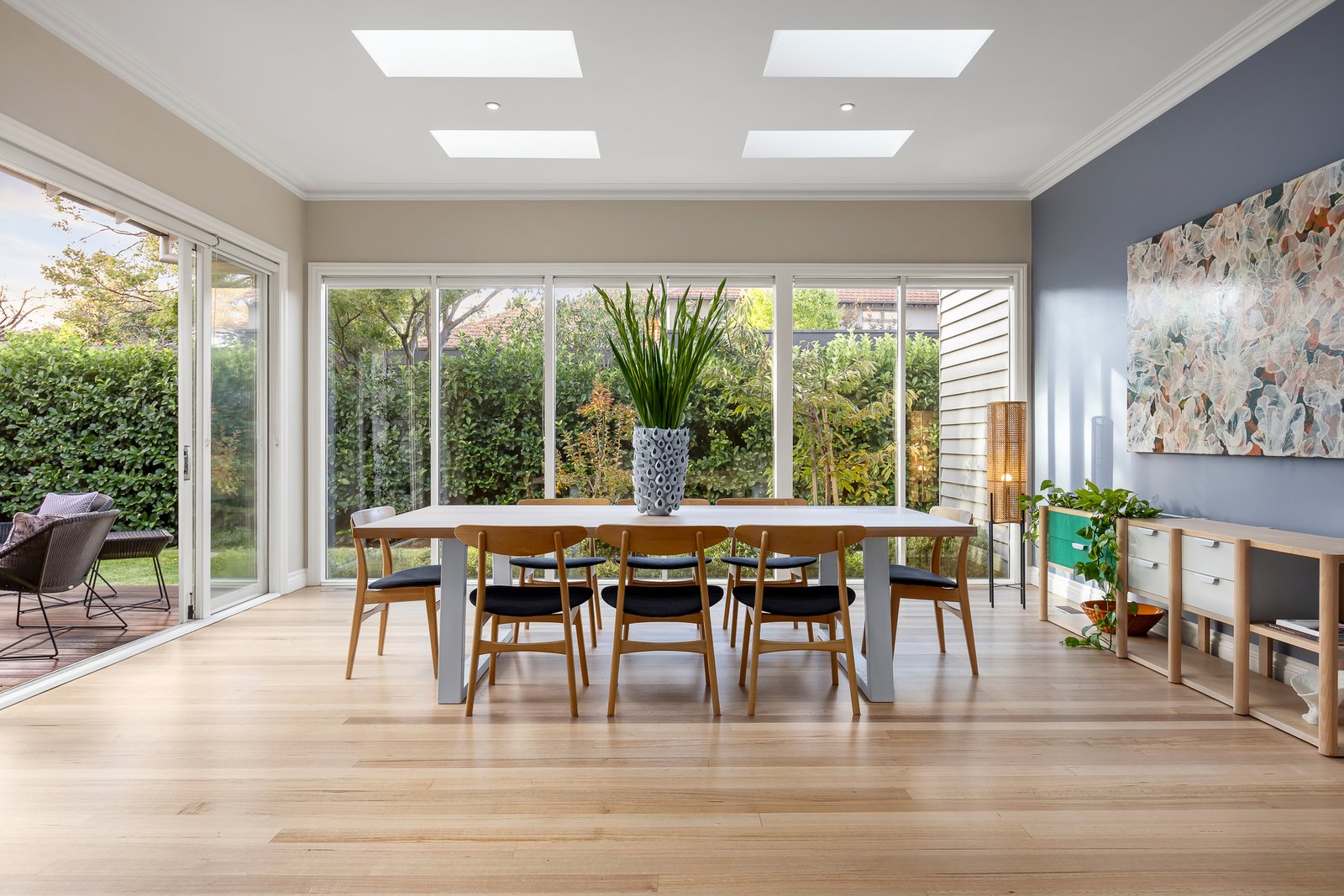 A beautiful canopy of plane trees flows along Newton Street in front of this stunning Californian with its eye-catching grey and white trimmed façade highlighting its street presence. Enhanced by a magnificent allotment with a wide frontage spanning 903sqm approx. and surrounded by landscaped gardens designed by award winning Landscape Architect, Mira Martinazzo of MUD Office; so typical of the leafy Surrey Hills residential precinct.