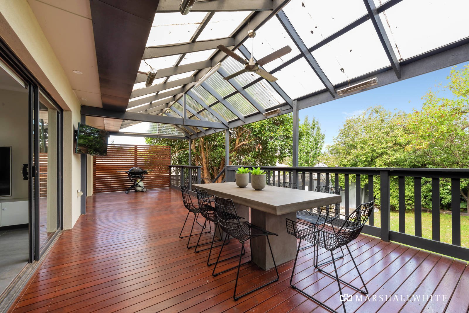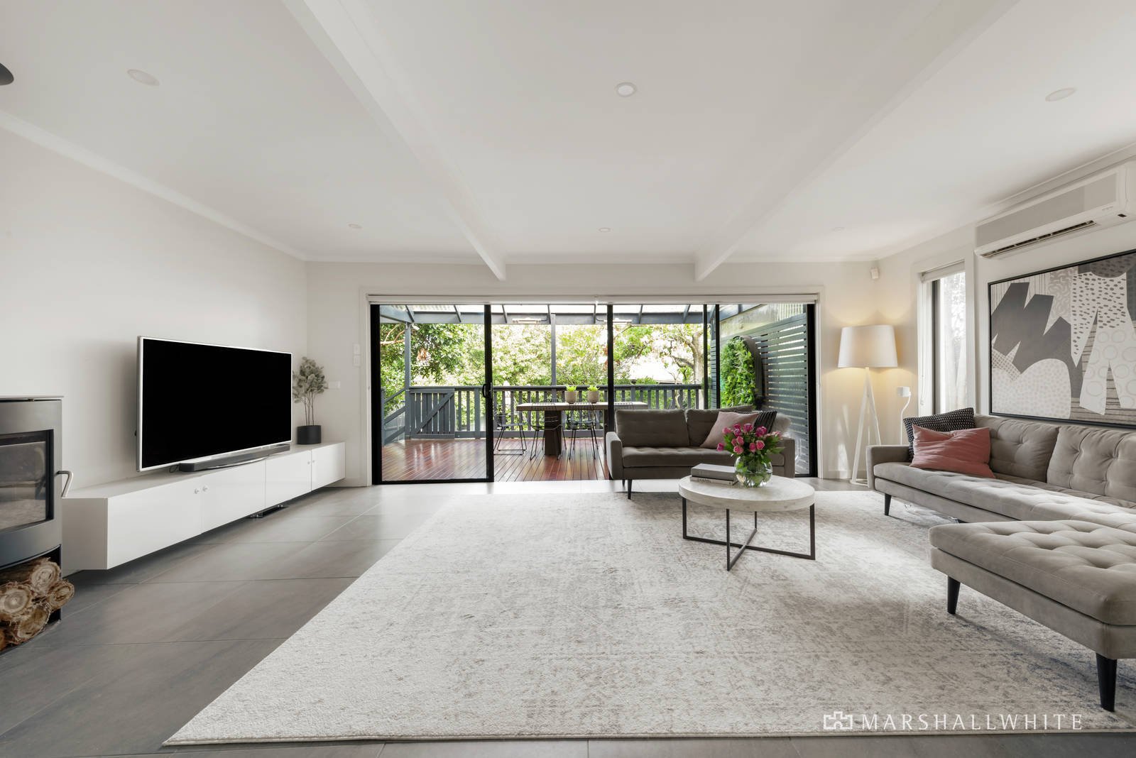 At the home's heart, a large kitchen reveals stone-topped and waterfall-edged benches to complement a Bosch oven/cooktop, all of which overlooks open-plan dining and living that is warmed by a wood fire burner. Seamlessly, the space flows outdoors through glass sliding doors to a vast undercover deck, where an outdoor TV and a ceiling fan are sure to delight proud entertainers.
